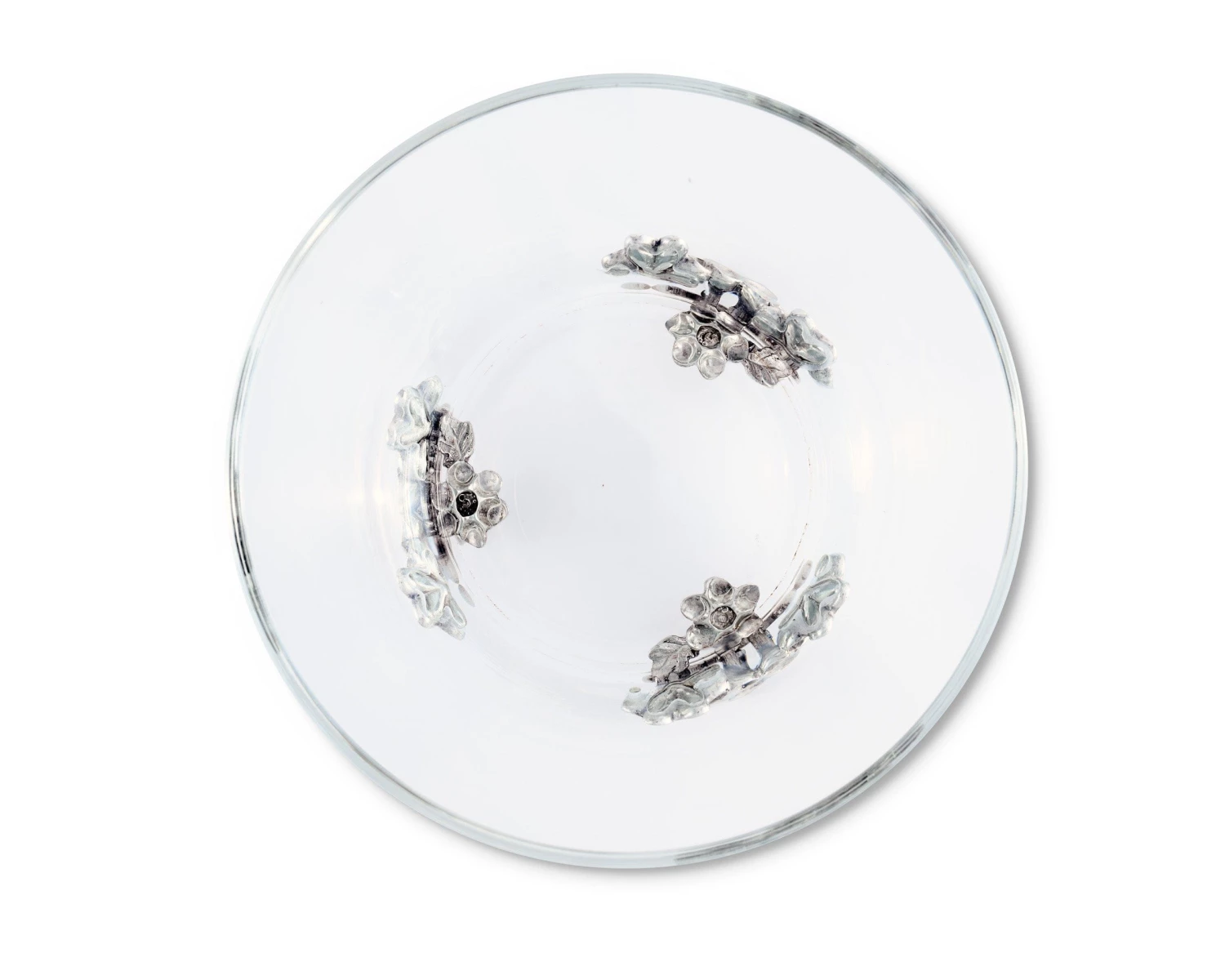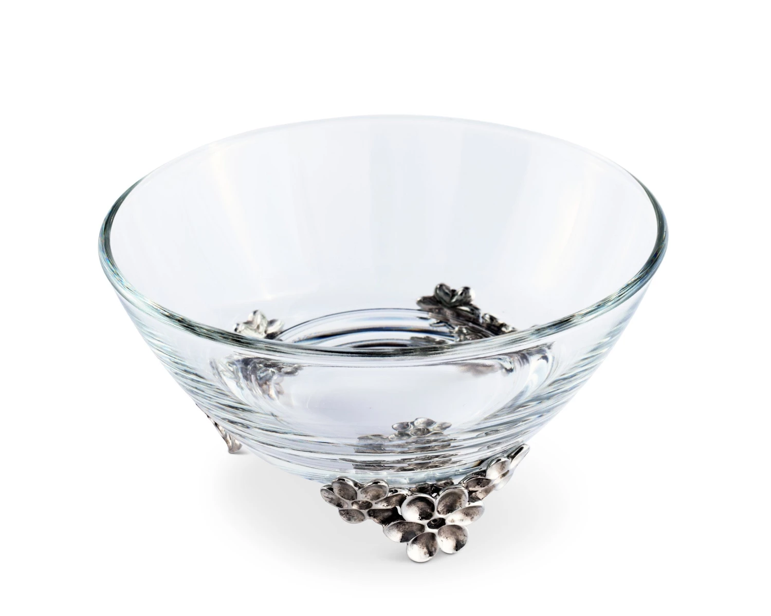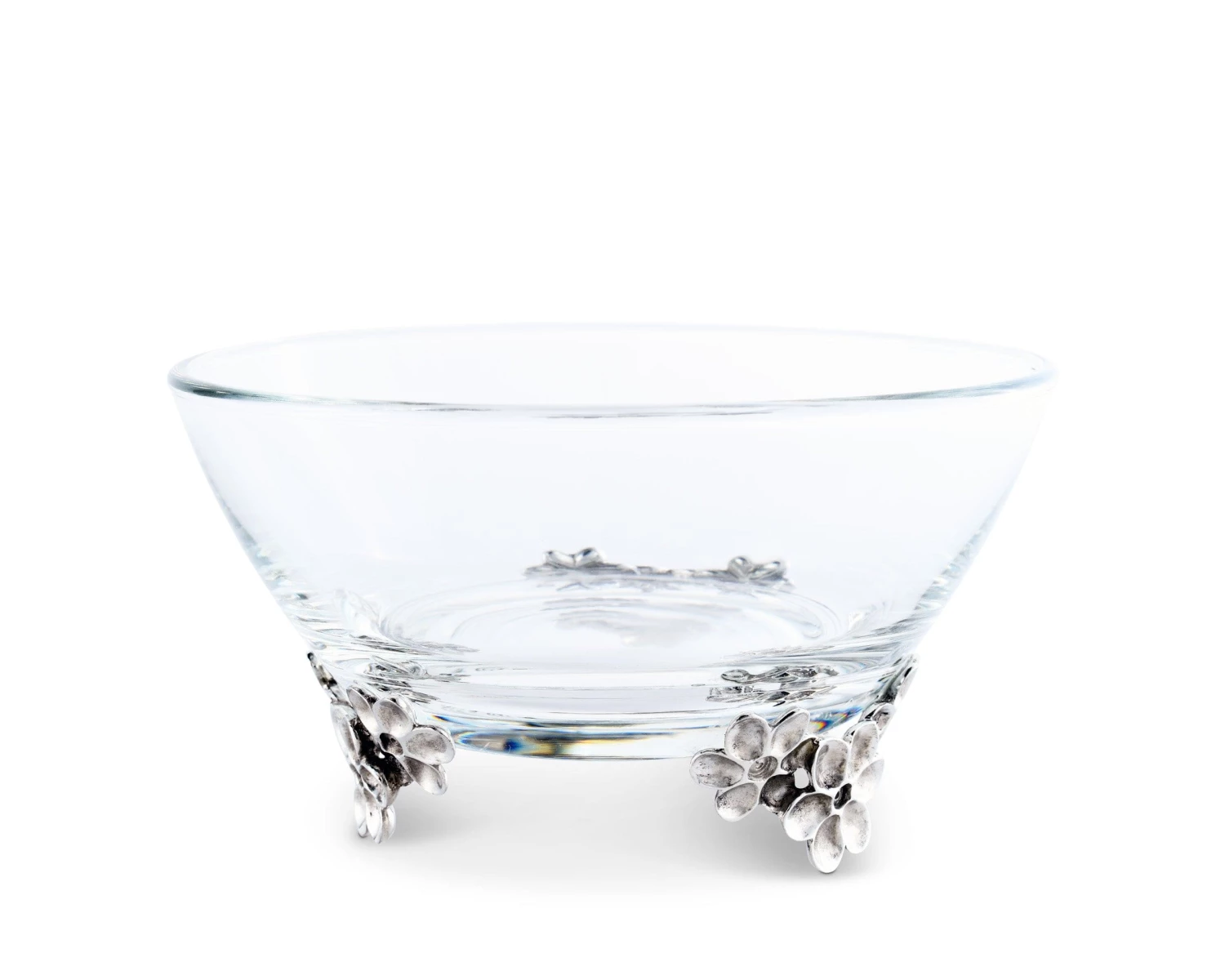 Vagabond House presents a lovely little bowl for candies or dips. A clear, substantial Italian glass bowl is supported on luxury pewter feet imagined as springtime fresh lilac blooms.