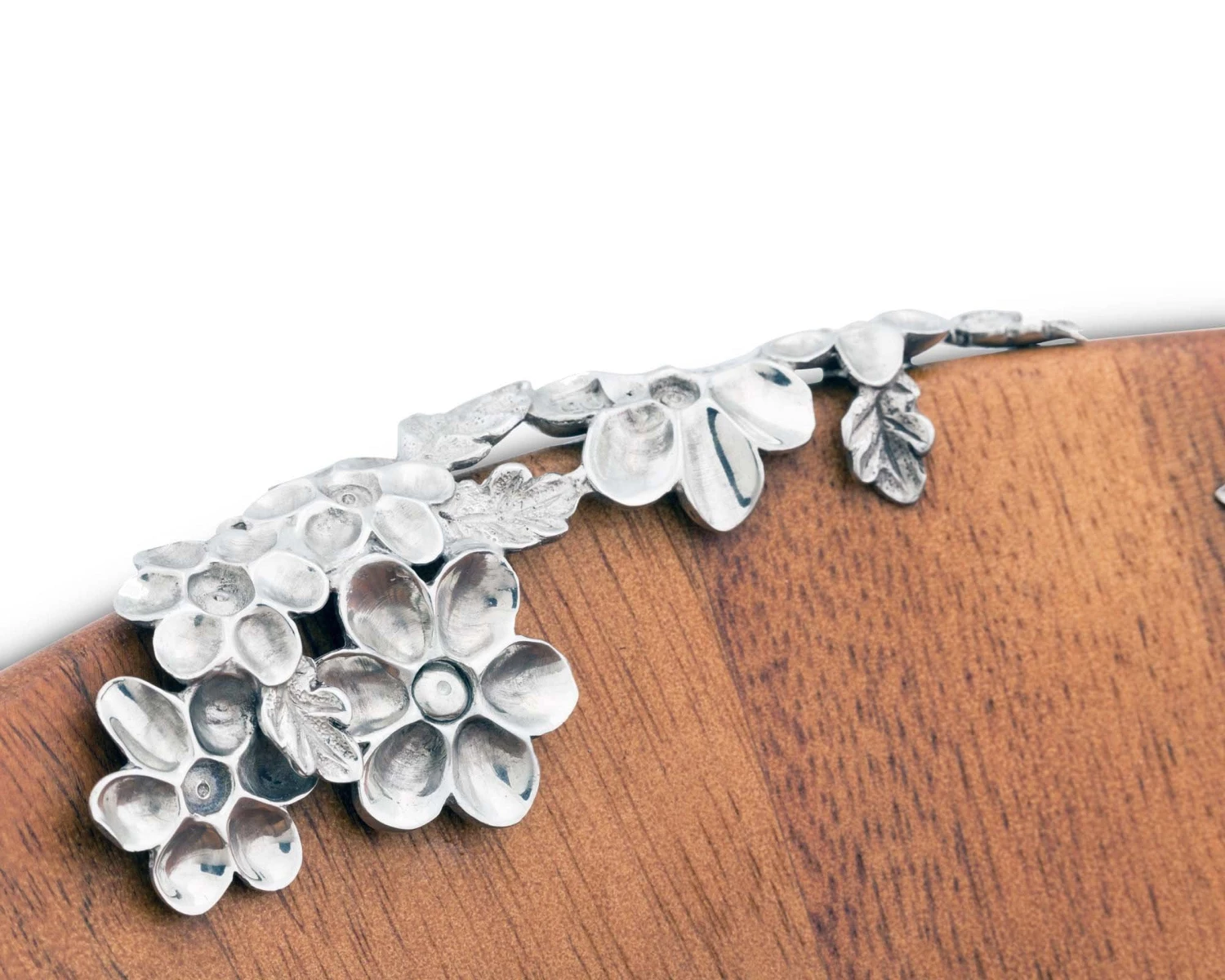 Clusters of sweet, pewter lilacs drape the bowl edges of Vagabond House’s Wok Style Wood Salad Set. Crafted in the long wearing, hard wood acacia, the wok style bowl is accompanied by two wooden salad servers. Each server, a fork and spoon style is embellished with a pewter cap of lilac blooms. The cool pewter tones of the lilacs contrast beautifully with the warm, gold chatoyancy of the acacia bowl and servers.