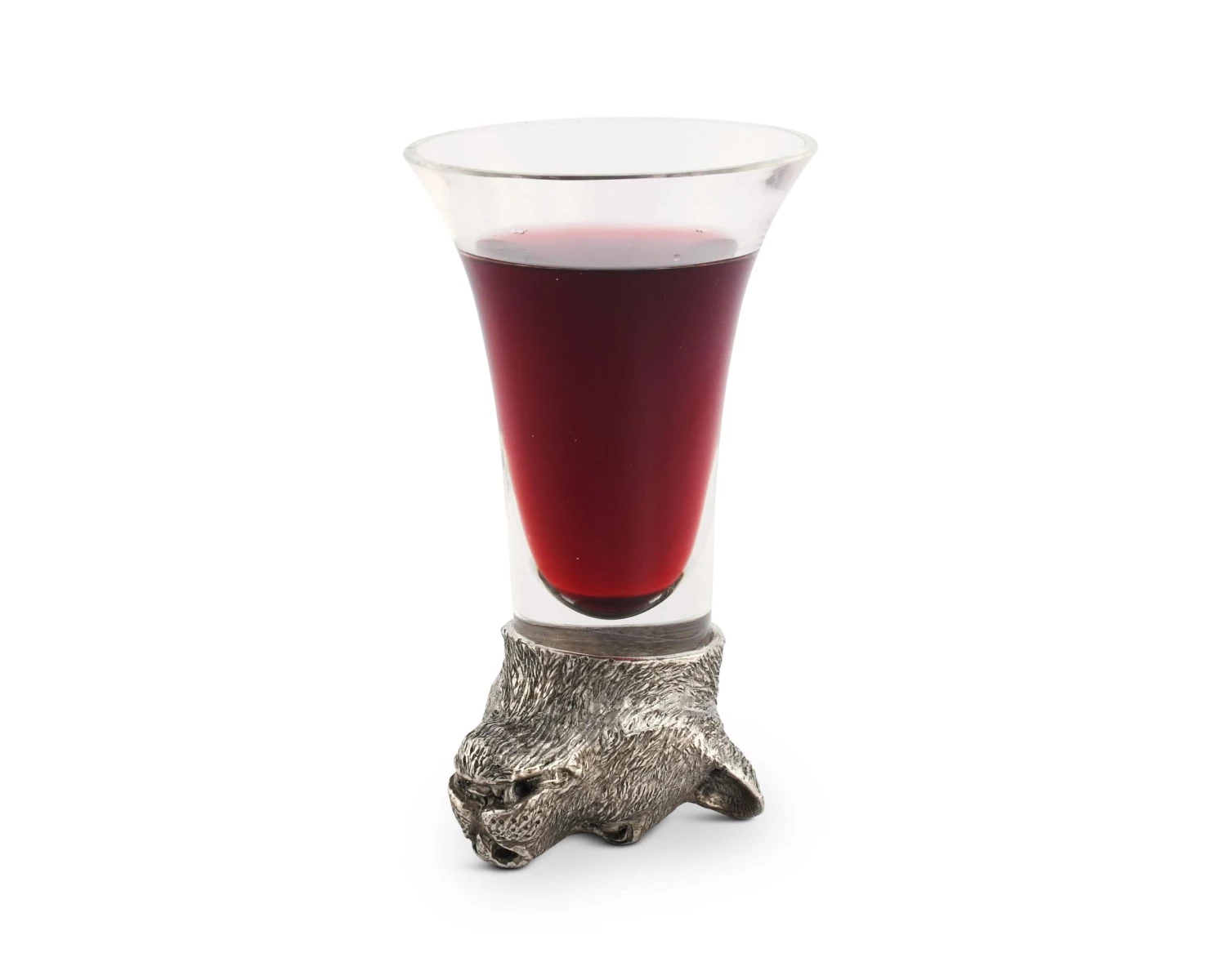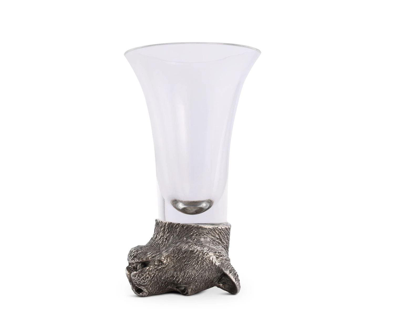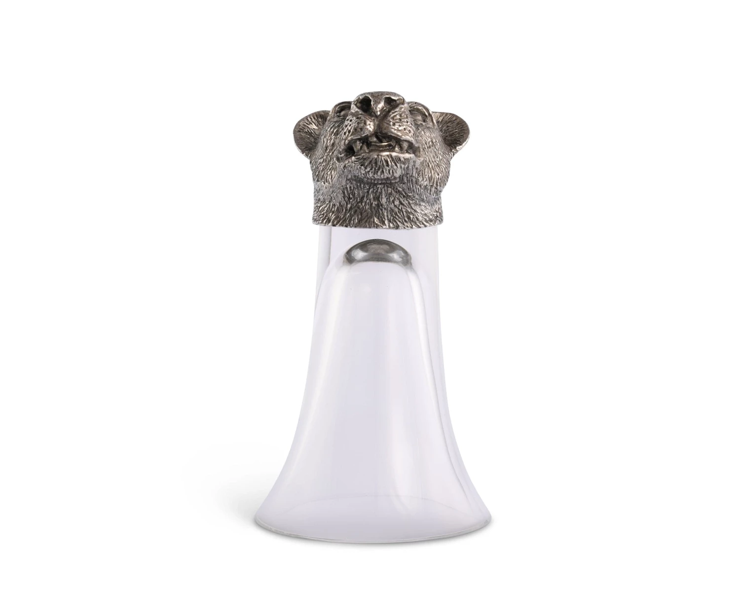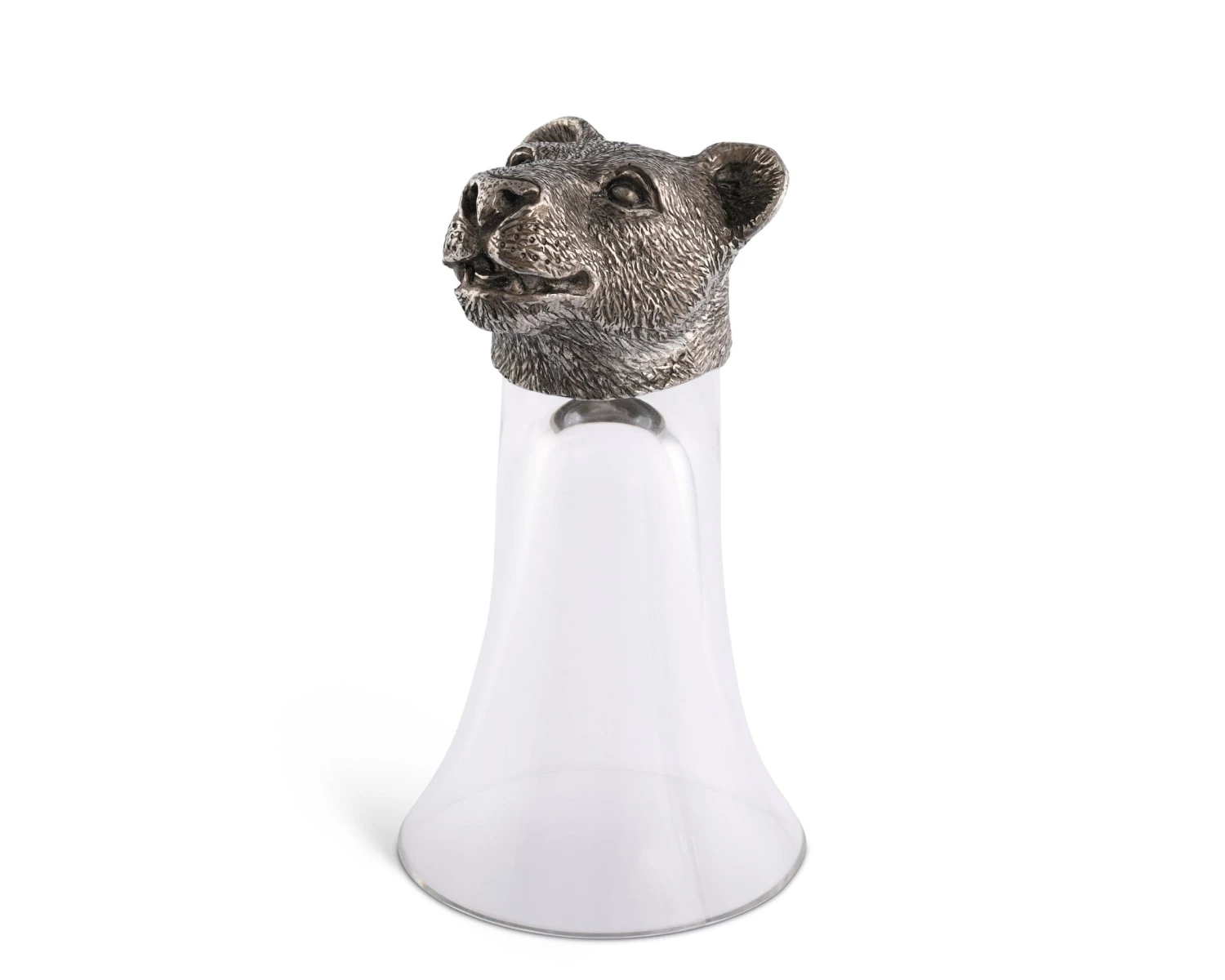 Vagabond House pewter is the secret to the rich detail on these pewter embellished clear glass stirrup cups crowned with a richly detailed figural head of an elegant lioness.