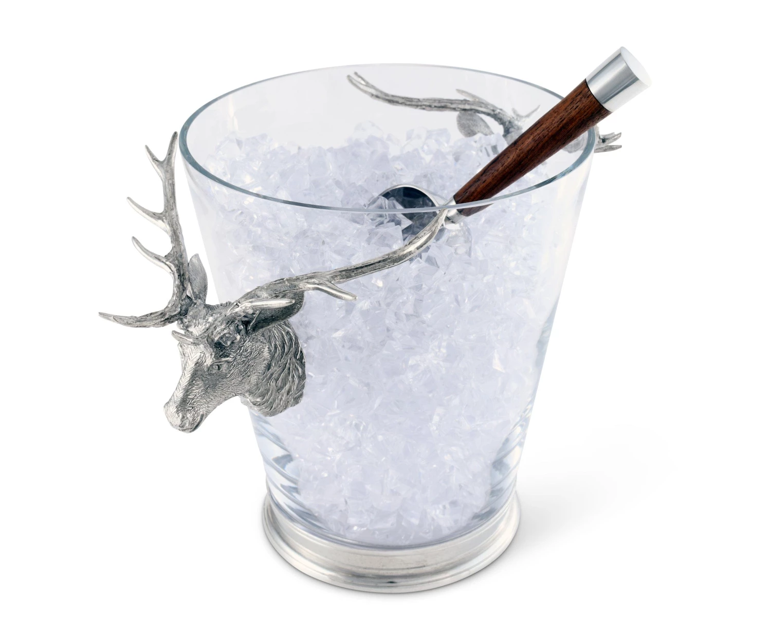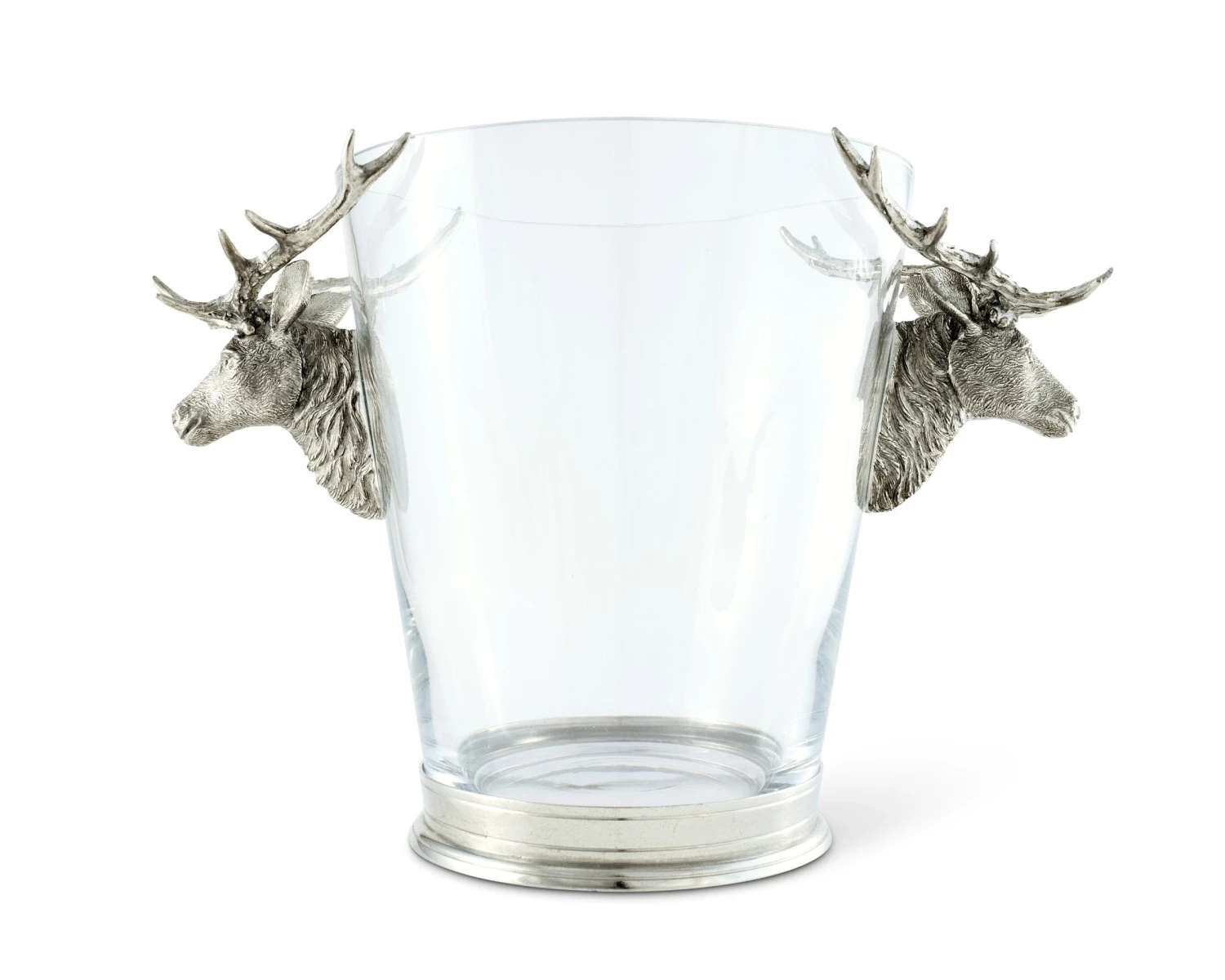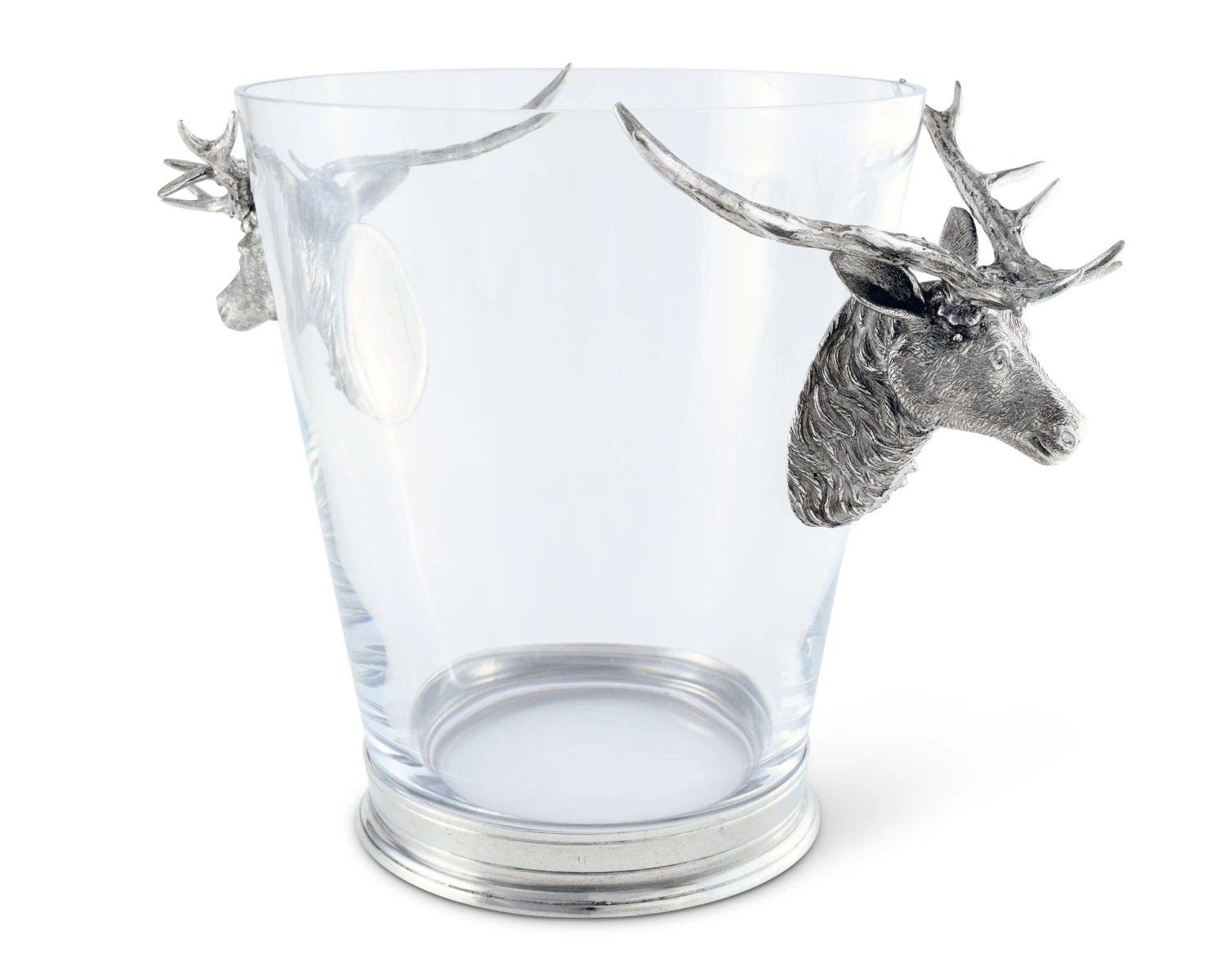 Settle in after a long day outdoors with a cold refreshment waiting for you in Vagabond House’s Deer Head Ice Bucket. Pure pewter, exquisite 3-D Deer heads, with full racks of majestic antlers become richly detailed handles for our unique, thick glass Ice bucket.