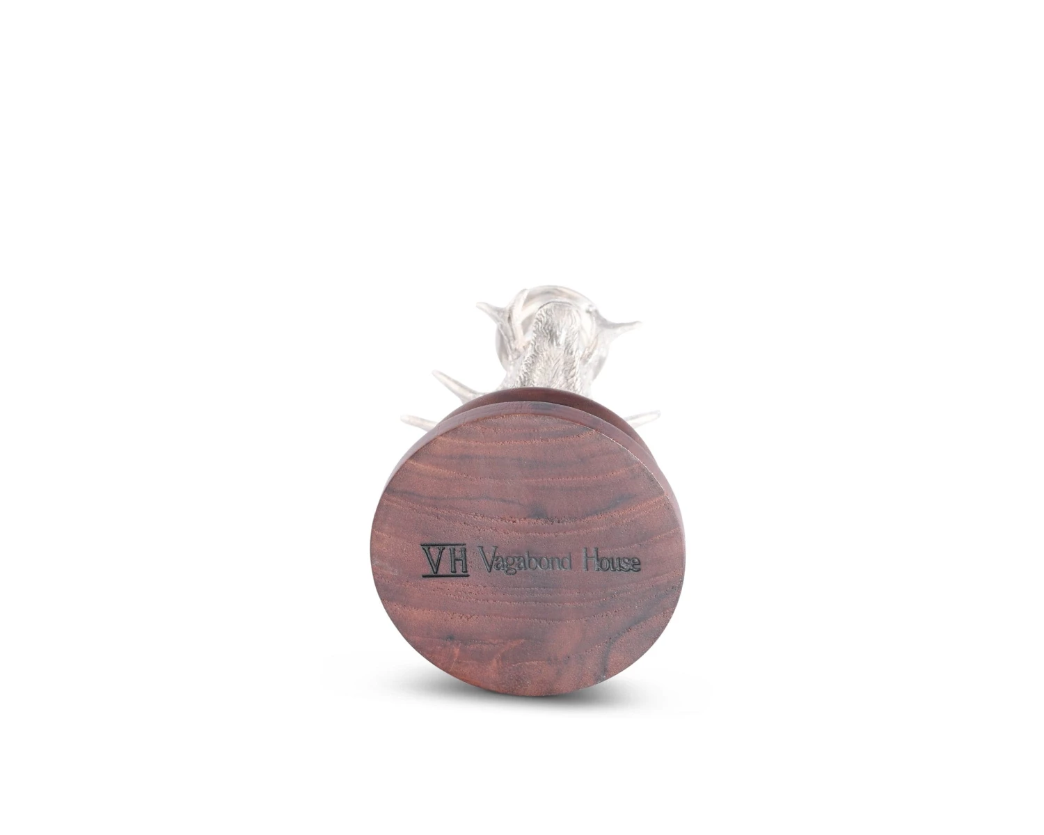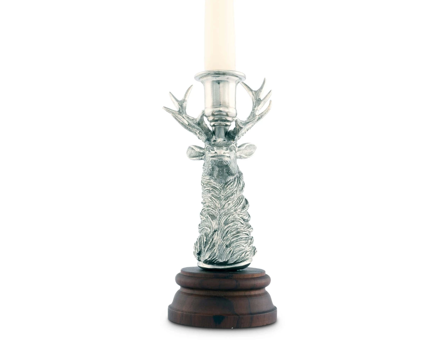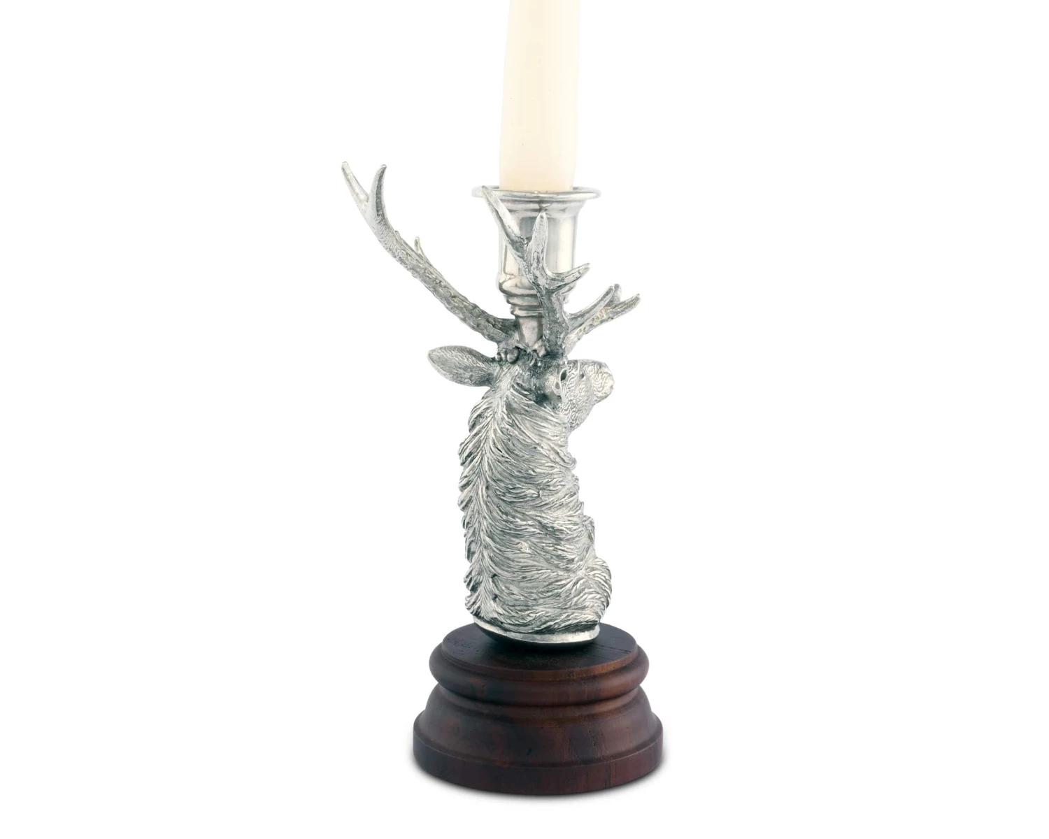 Light up your life with a touch of the wild, Vagabond House’s Pewter Elk Single Candlestick will bring to light your love of the great outdoors and the wild creatures who share it with you. A deeply detailed pewter statuette of a noble Elk, sporting a full rack of magnificent antlers acts as the body of this single taper candle stick. A dark, round acacia wood base provides stability and a pewter cup holds a taper candle. A pair of these art object candlesticks set the scene for a perfect, lodge style mantle, a single piece on a favorite small table with a few small, beloved tokens, books or gathered nature makes a big statement of your personal, traditional style.
