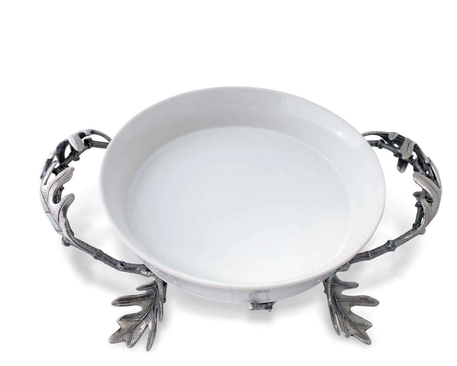 Our Acorn & Oak Leaf Casserole Server presents a uniquely detailed wreath of oak leaves formed to securely hold and present your casserole, cake or deep dish pie. The pewter holder is further embellished with tiny acorns. The removable round stoneware dish creates a perfect marriage of style and practical serving solutions, going from oven to table, heat safe to 500 f.
