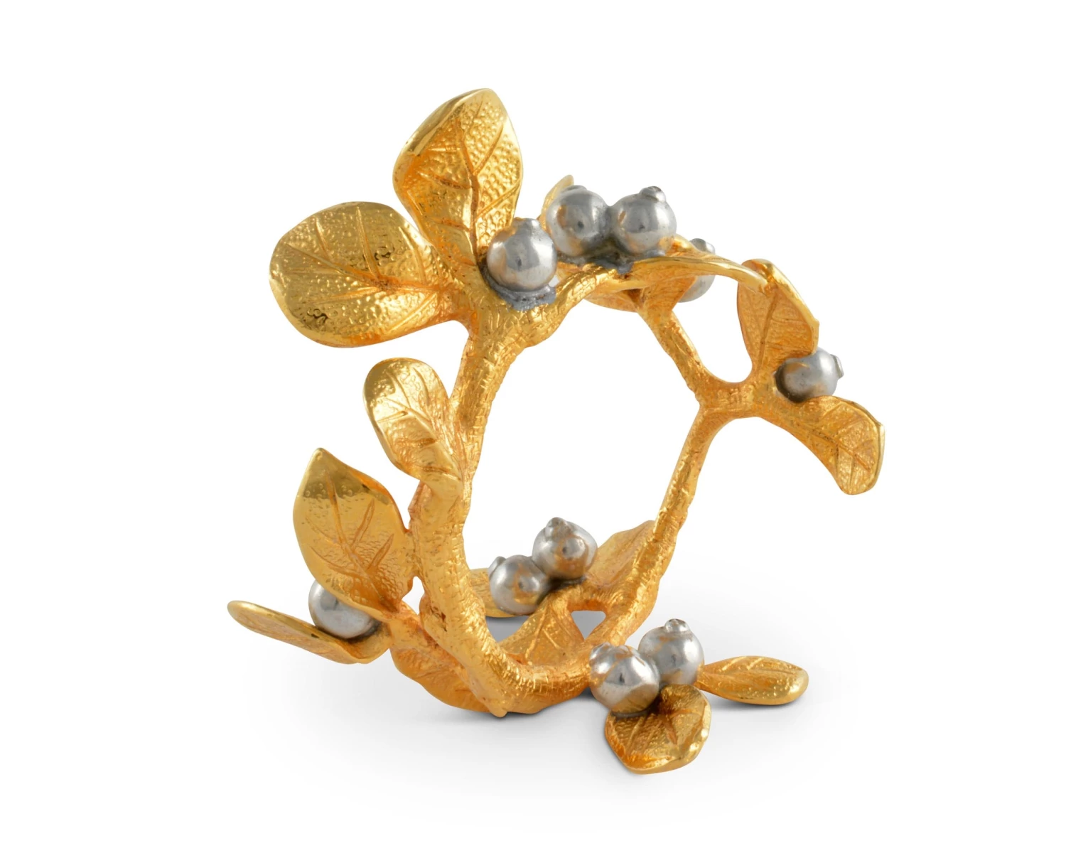 Create a cheerful mood with this charming pewter napkin rings that features a wreathed gold leaves with shining silver berries crafted with intricate details. Add a unique accent to your rustic table decorations. Exclusively designed by Vagabond House.