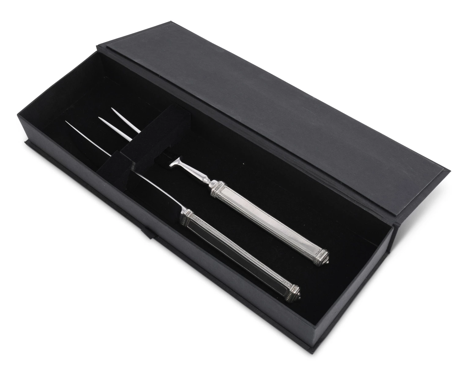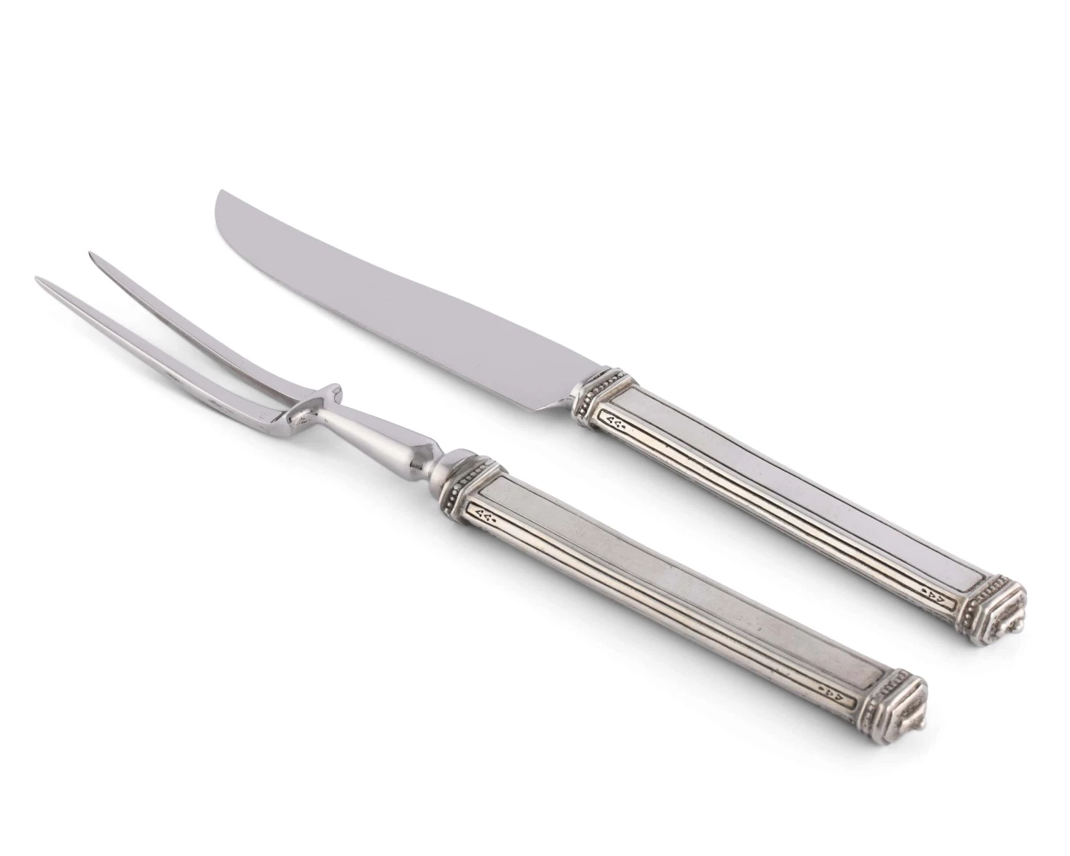 The blocky grips contrast beautifully with each piece’s sleek, stainless steel head. Rely on the classic design and elegance of Vagabond House’s Leaf Carving Set to serve your entertainment needs.