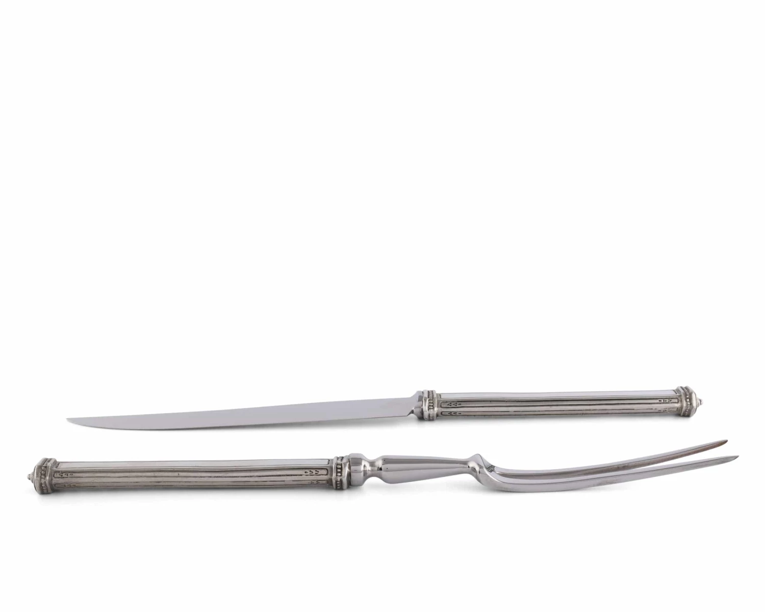 Crafted in luxury-grade pewter, the handles feature column-style markings, beady decorations and leaf-patterned engravings.