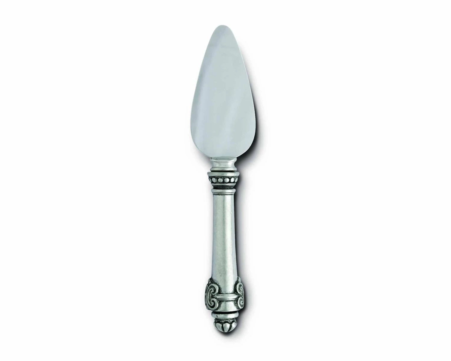 This Vagabond House cheese triangle depicts the noble lifestyle of the Medici family within its traditional design. Reminiscent of a fleur-de-lis symbol, elegant flourishes adorn the end cap and both sides of the handle, while beaded patterns surround a guard just below the piece’s neck. Exquisitely detailed in pewter, the handle provides a sturdy base for the stainless steel head.