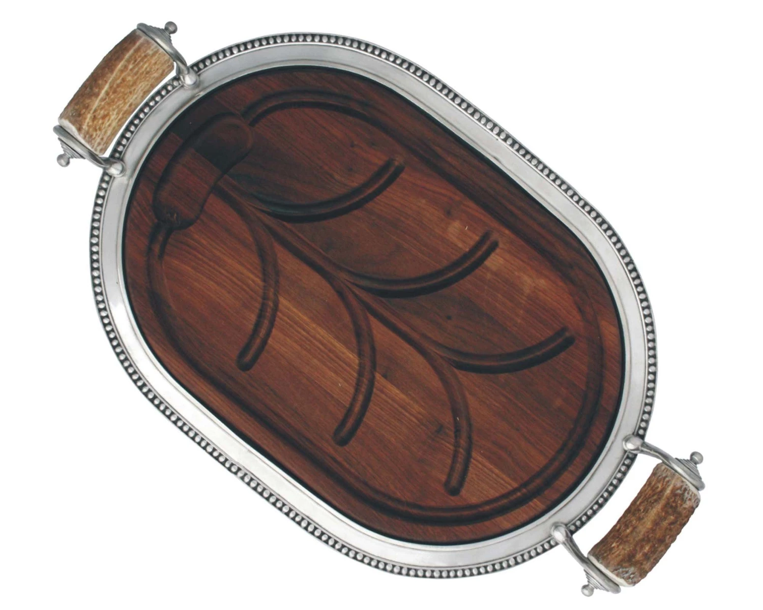 Astound your guests with pleasure when you present a perfectly roasted large fowl or roast of meat on one of our magnificent wood carving boards. Each board is regally rimmed in our artfully elegant Medici Bead Pattern. Finished with our truly unique and exceptionally sturdy antler wrapped handles, the board features a perimeter well and carved trenches for juice collection.