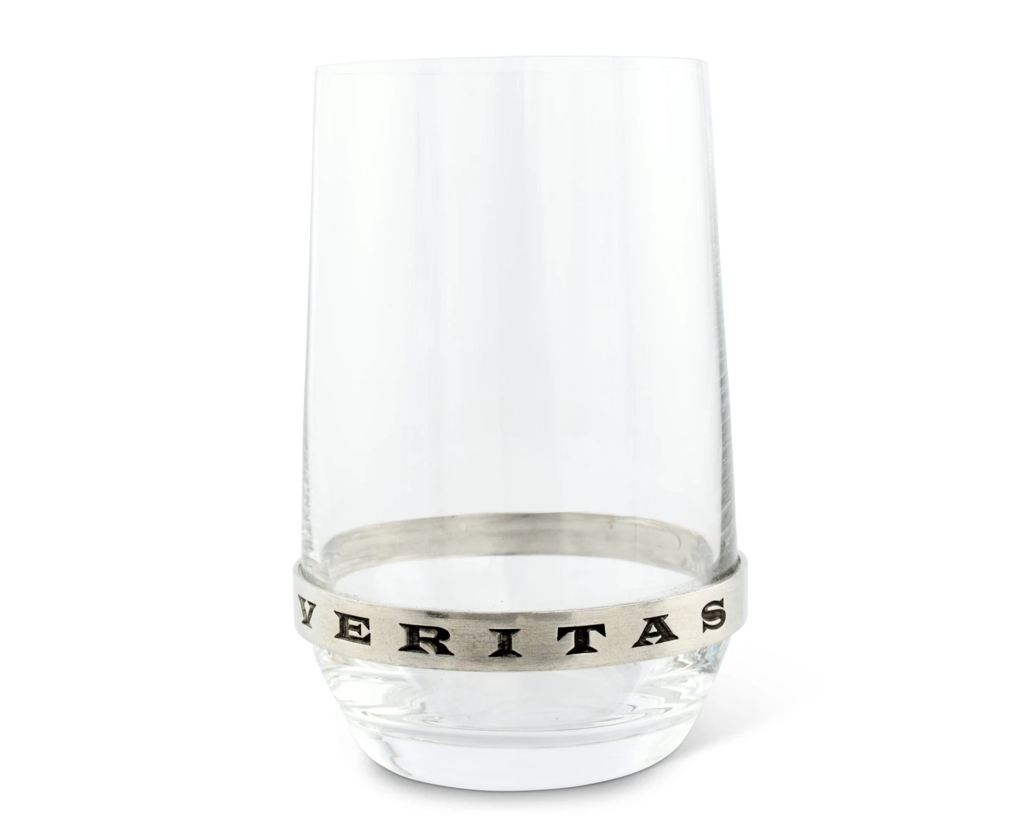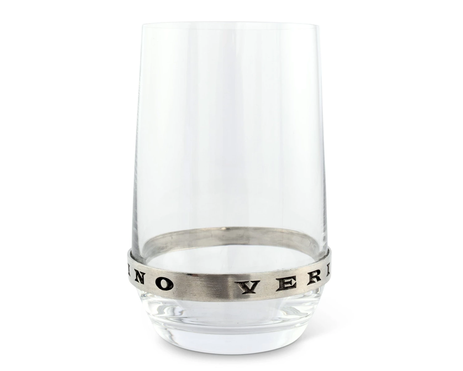 IN VINO VERITAS the Latin homily translating as “In wine, there is truth.” is inscribed on a polished pewter band encircling our crystal clear Stemless White Wine glass. Designed specifically to enhance the white wine experience, the pewter band with the Latin phrase adds old world charm to modern, casual and fun wine service.
