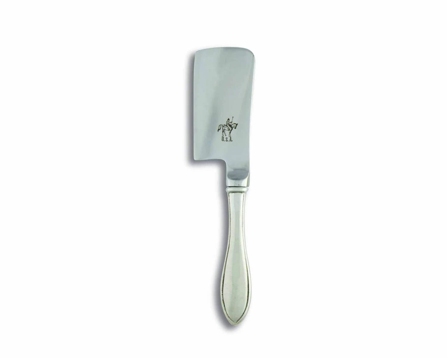 Striking and simple, Vagabond House’s Wales Cheese Cleaver offers functional elegance to your formal dining experience. Crafted in luxury-grade pewter, the handle features a banded grip, which curves into a rounded point at the end. A sleek, stainless steel blade gives this piece a sophisticated finish.