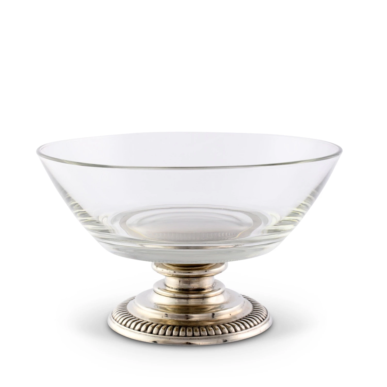 Inspired by shapes and decorative motifs of the Italian Renaissance, our clear glass Medici Footed Serving Bowl stands on a tiered base of luxury pewter embellished with a classical gadroon pattern. Blending the classic design with a modern glass bowl adds old world charm to contemporary service. Perfect for serving special dishes that stand out in the bounty of your table.
