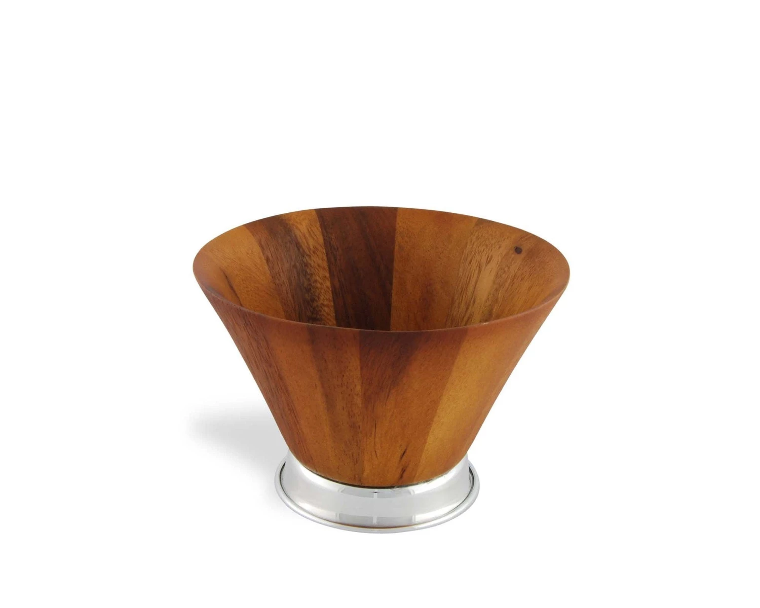 Dramatic burled acacia single serve salad bowl, in a modern cone design, tapers to a Vagabond House highly polished pewter base. The elegant, clean design of the bowl showcases our belief that function and form are equally important in t busy, modern lifestyles.