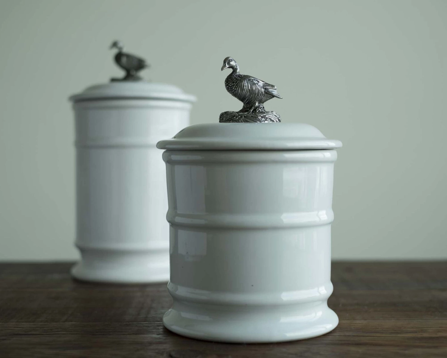 An intricately detailed pewter figural of Mama Mallard on her nest adds sporting style to our Duck Stoneware Canisters. The beautiful finial tops fine stoneware canisters, double hand-glazed to a luminous, creamy white finish. Available in 2 sizes.