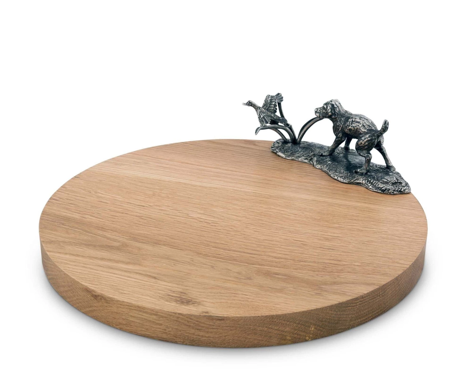 Oak cheese board accented with superbly detailed figural pewter Labrador and Duck embellishment, honors the companions and the quest of sport and dog lovers around the world.