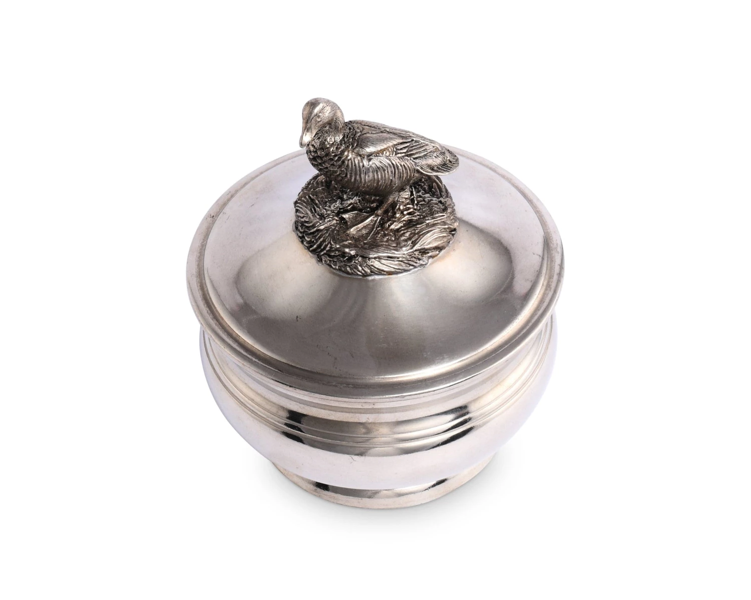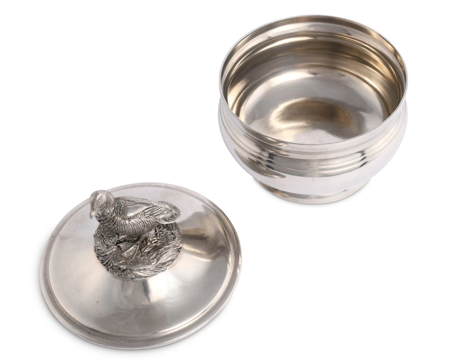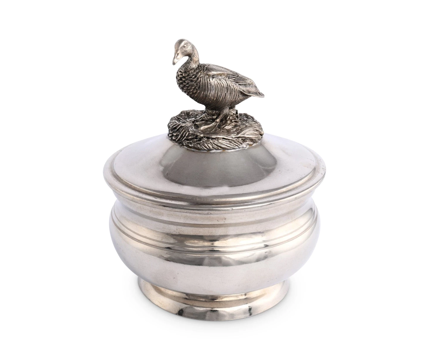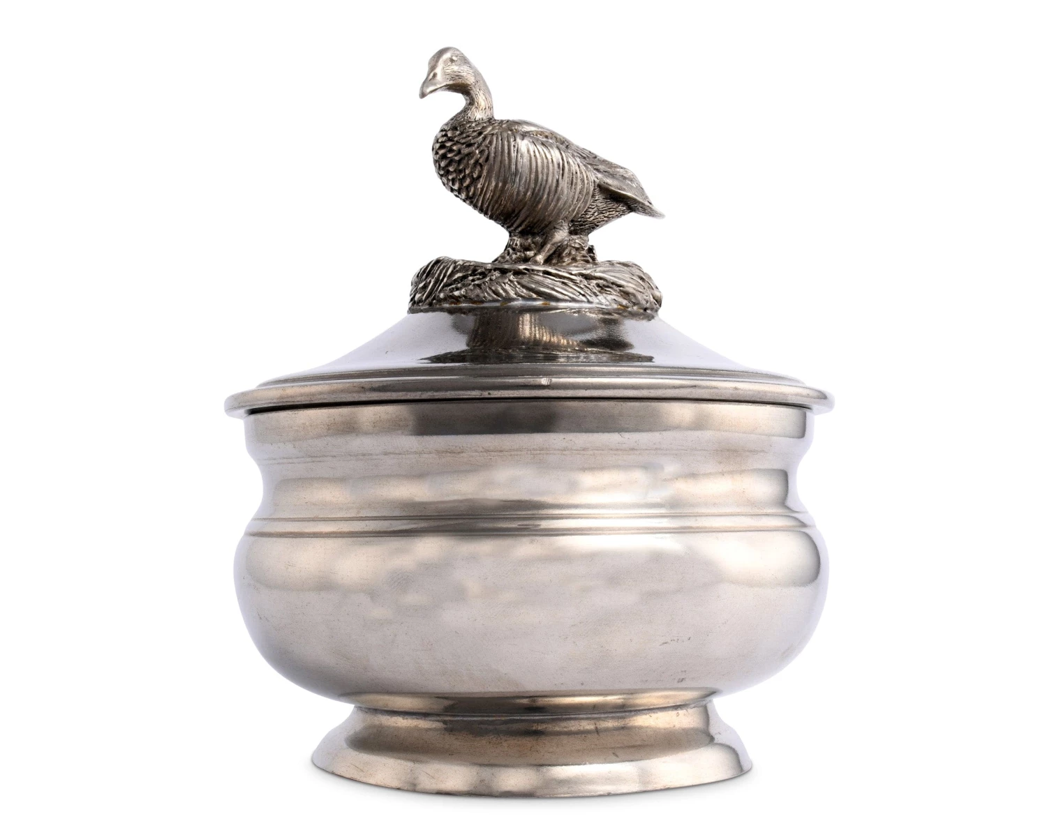 Inspired by unique metal sauce bowls used on formal tables during the colonial era, our covered sauce bowls are elegant in both function and form. Our round bowl is cast and hand-finished with a polished sheen. A finial of an exquisitely detailed female mallard stands atop her nest on the lid adding unique Vagabond House style as a figural handle. The bowl is sparely tooled in classic style cast with a slight indent curve near the top and a round stacked ring base. The cover ensures that your sauce will stay fresh and the conductive properties of pewter ensure that a cool sauce will be cool and a warm one will stay warm for your entire meal.