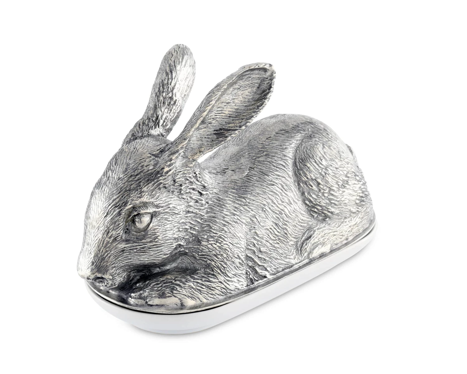 The rabbit rests upon a butter plate crafted of lustrous, white stoneware.