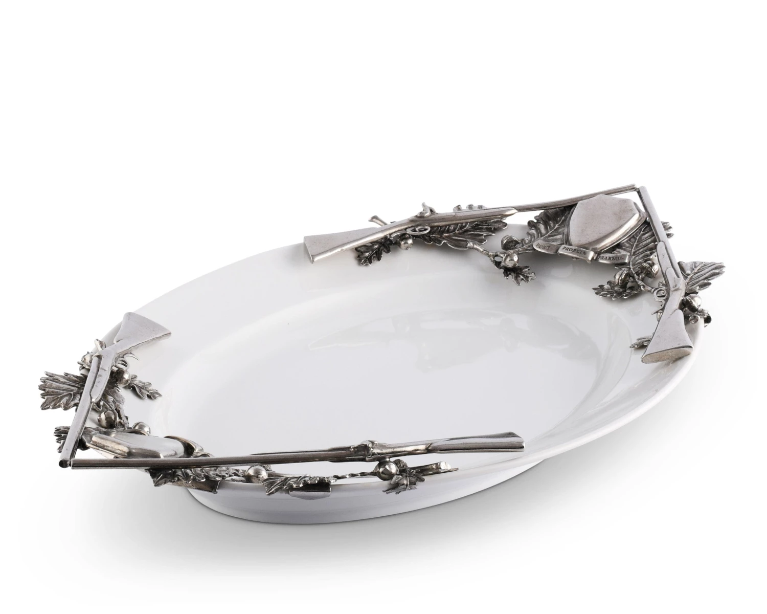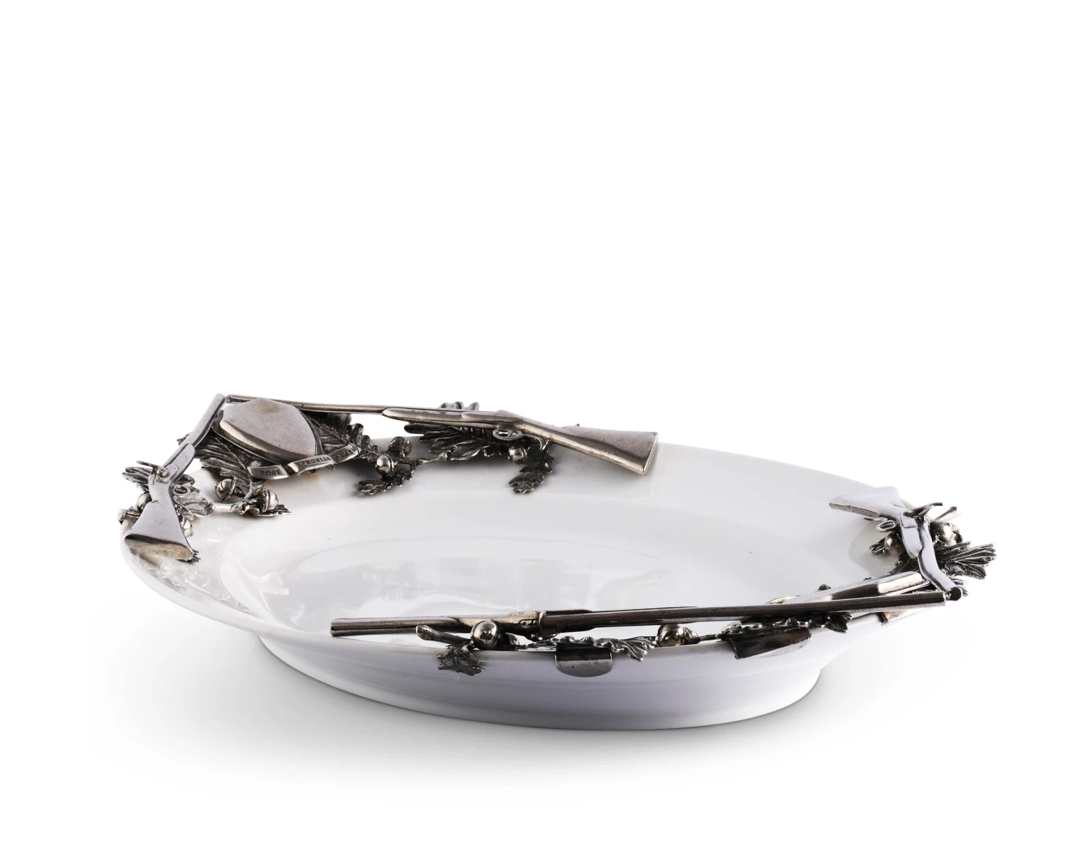 A detailed cast and hand-finished pewter figural hunting still life adorns each end, forming the handles of our lustrous oval stoneware tray.