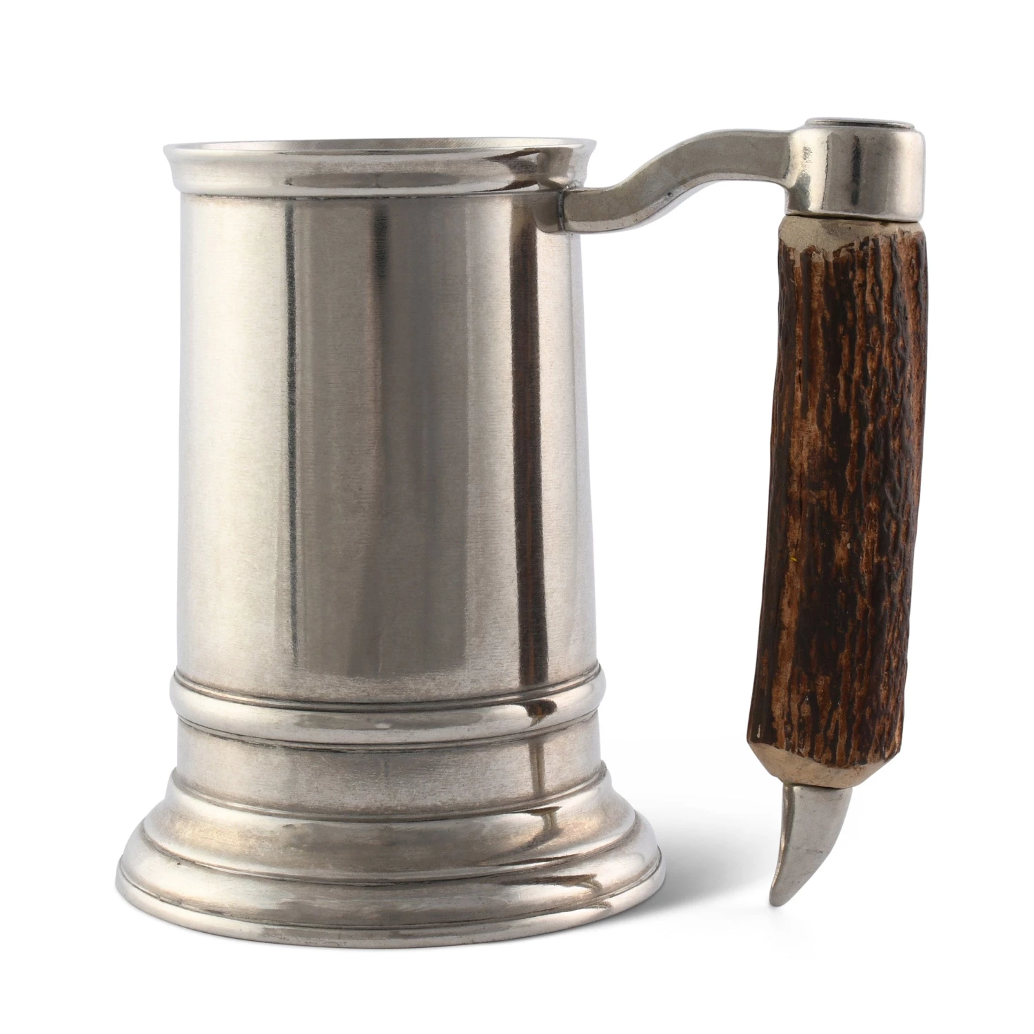 In keeping with the Vagabond House mission to preserve tradition and style in artisan hollow ware, our classic tankard mirrors the work of 18th Century master metal crafters in Sheffield, England. Cast in a classic cylindrical shape with a larger bottom, the mug sports ring tooling and a satin finish. The uniquely Vagabond House Hand-Crafted Faux Antler handle is finished with a pewter end-cap.