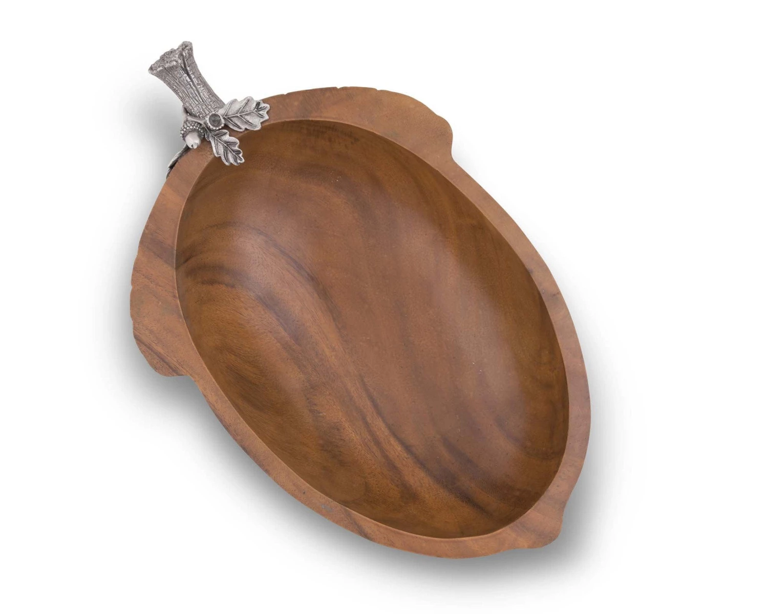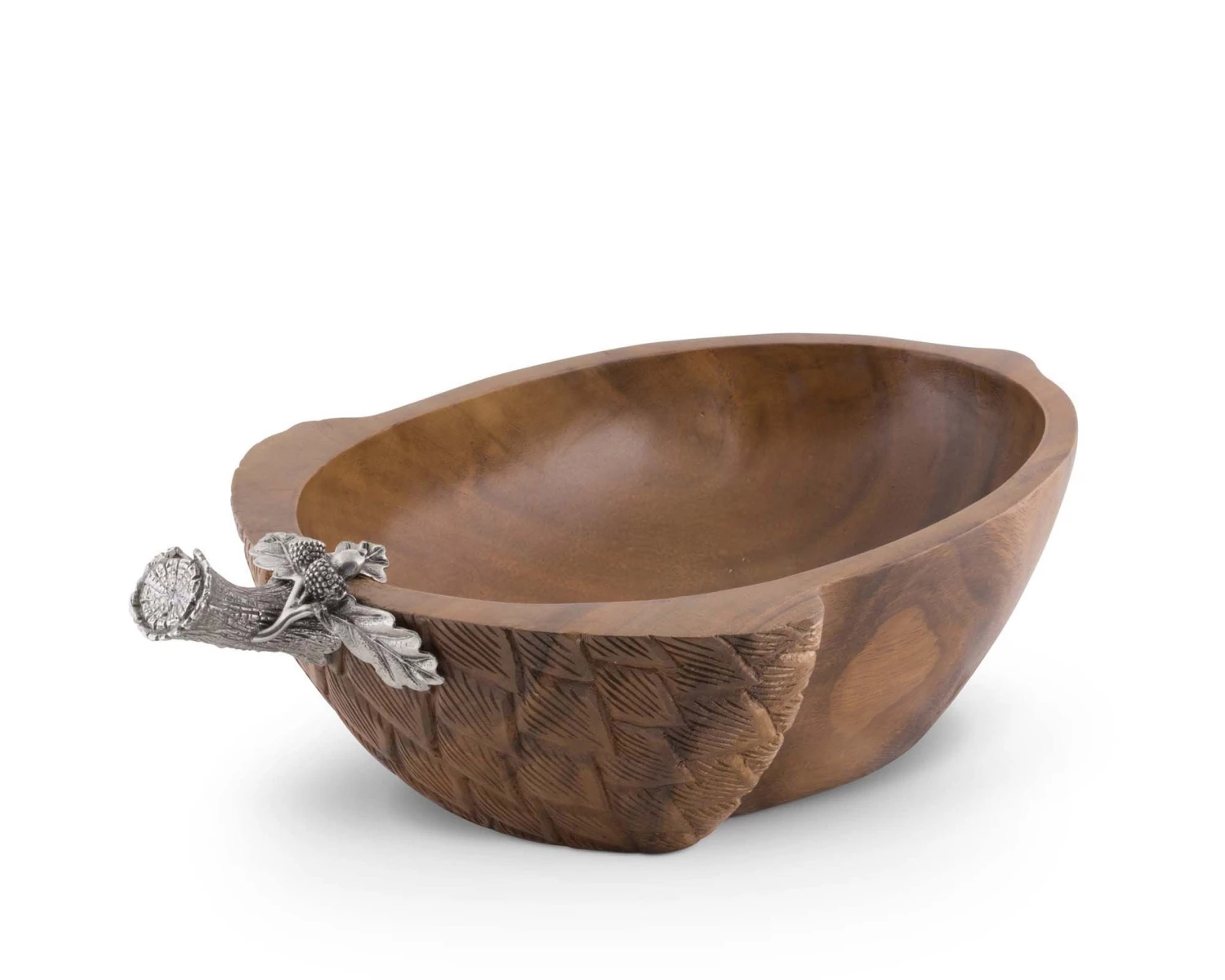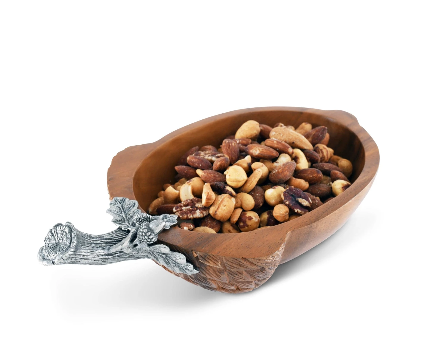 Artfully turned with hand carving our Rustic Acorn Nut Bowl is shaped like an acorn from lustrous acacia wood. The natural color variations of the wood bring warmth and color wherever they are displayed. Each bowl is finished with a luxury pewter detail, a handle depicting the acorn stem with a small spray of a tiny acorn and leaves. Choose from two sizes: