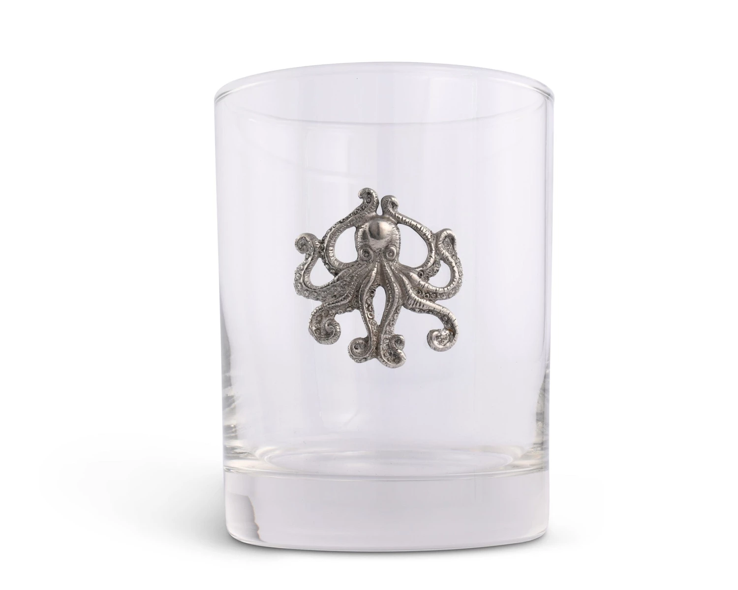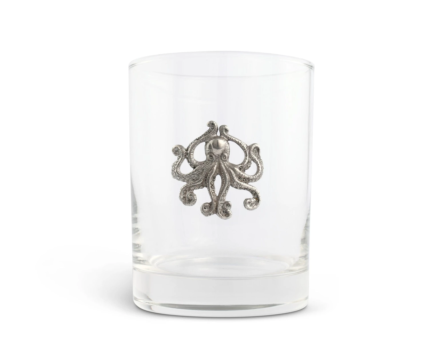The Vagabond House Octopus is a mighty sea creature akin to the mythic Kraken. The pure pewter Octopus medallion on these classic double old-fashioned glasses is so detailed you will be amazed when you hold the heavy, clear glass in your hand and take a long look. These glasses are perfect for any seafaring themed bar or for your next Iron Throne gathering.