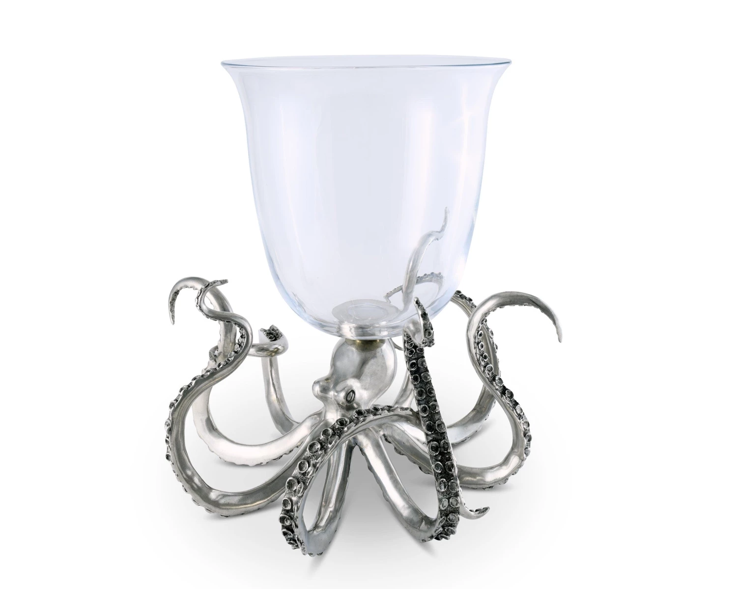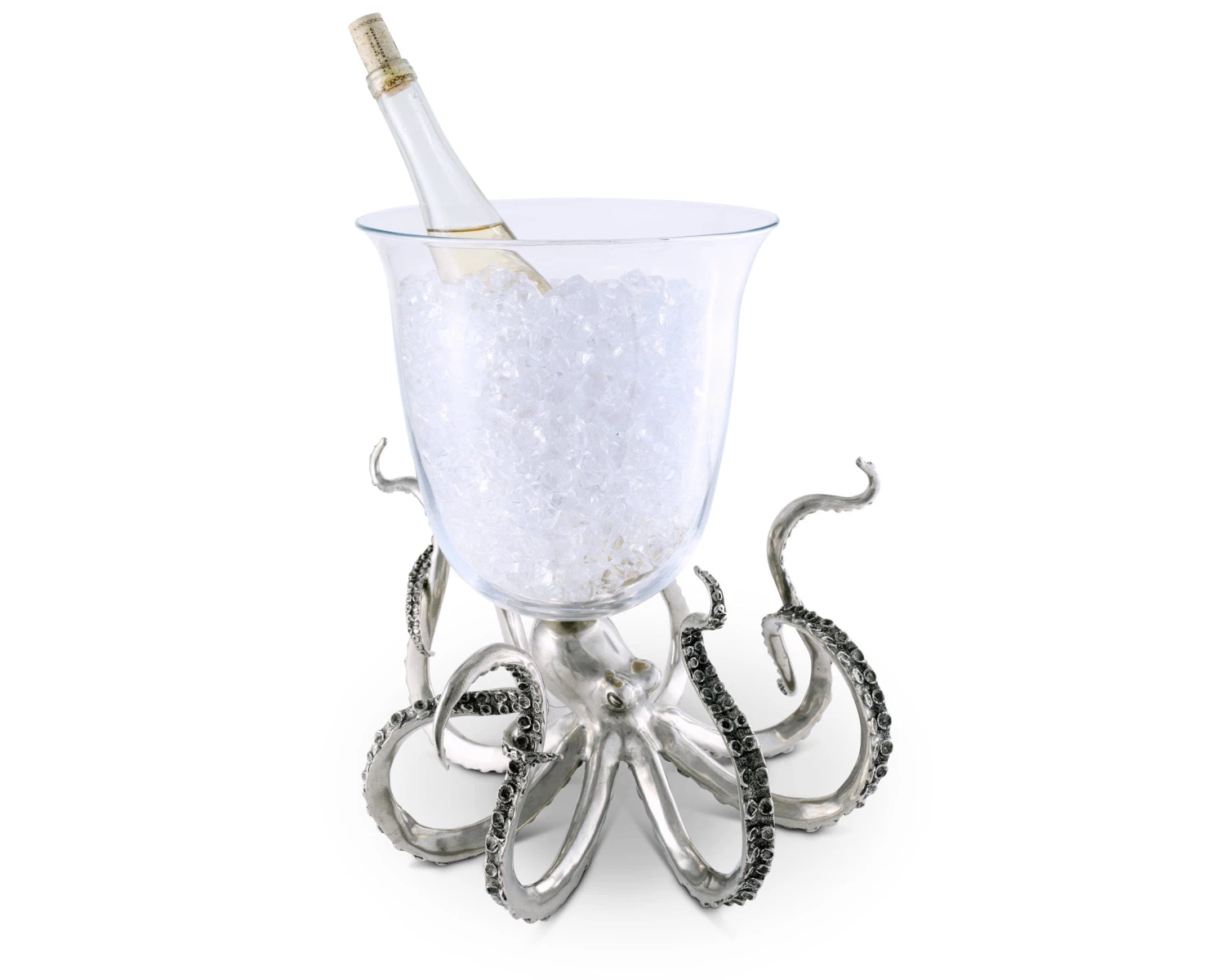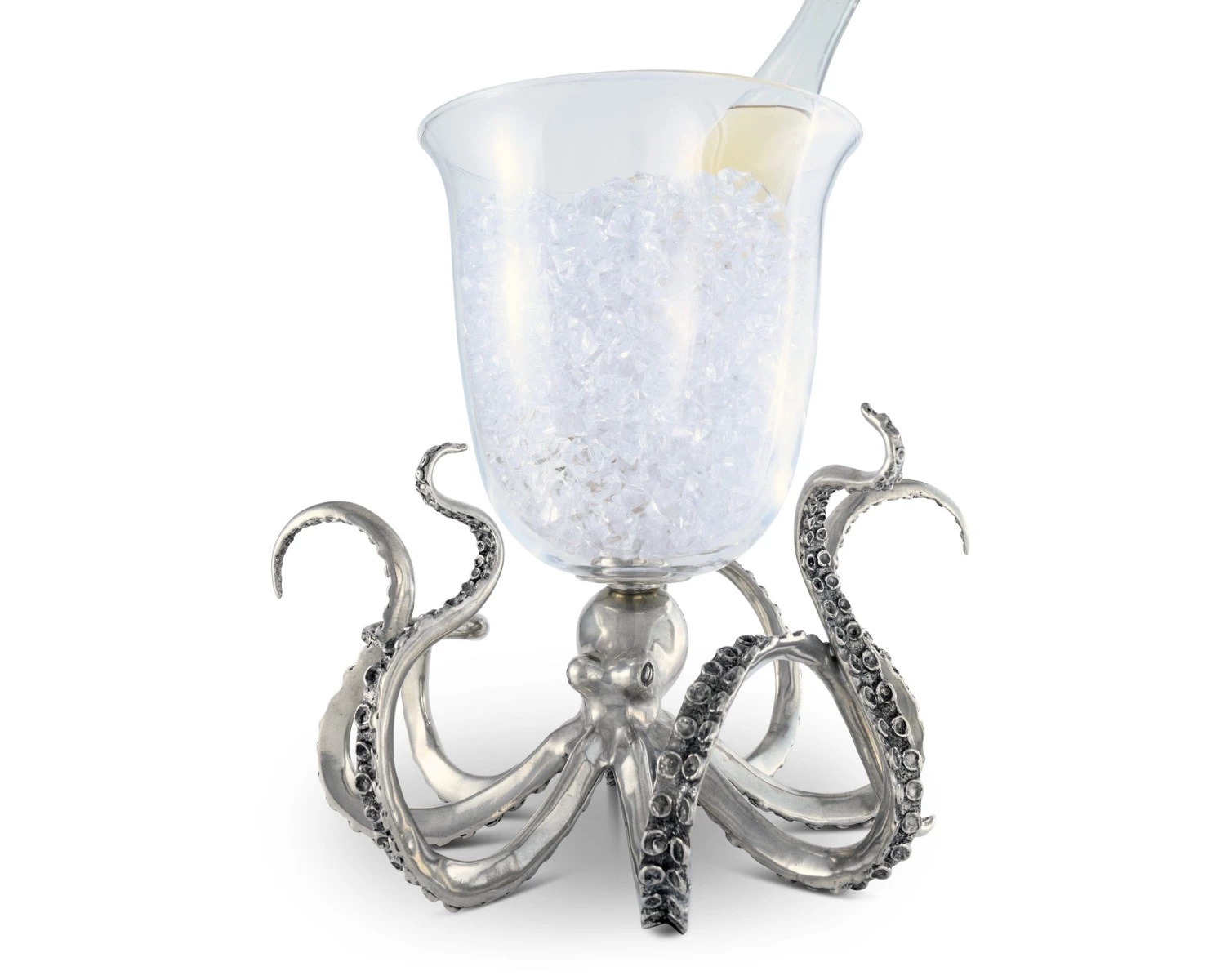 Balancing a uniquely shaped, thick glass, tulip shaped bucked on its head, with support from its writhing tentacles, our signature Vagabond House, pure pewter Octopus presents an ice bucket that is exquisitely luxurious for your special occasions. Crafted with exquisite detail and in the spirit of our mission to capture the essence of marine life in pure pewter, every detail on our octopus is perfectly realistic.