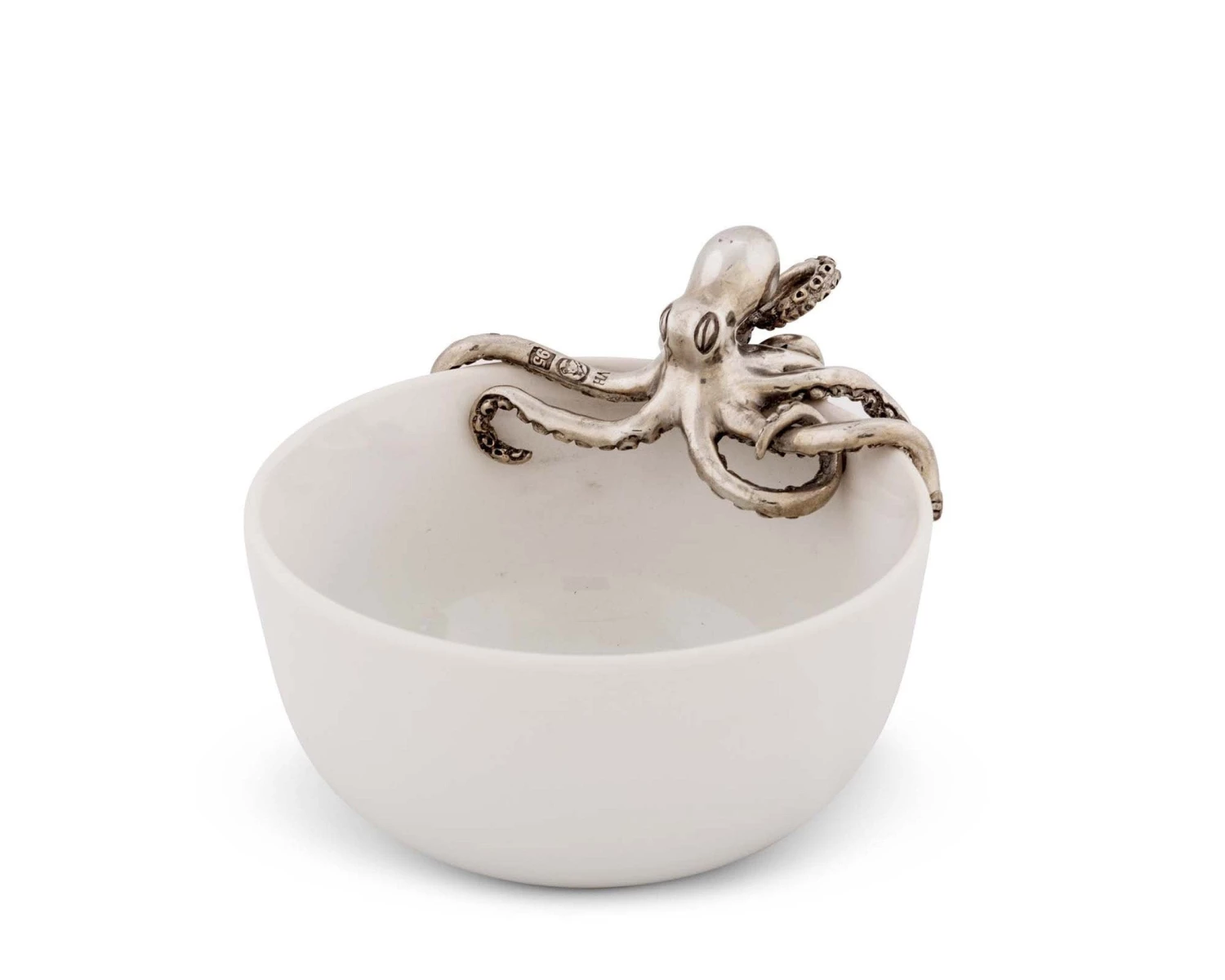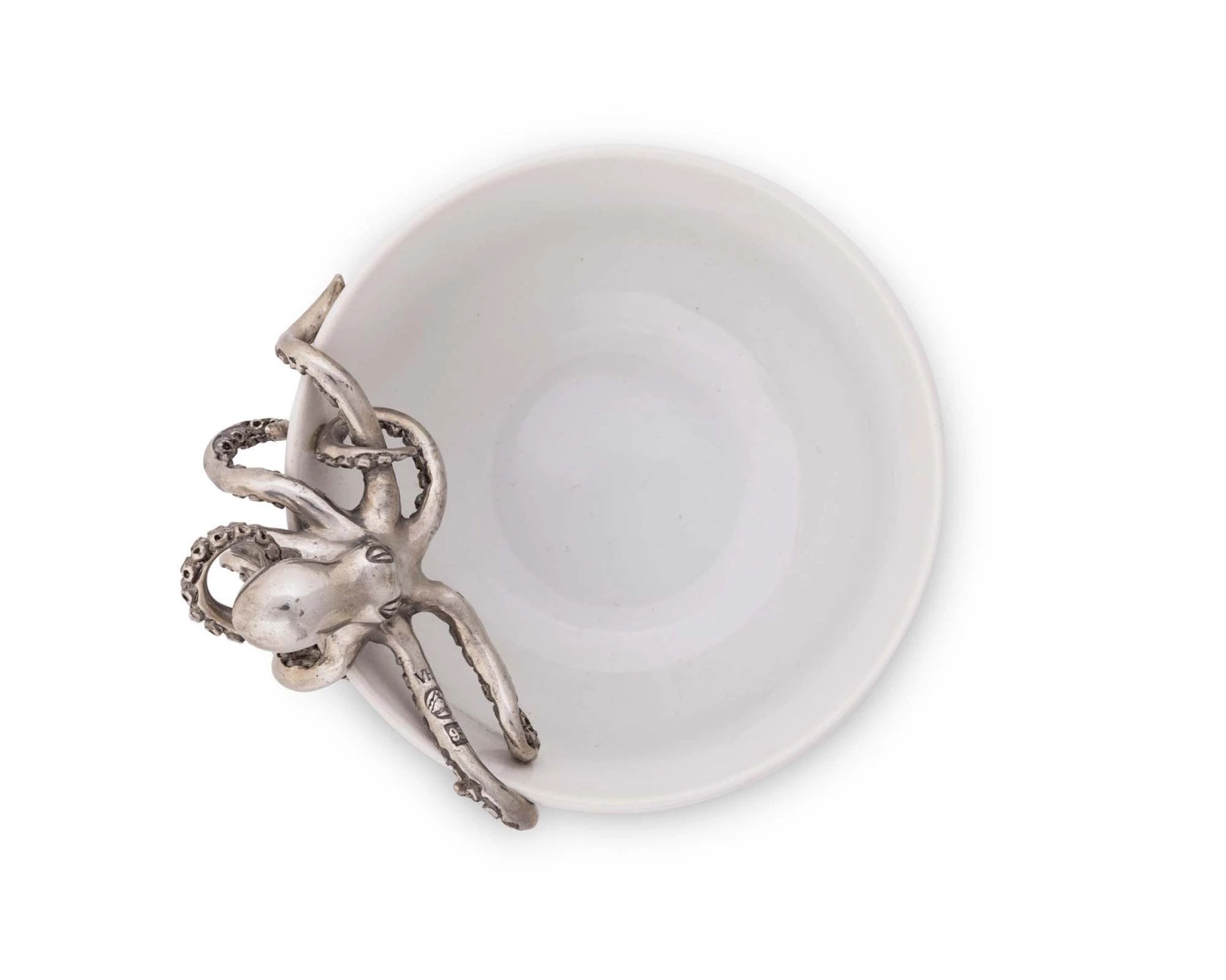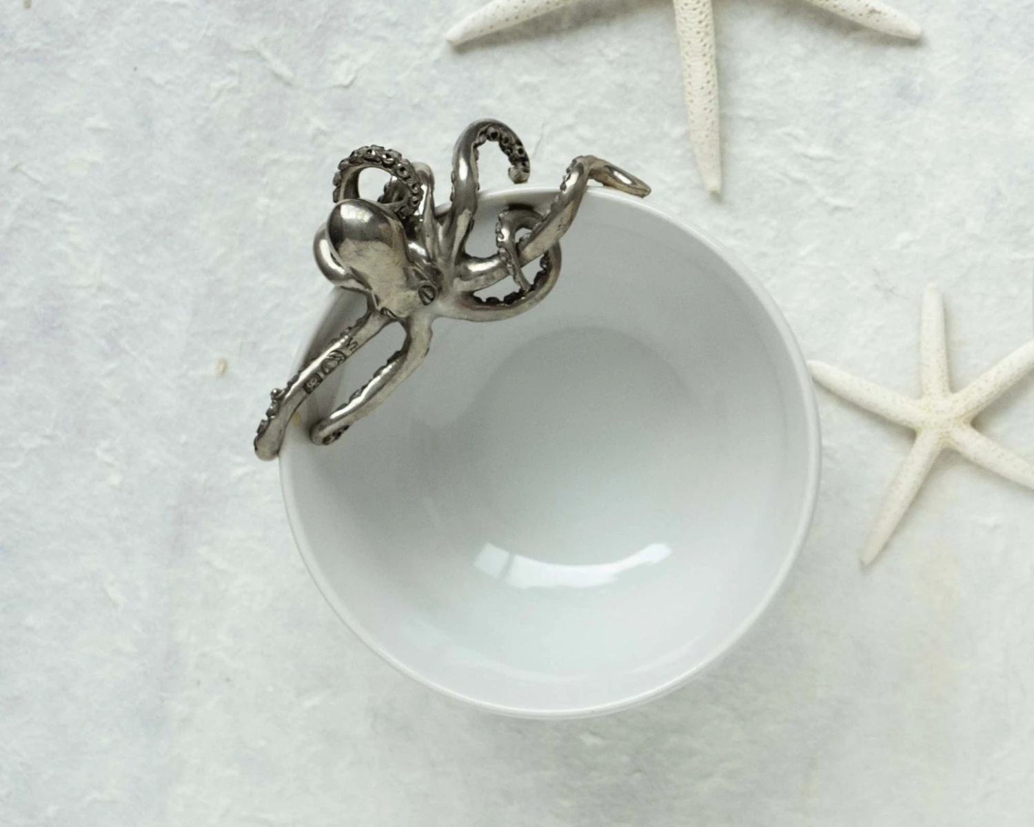 A kraken style Octopi, crafted from luxury grade pewter, writhes and wiggles his detailed tentacles as the silvery, seafaring embellishment on Vagabond House’s unique Pewter Octopus Embellished Stoneware Serving Bowl. Crafted from lustrous fine stoneware, the bowl is double-glazed by hand and twice fired to a beautiful, shining white finish.