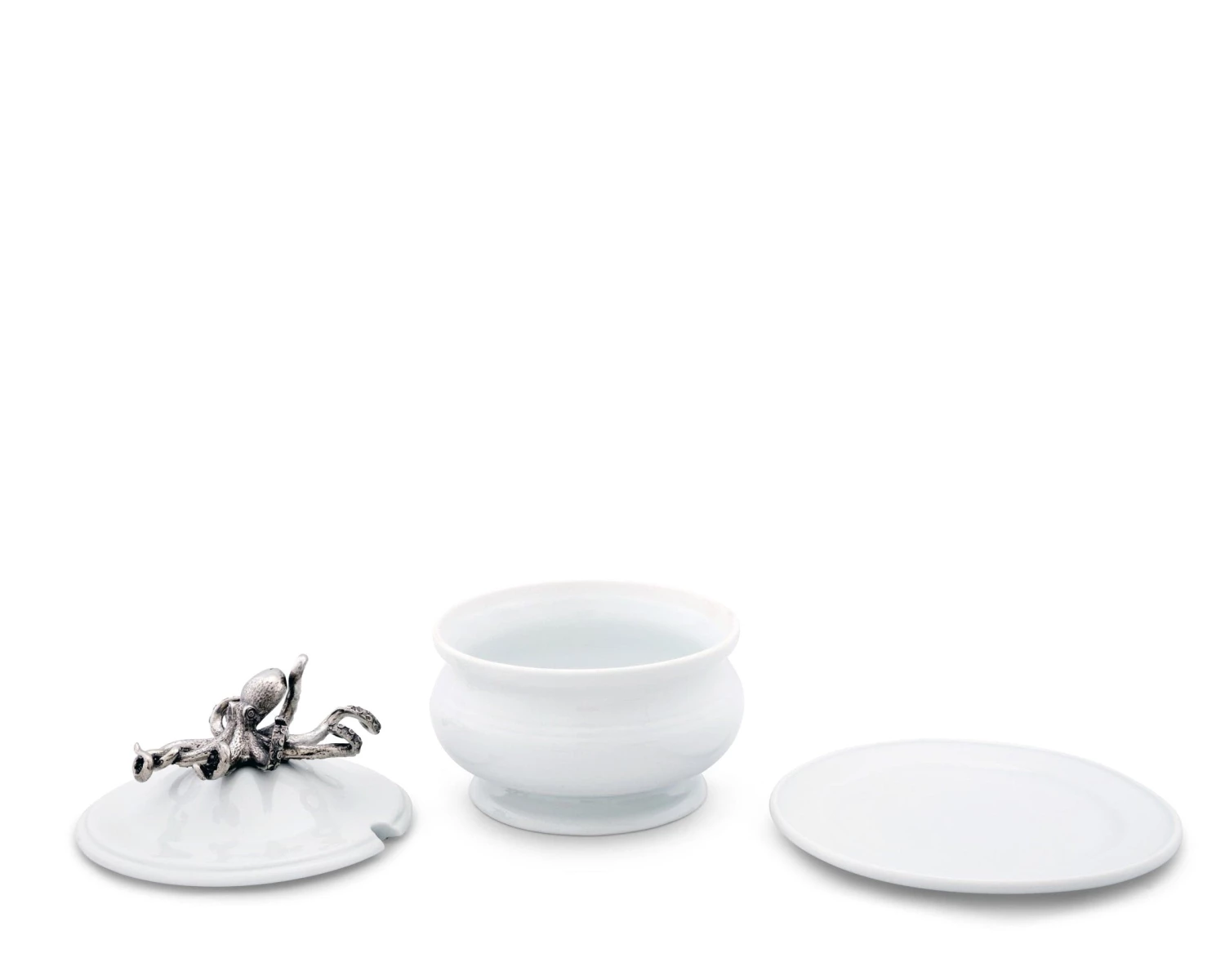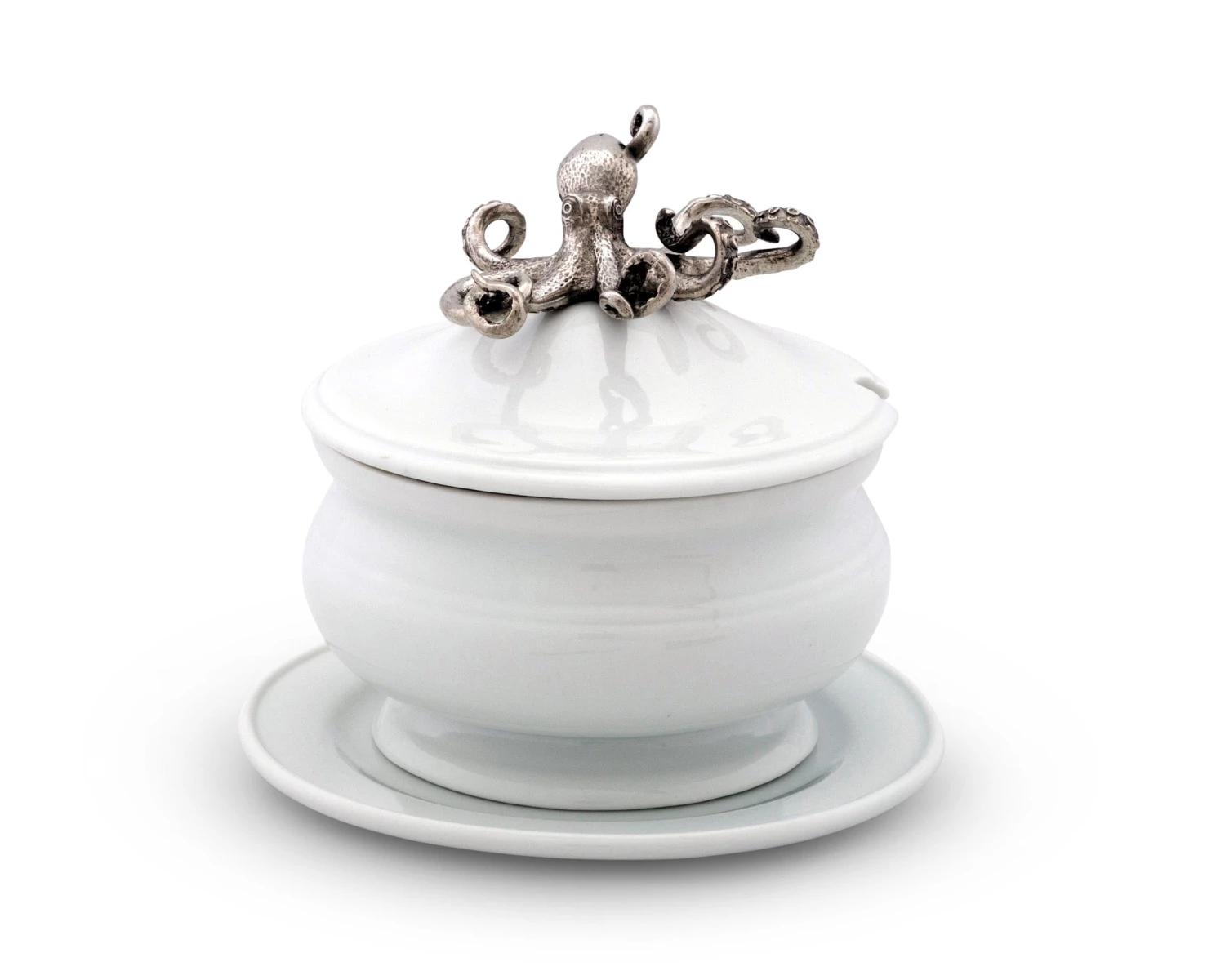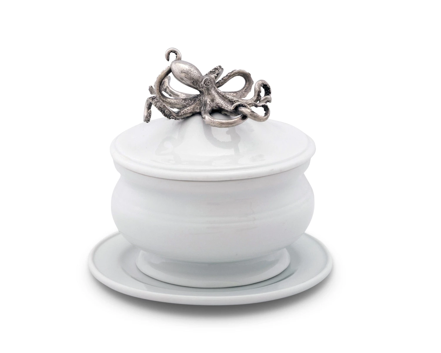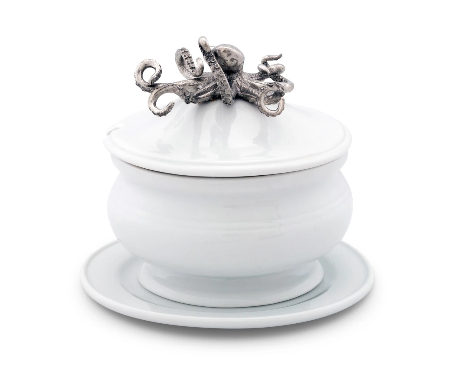 Vagabond House’s Covered Stoneware Octopus Bowl comes with a matching lid, beautifully embellished with an observant octopus figural, hand-crafted in luxury pewter. A table ware classic that will add a fresh breeze of marine life when dining with friends and family.