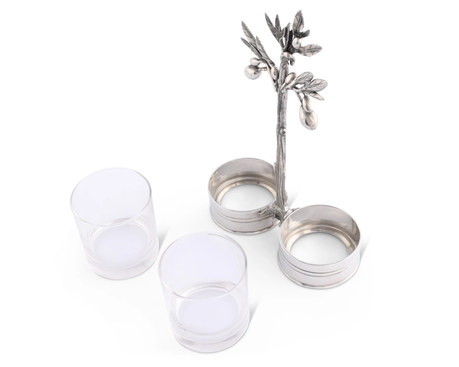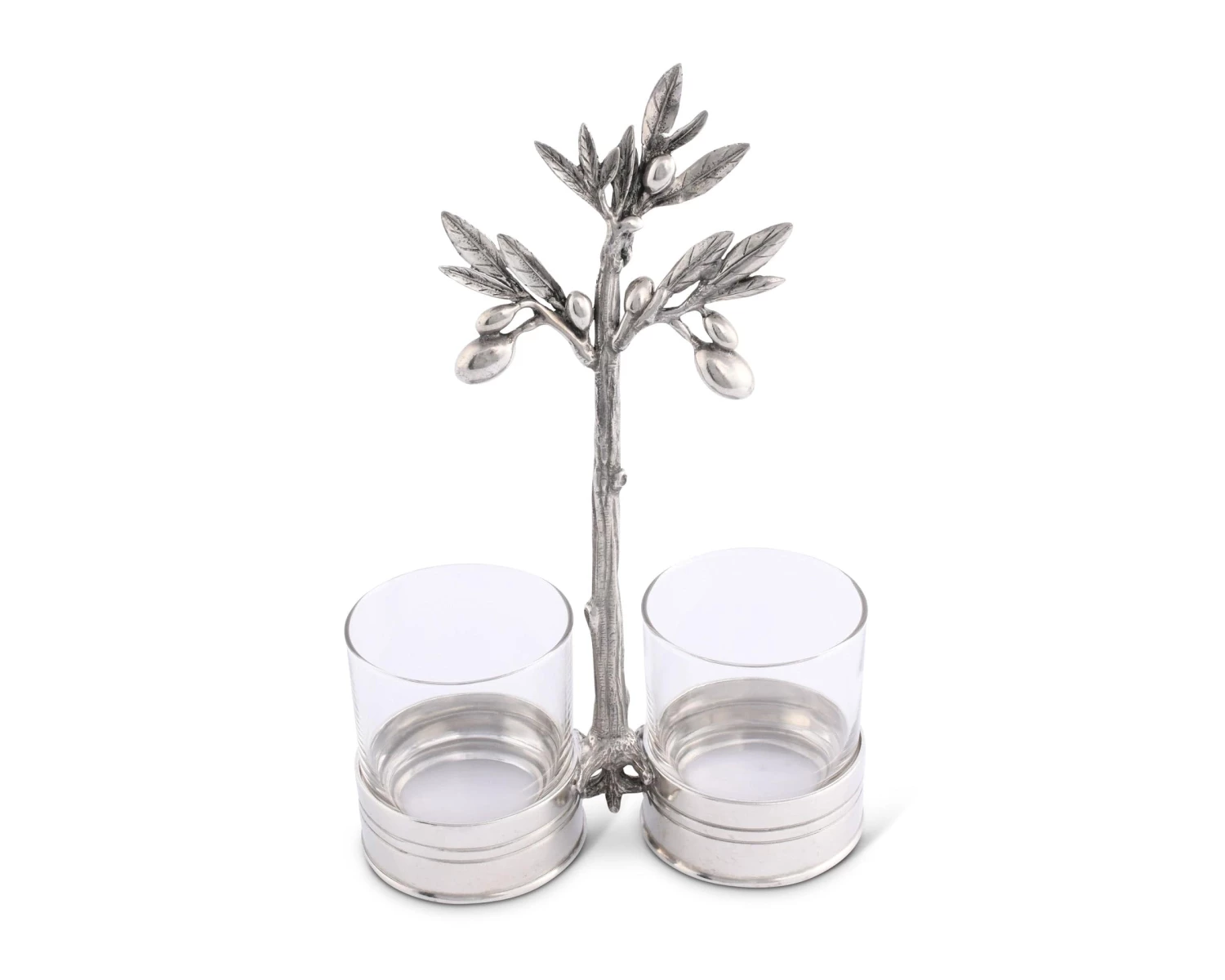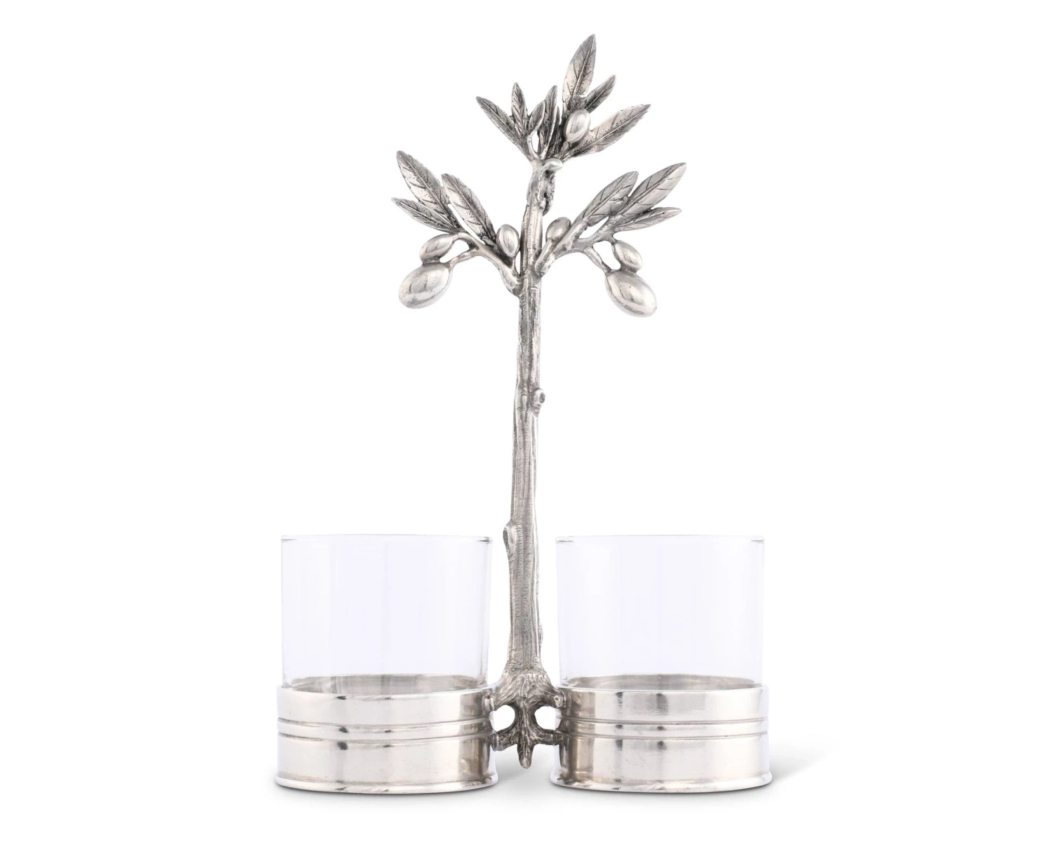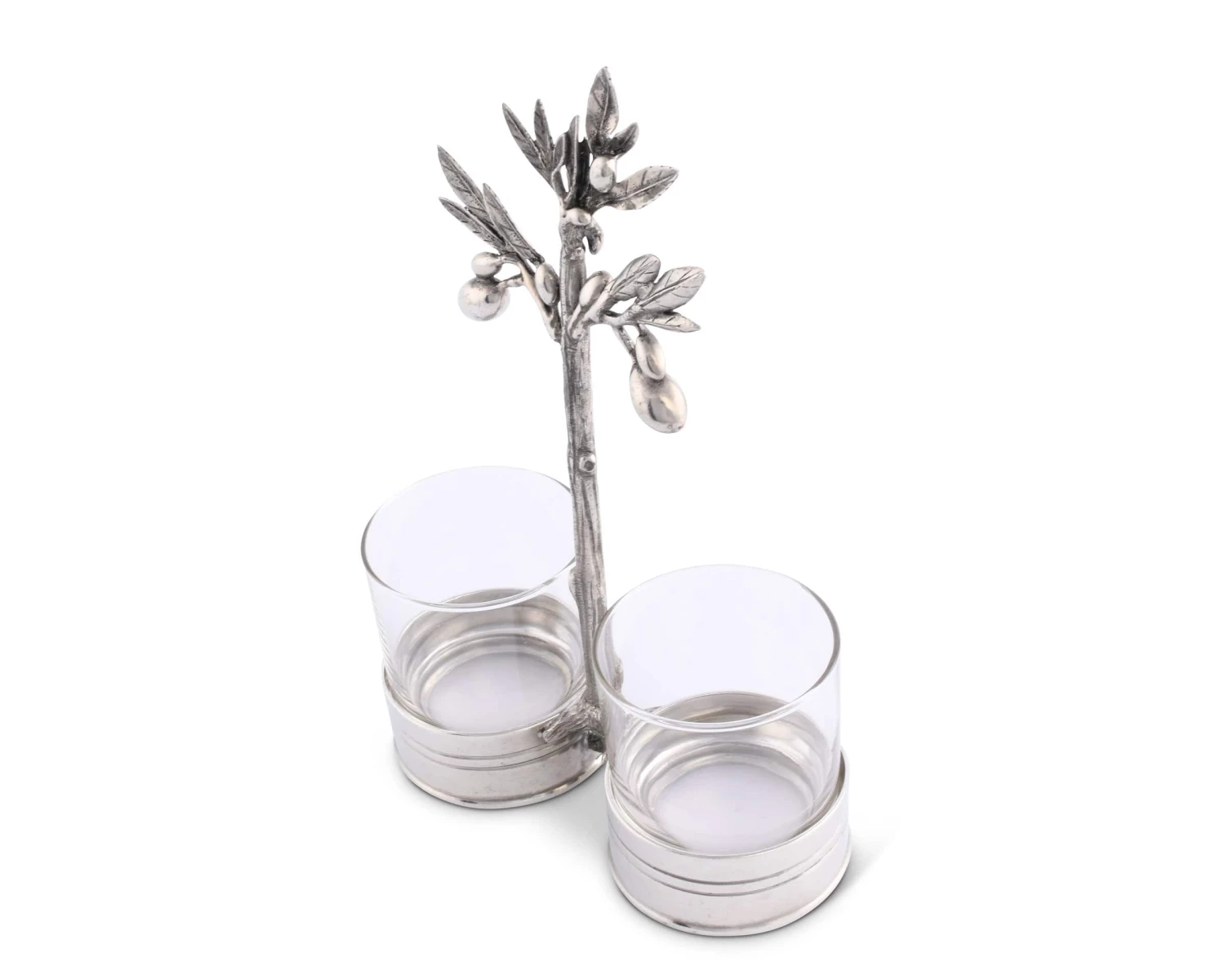 A delicately detailed, pure pewter olive branch, laden with fruit and leaves, is the focal point of Vagabond House’s Olive Grove Pewter Double Condiment Server. The branch is both the handle and the join for two, banded pewter cups which hold the glass condiment jars.