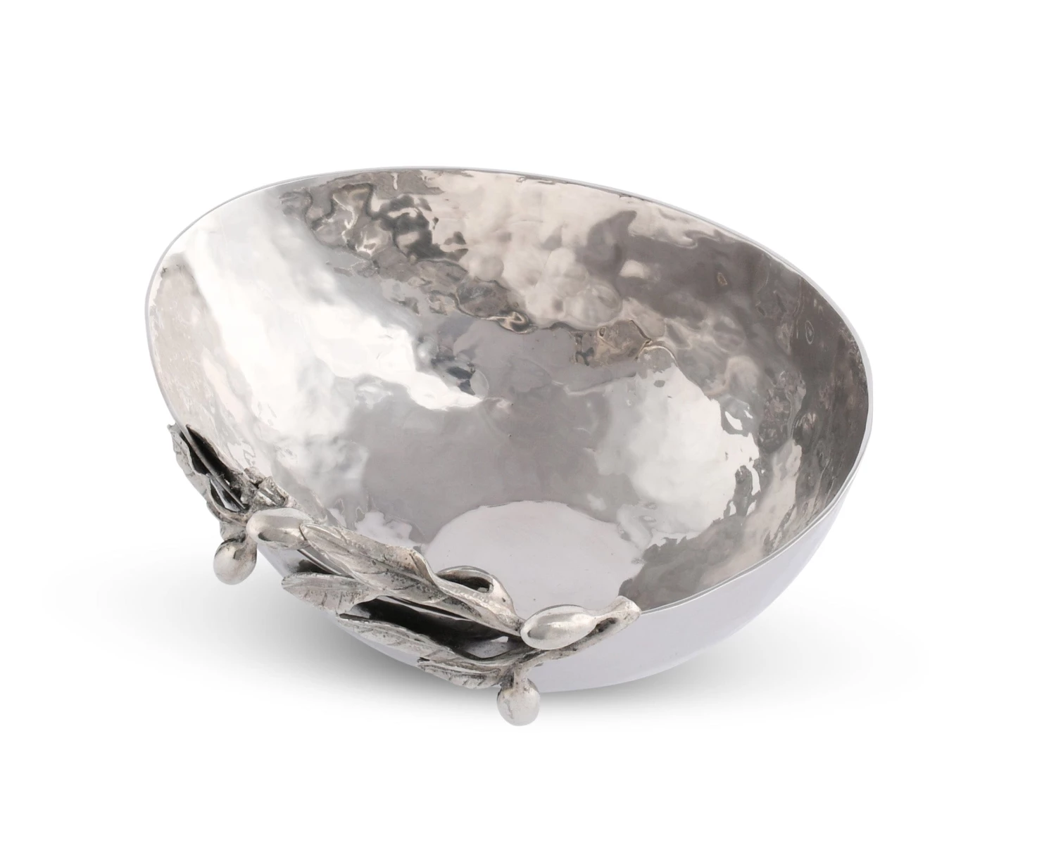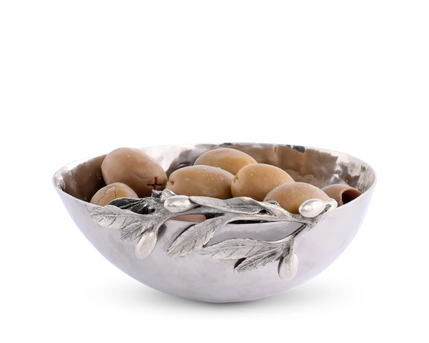Serve your guests with natural and elegant style with Vagabond House’s Olive Grove Stainless Steel Bowl. The highly polished, hammered stainless steel bowl is embellished with a figural pewter olive branch, designed with signature Vagabond House detail. The branch is adorned with twigs, leaves and olives.