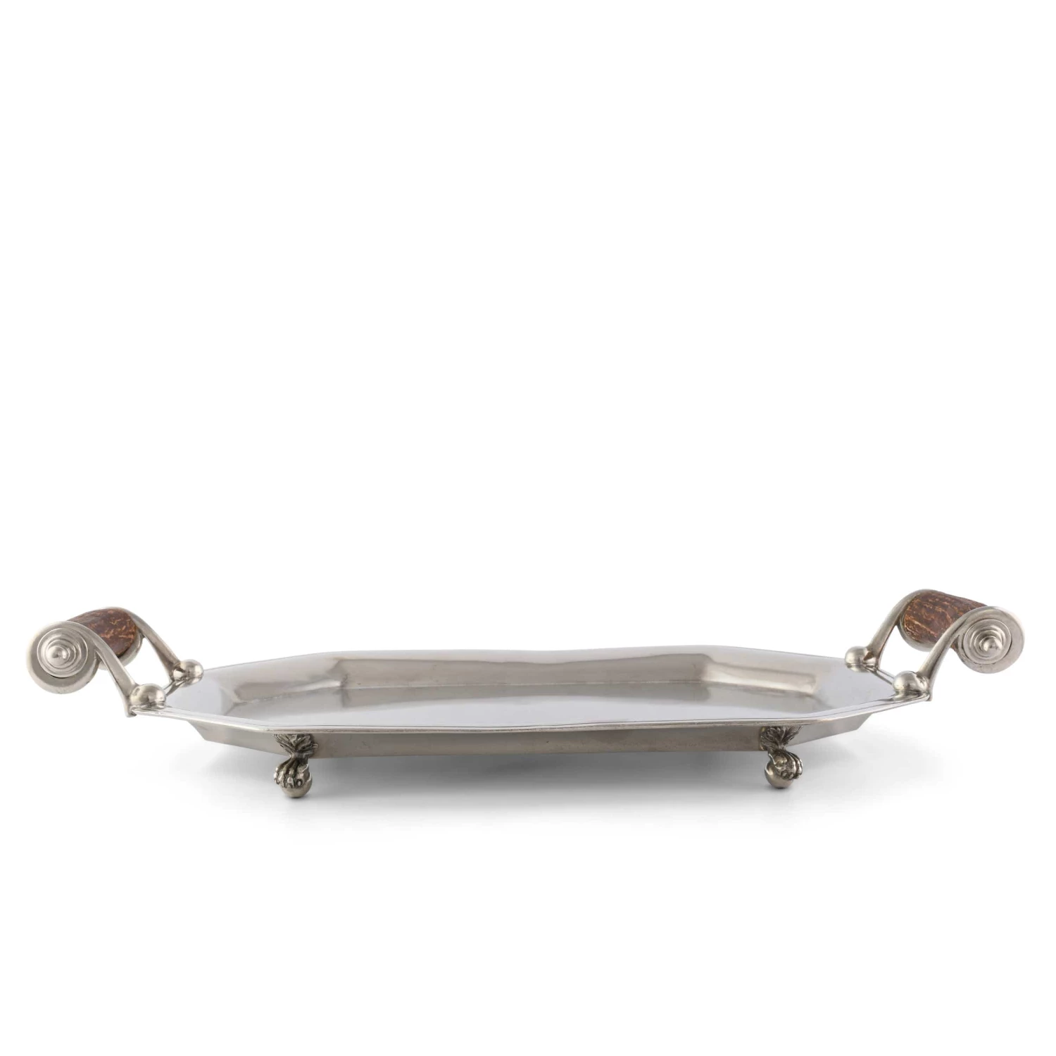 Pure luxury grade pewter tray is enhanced by our artist created, hand-crafted natural-look faux antler handles. Our pewter is lead free, FDA compliant and 100% food safe. To create the handles, superior quality resin is hand-cast, hand-finished and then hand-painted creating the most realistic replica of hand-gathered antler you will find in the world market. Our finished product is a perfect example of trompe l’oeil, painting that fools the eye into believing it is the real thing. We knew we had found the right crafters to create these amazing handles when even our designers were fooled by the first samples they saw.