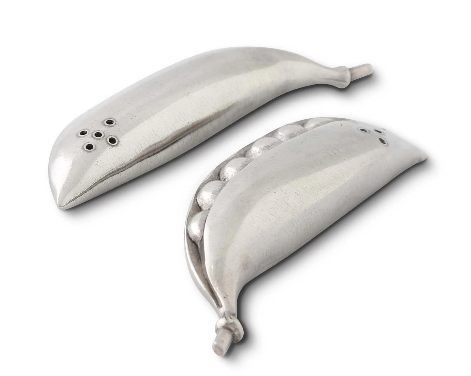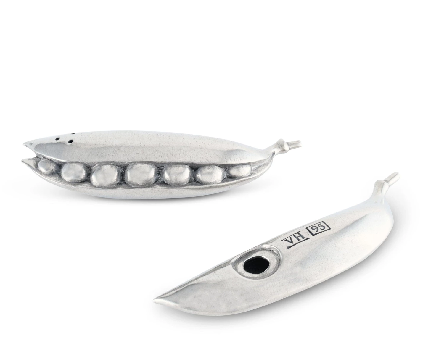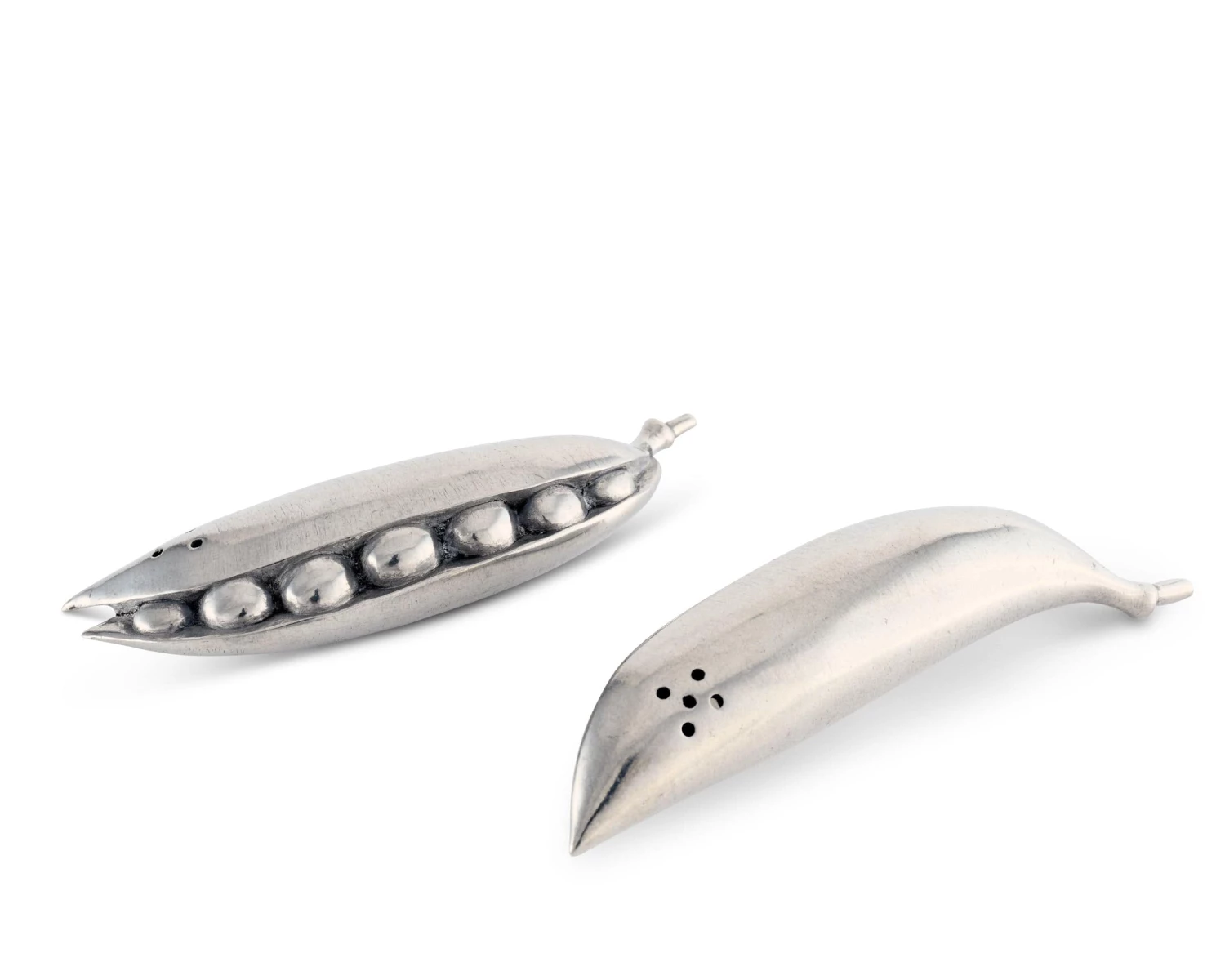 Vary the look of your table accents by adding Vagabond House’s Pea Pod Salt and Pepper Set into the mix. Pure-pewter pea pods house the dispensing holes on their top edge as they lie flat on the table. One vegetable features a slit in the design that exposes its seeds, while both pieces display a knotted stem at the end of their design.
