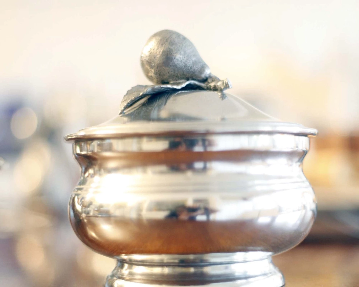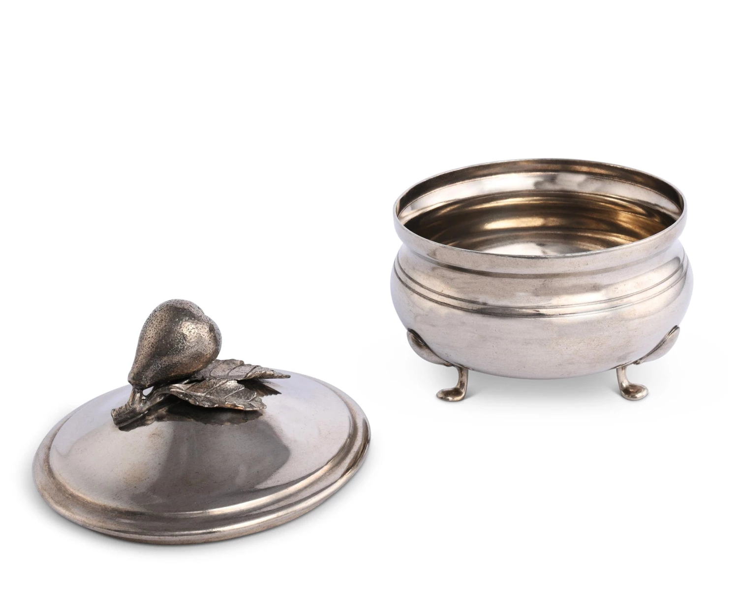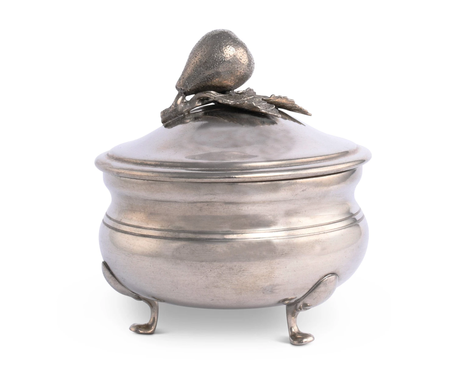 Integrate classic elegance into your Harvest Collection with Vagabond House’s Pear Sauce Bowl. Crafted in luxury-grade pewter, the dish features a tri-footed base and simple banding around the middle. A realistic pear displays spotty skin at the top of this piece as its stem attaches to the veiny leaf underneath it.