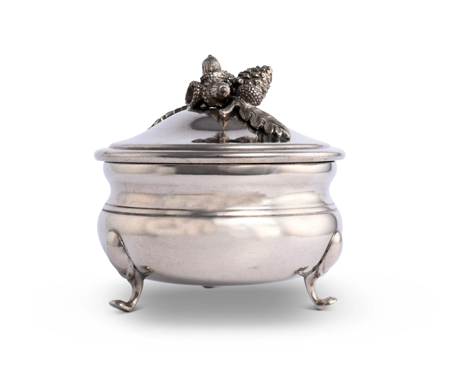 Our round Acorn & Oak Leaf bowl is cast and hand-finished with a slight sheen. A finial of an exquisitely detailed corsage of pewter acorns and oak leaves tops the lid, adding unique Vagabond House style as a figural handle. The bowl is sparely tooled in classic style with a slight indent curve near the top.