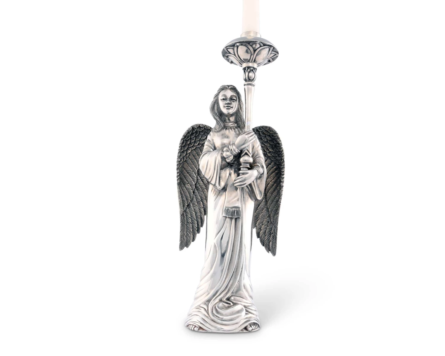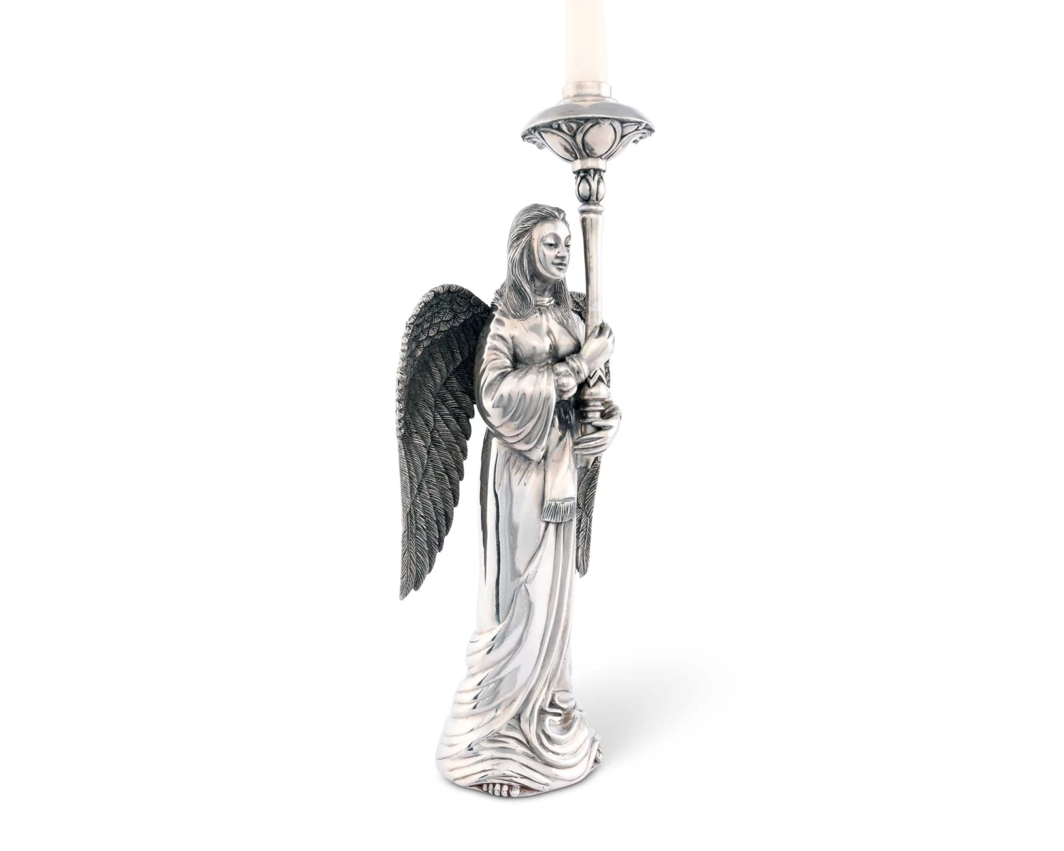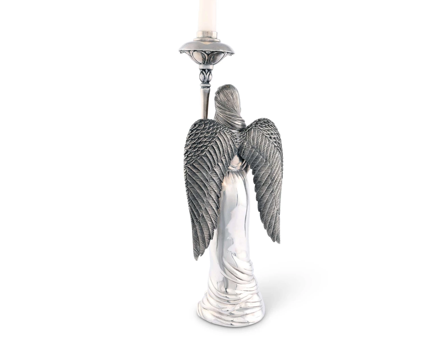 Stunning and sublime, our luxury tall pewter Angel candlesticks are hand-cast and hand-finished in intricate detail. Holiday décor showstoppers, they are elegant enough to display and use throughout the year. Dressed in flowing robes, with feathery wings the statuesque Angel holds a touchier style candelabrum for a taper candle. Available in two sizes, use one or more of each for an arresting display.
