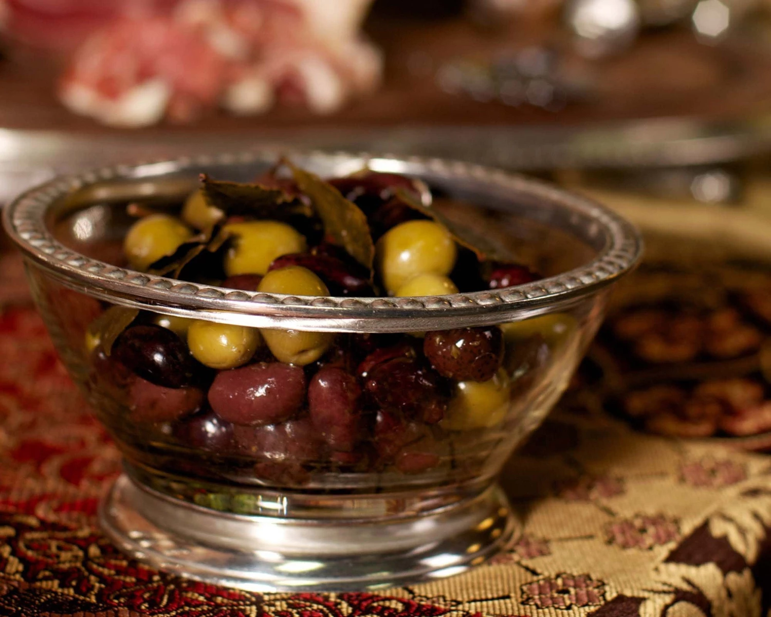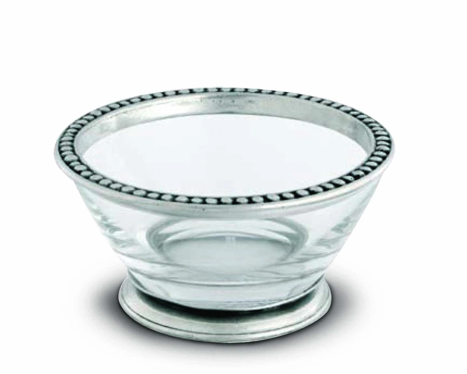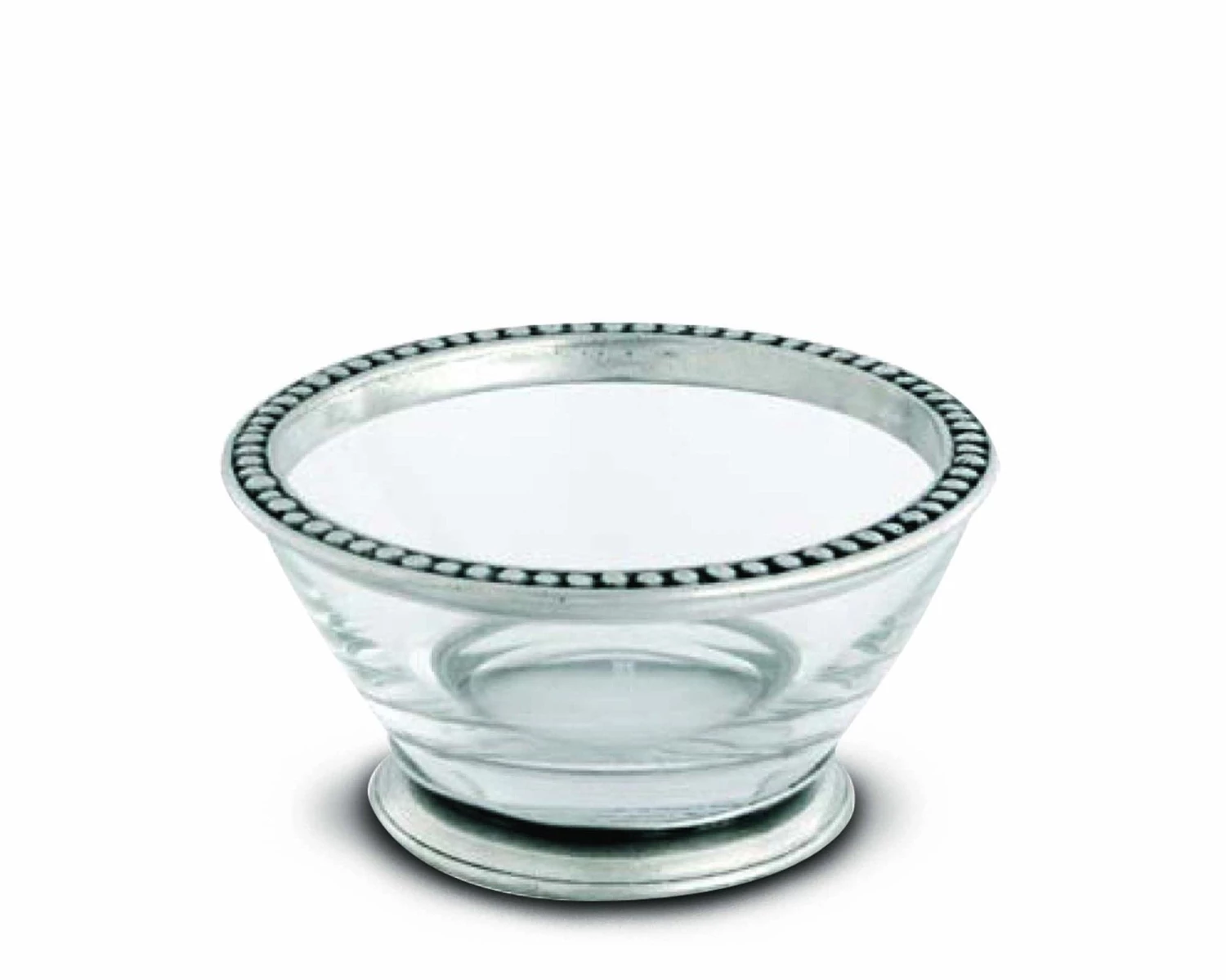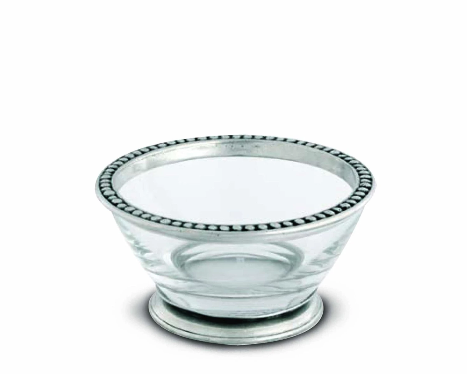 Our clear glass angle rest on a ring base of simply tooled, pure pewter. The bowls are rimmed in pewter cast with a design inspired by the red balls found on the Medici family crest.