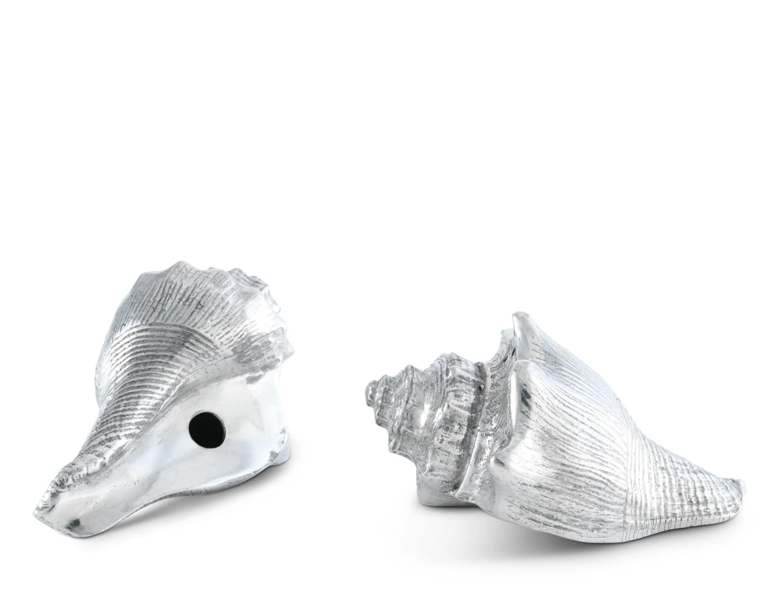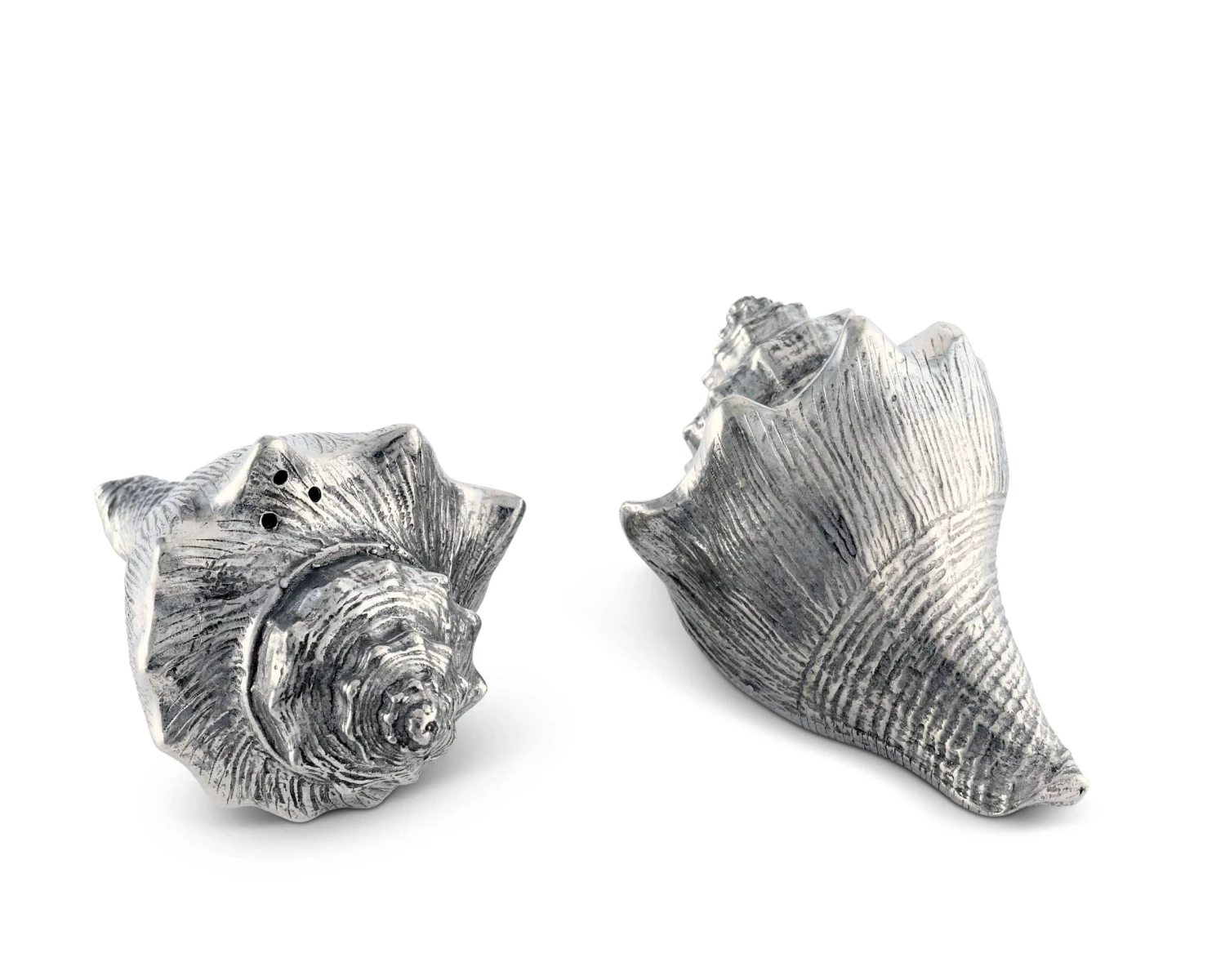 Given a beautiful conch shell, the first thing most people world over will do is hold it to their ear to hear the song of the sea. Although we can’t claim that will happen with pure pewter Conch Shell Salt and Pepper Set, we can say that this set will bring some of that magic to your table.