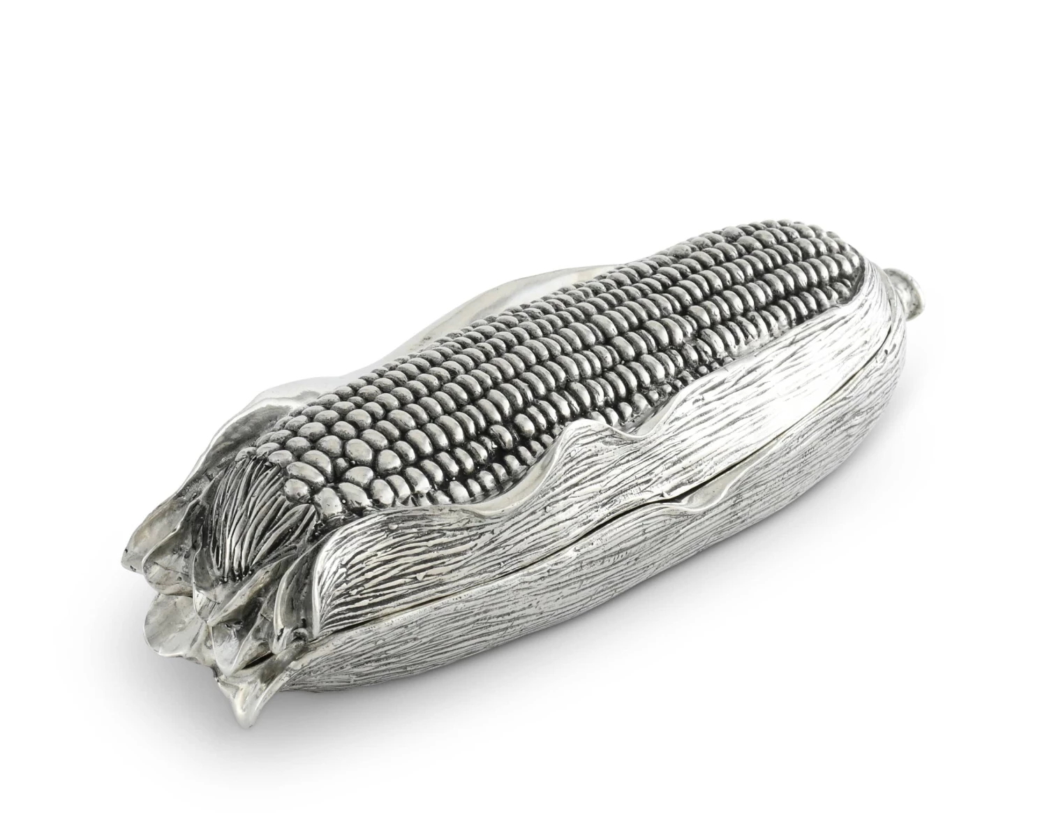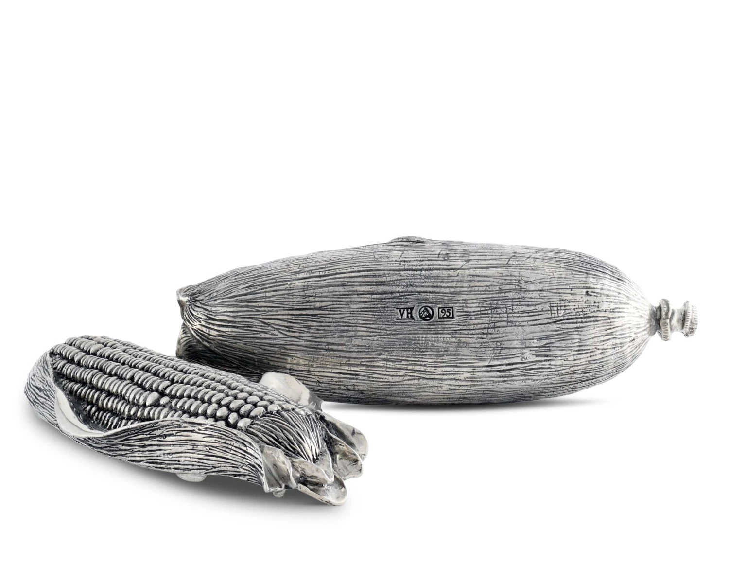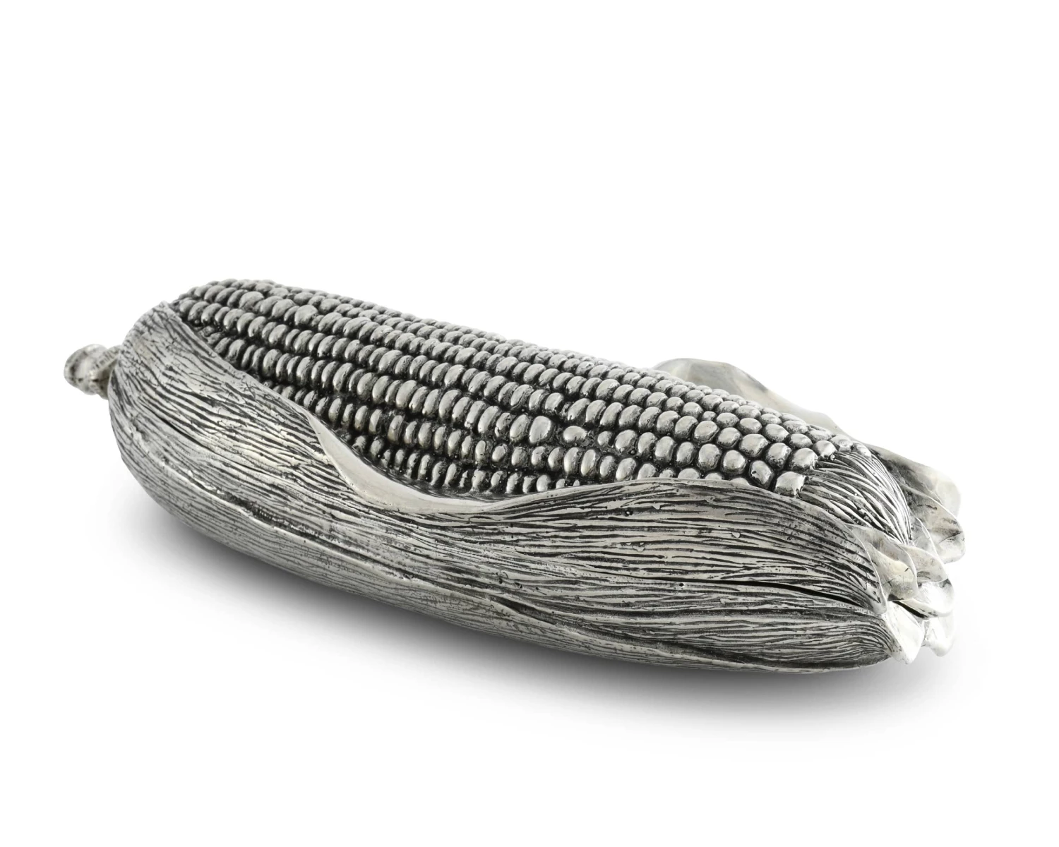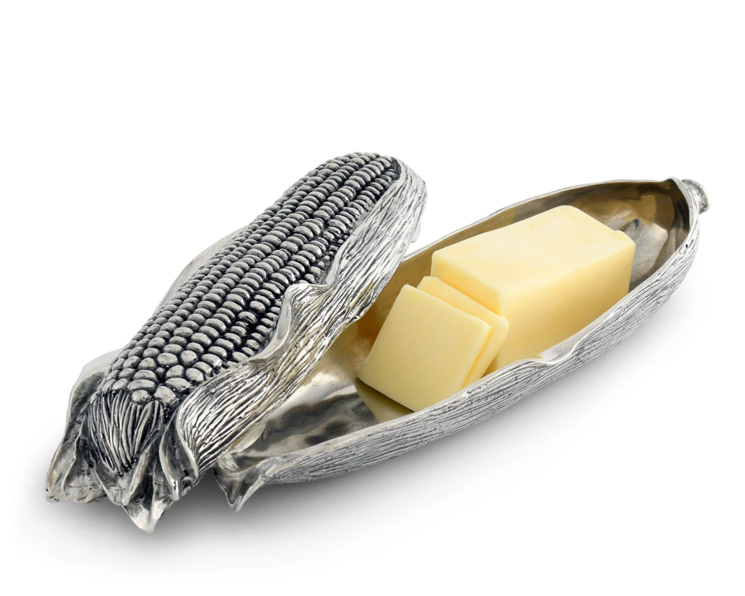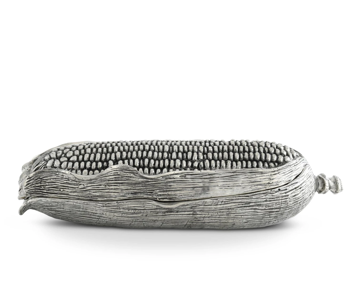 If not for its silvery color, the life-size form of Vagabond House’s Pewter Corn Butter Dish might try to be peeled. Our craftsmen define each kernel of corn and strand of silk in this piece with remarkable precision. Patterned lines on the husk blend in with the dish’s dividing edge, which makes this design a beautiful table accent when it’s not in use.