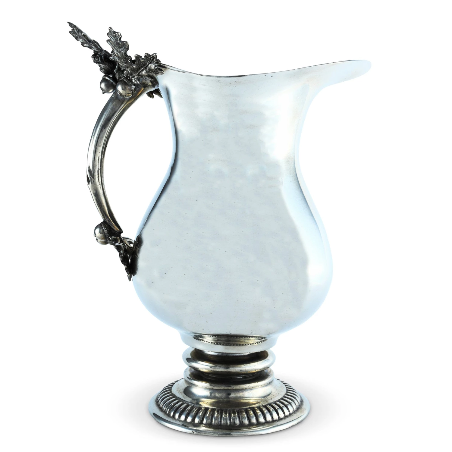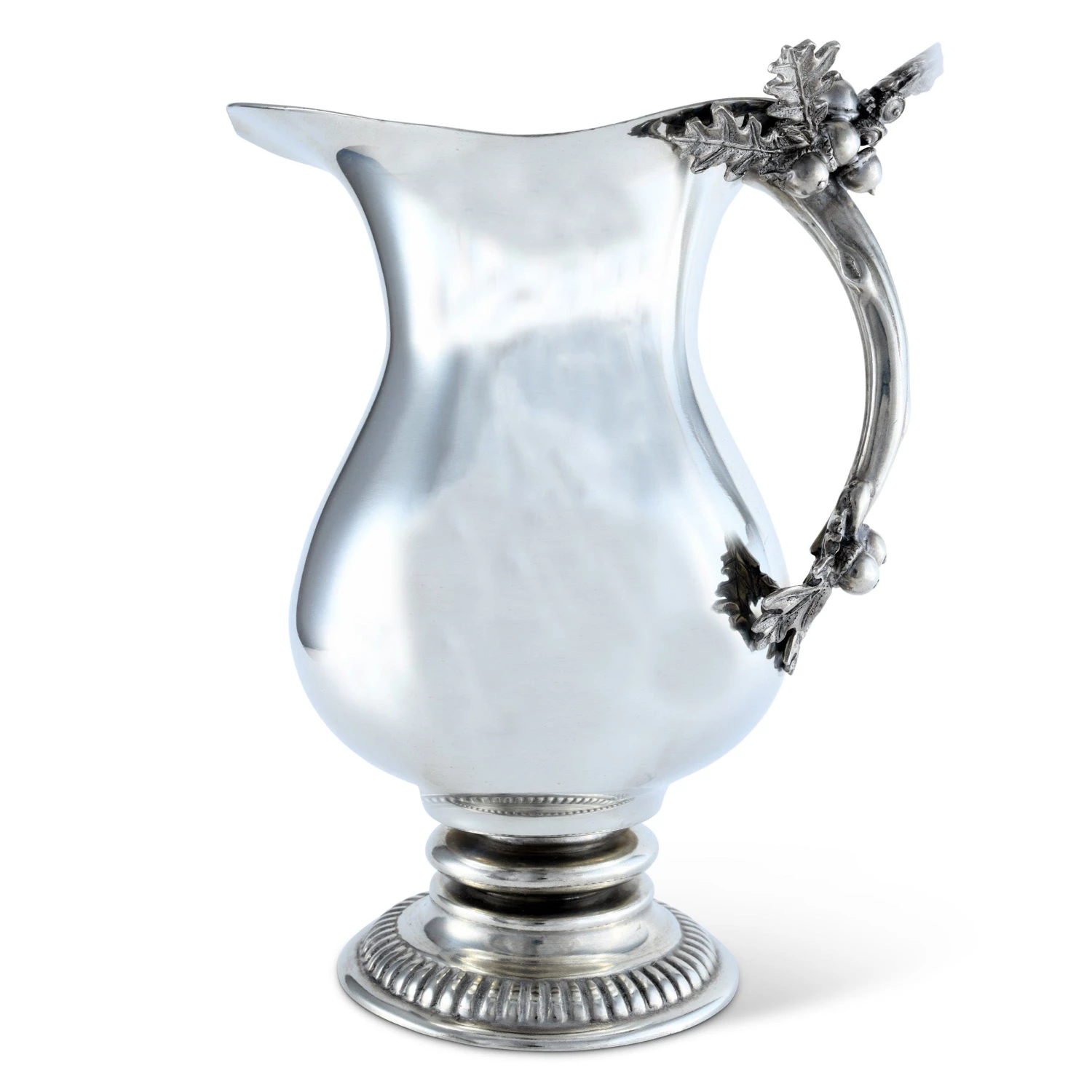 Our unique pitcher is classically shaped and features a sturdy handle accented at the top and bottom with our unique figurative acorn and oak leaf detail. A bright polished finish on the body is complemented by the spool and gadroon accented base, perfectly weighted for balance.
