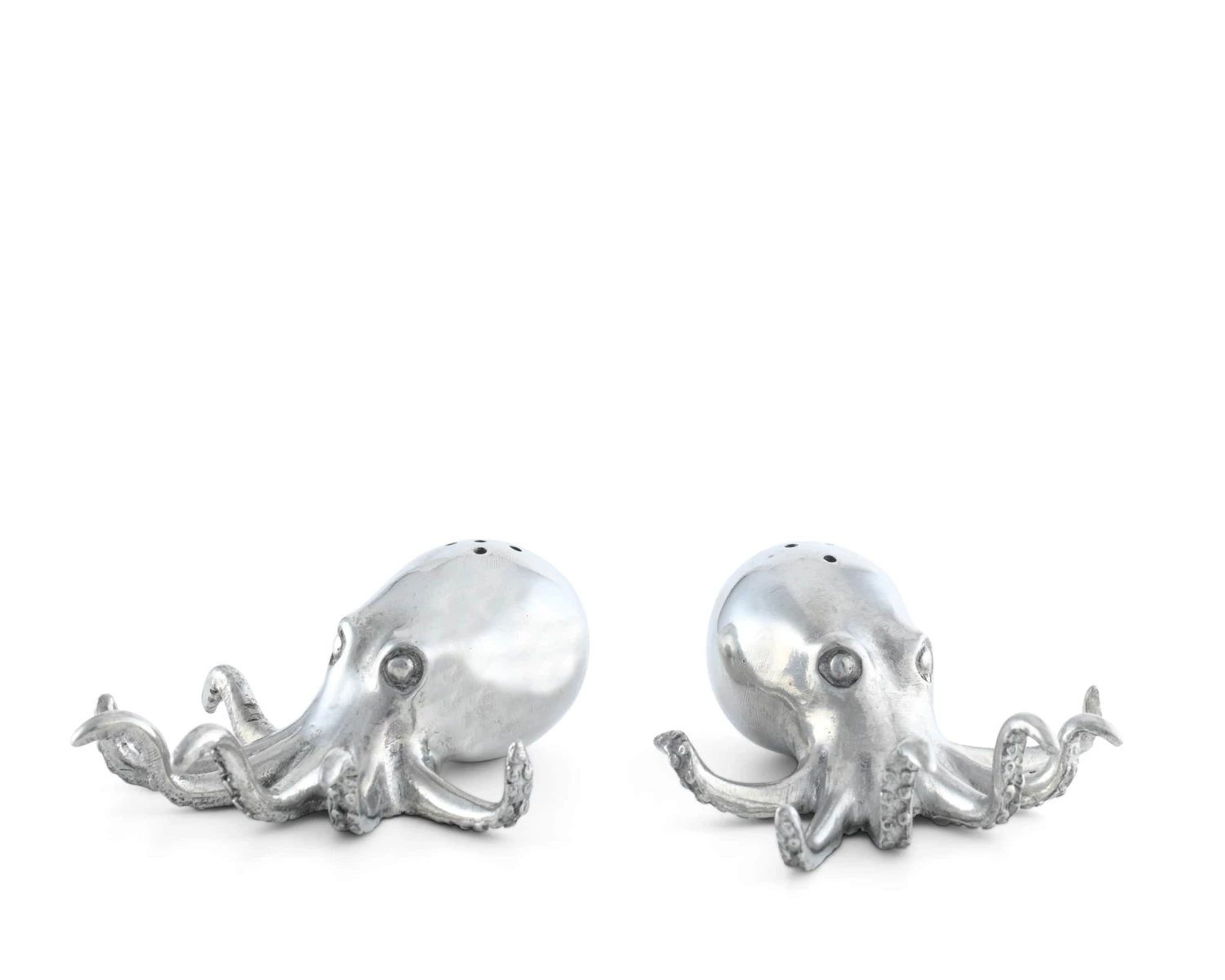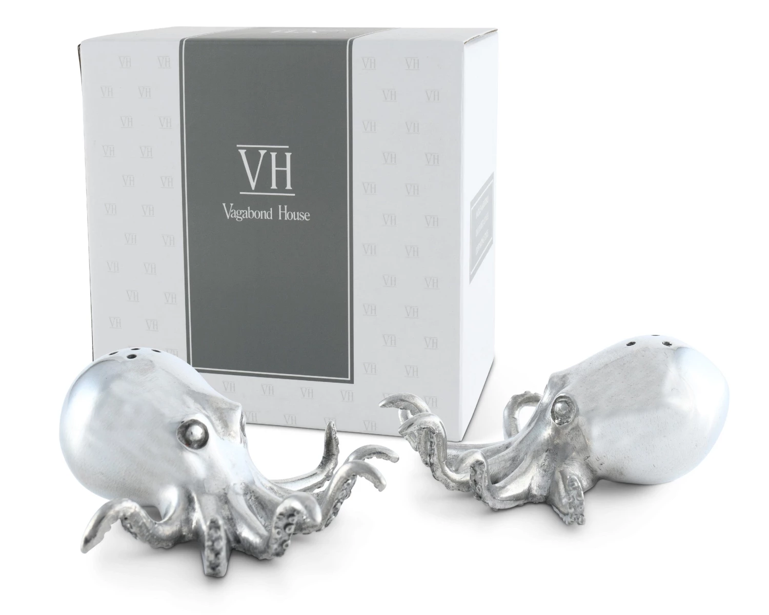 Delightfully different, Vagabond House’s pewter Octopus Salt and Pepper set brings the soul and wisdom of these ancient sea creatures to your table. Artfully detailed, hand finished pewter glows with the silvery shine of the sea while the Octopi amuse the loved ones at your table.