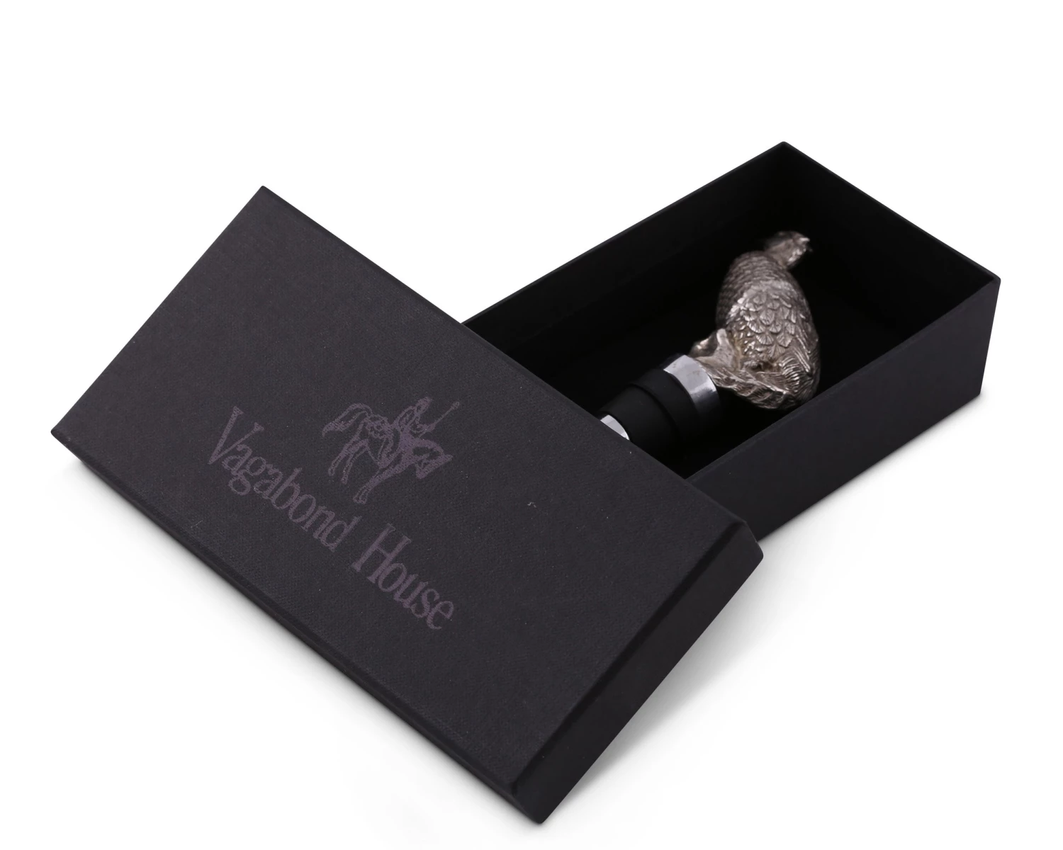A pure Vagabond House pewter pheasant hen perches atop our bottle stopper. Captivating detail and accurate design down to the curve of her tail feathers, our pheasant figural collection is uniquely Vagabond House.