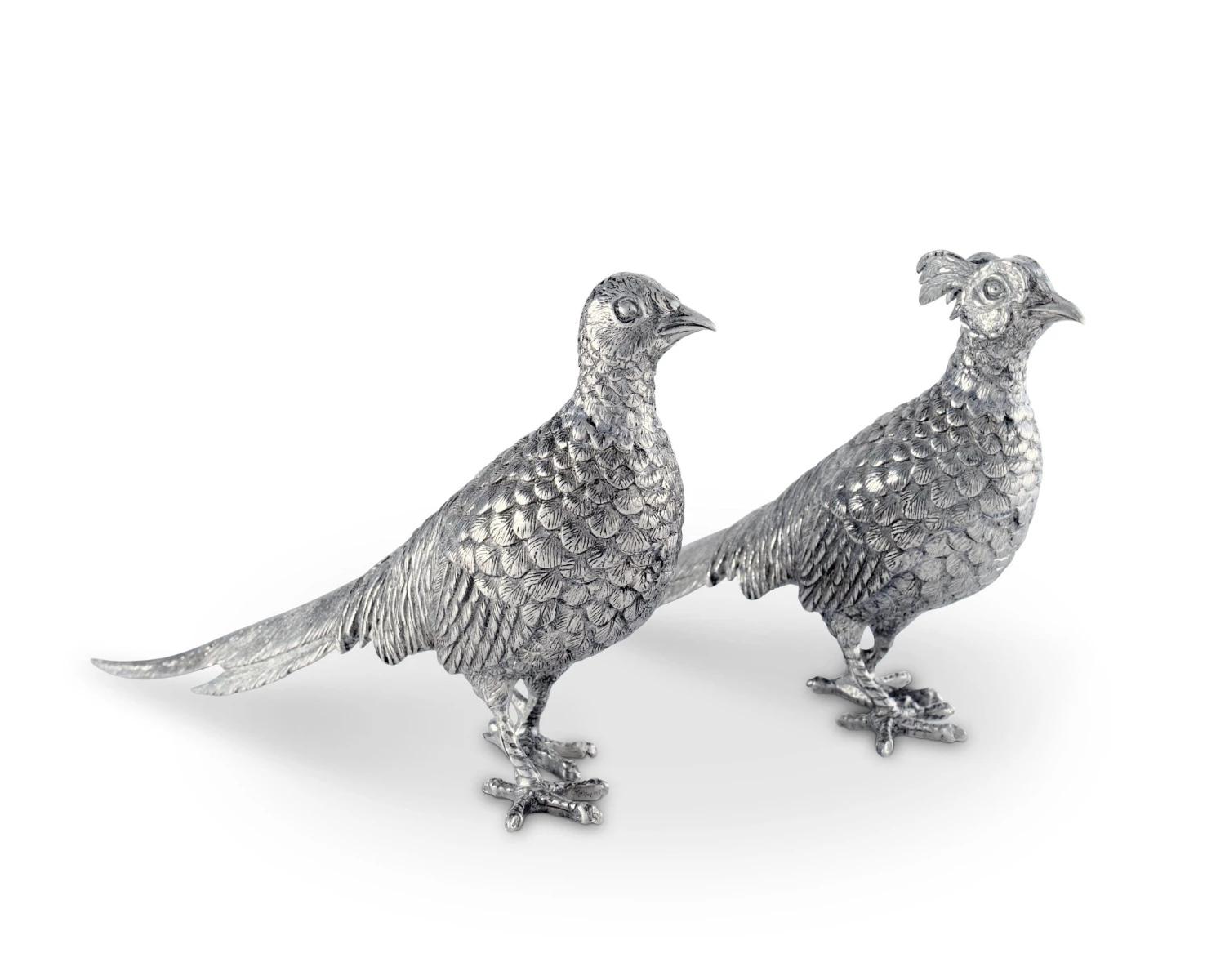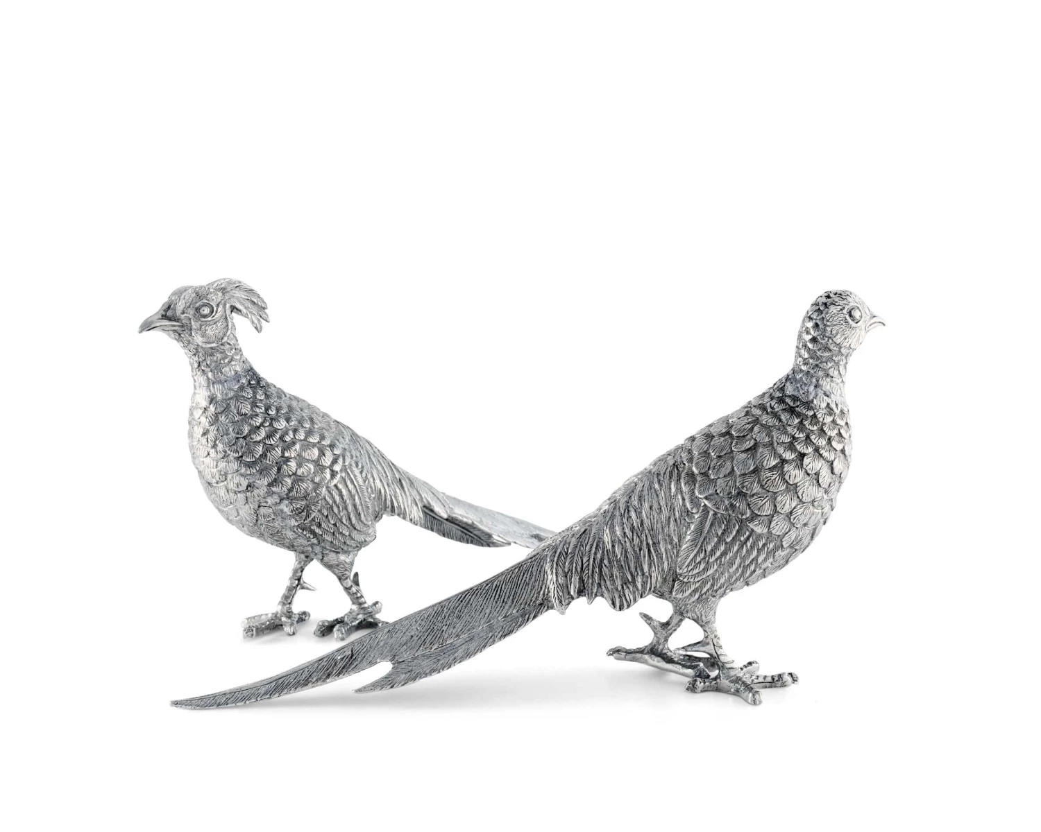 This pair of intricately detailed pure Vagabond House pewter pheasant statuettes are so realistic you may want to offer them some bird seed! Crafted with our signature dedication to capturing the exquisite details, beauty and nature of wildlife in pewter and finely hand-finished.