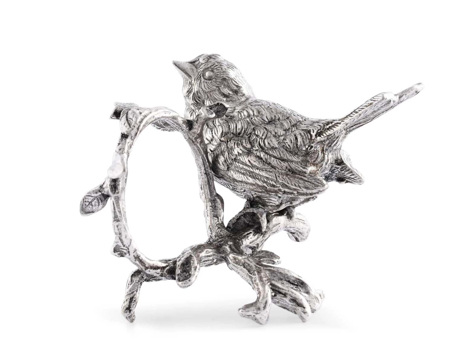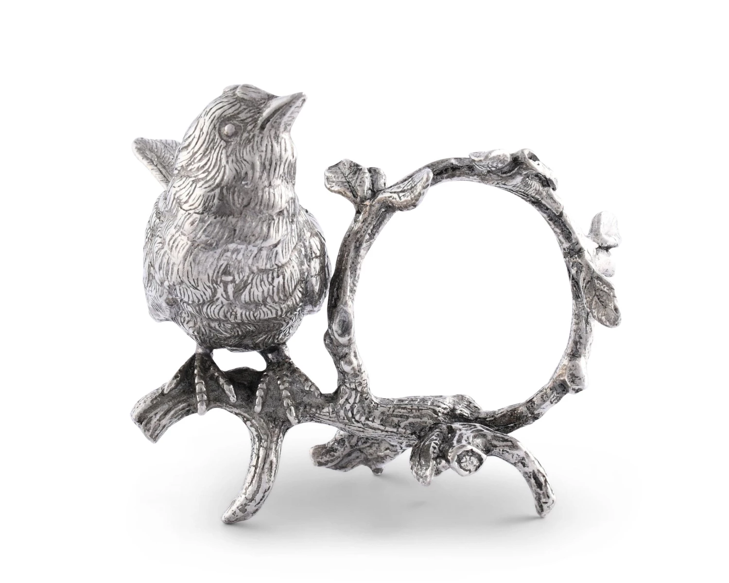 This darling songster perches upon a pure pewter branch. The circular branch forms the napkin ring to create Vagabond House’s Song Bird Napkin Ring.