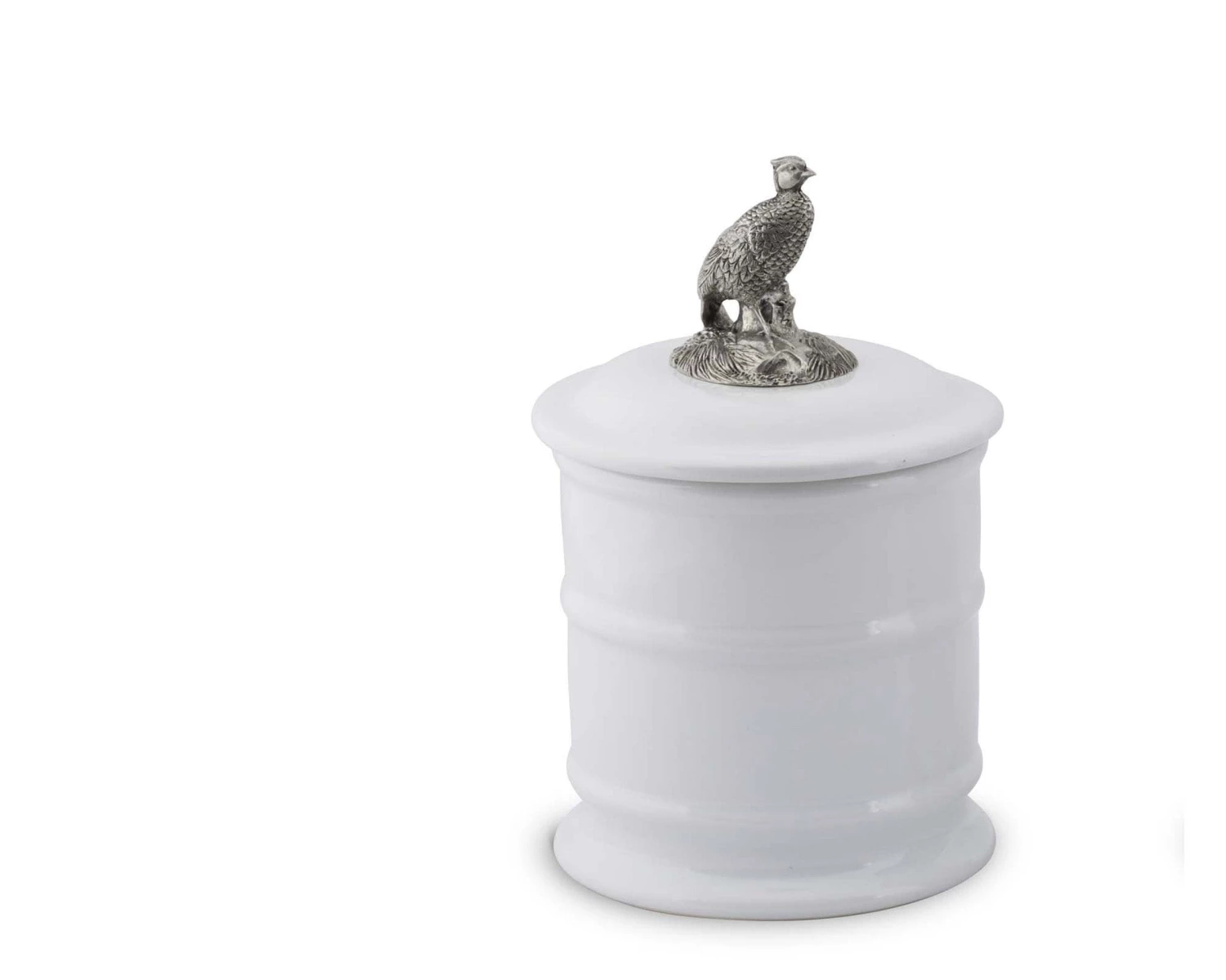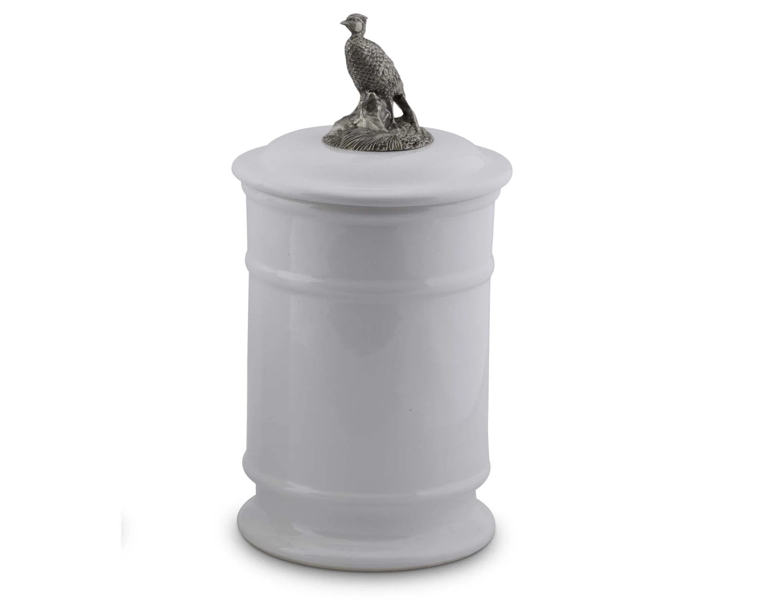 Vagabond House Pheasant Canisters define a unique countertop style. A luxury grade pewter handle, cast as a female pheasant on her nest tops the fine stoneware canisters. Perfect and intricate details whisper Vagabond House to those in the know. Crafted in fine stoneware, the canisters are double hand-glazed to a luminous, creamy white finish. Available in 2 sizes.