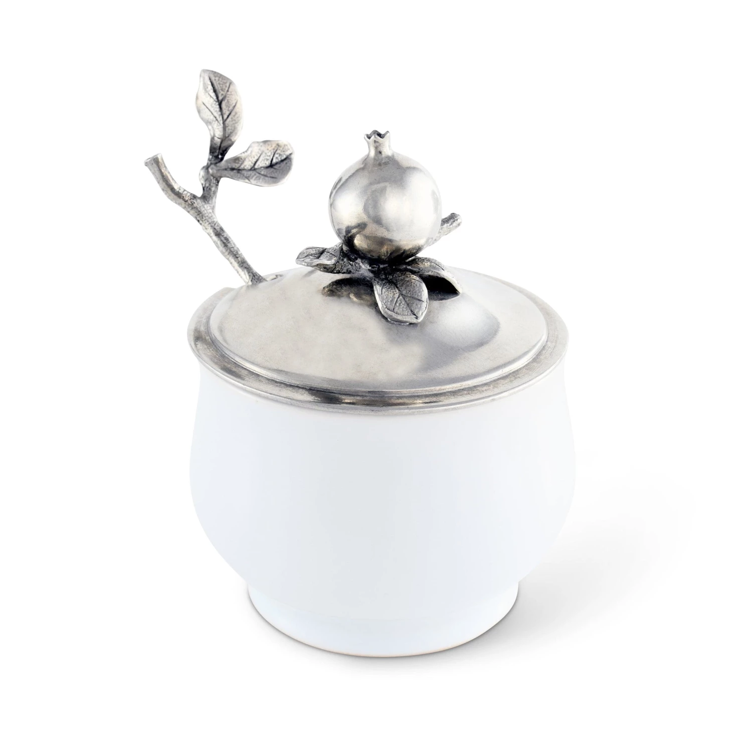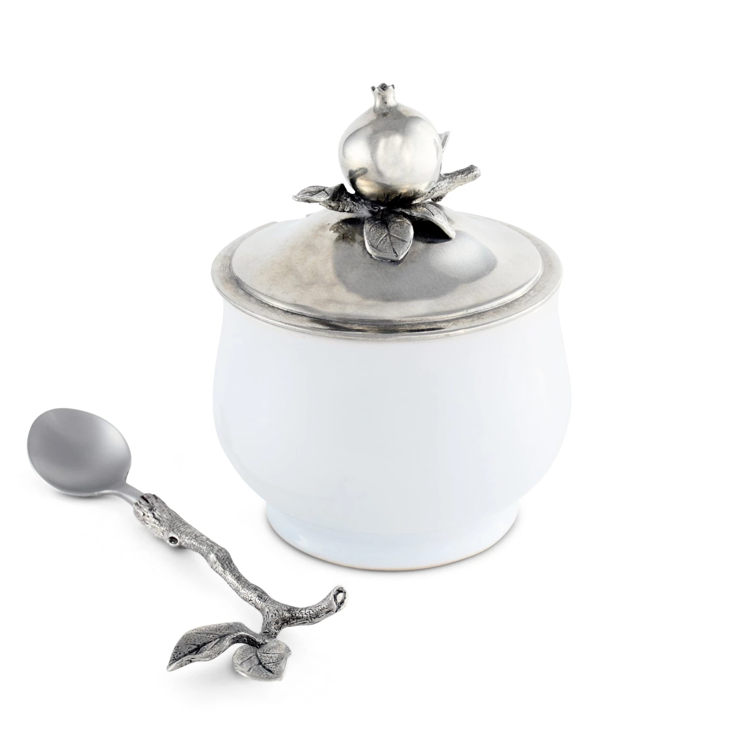The luminous white porcelain gets a cool touch of luxury with hand-finished pewter lid and sugar spoon.