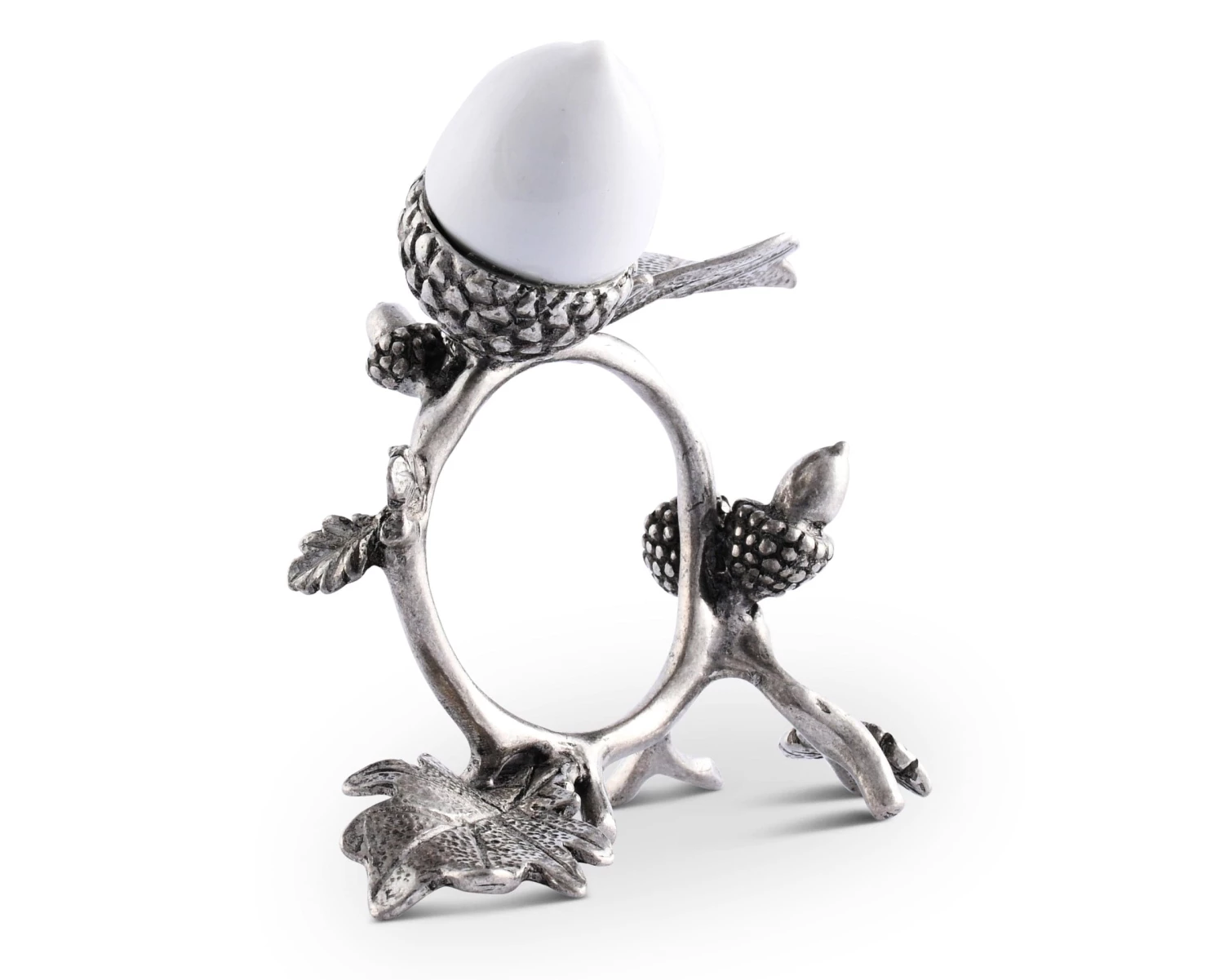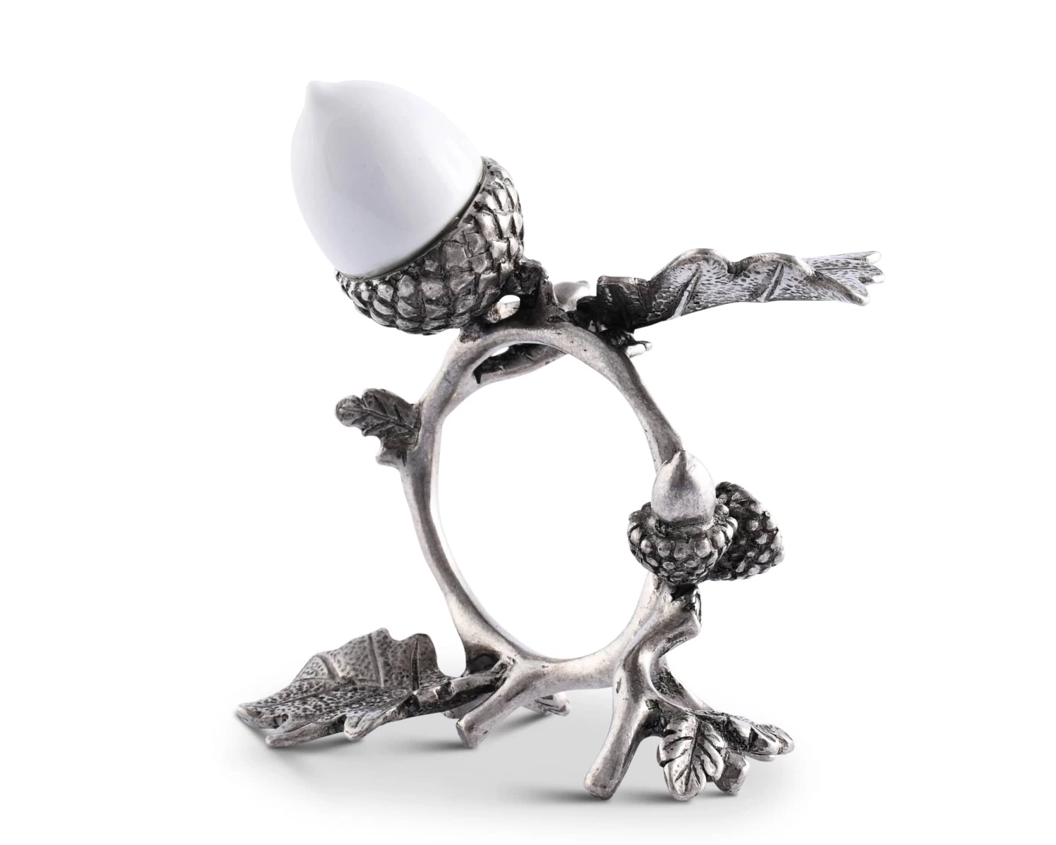 Finish an elegantly designed natural table with Vagabond House’s Acorn and Oak Leaf stoneware and pewter napkin rings. As homage to the majestic forests of our beautiful planet, a delicately detailed pewter figurative of simple acorns wreathed in oak leaves tops our elegant white oval stoneware napkin rings.