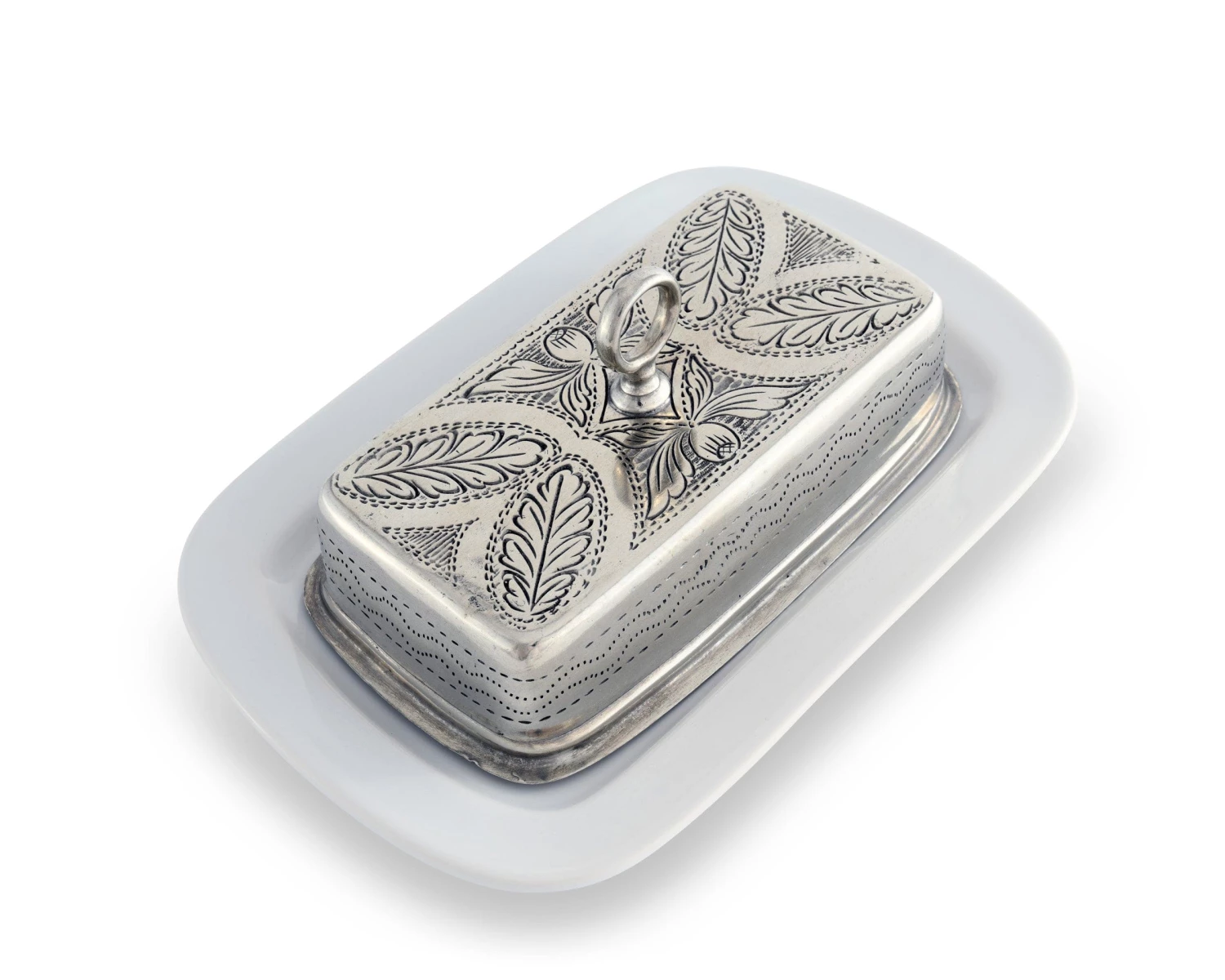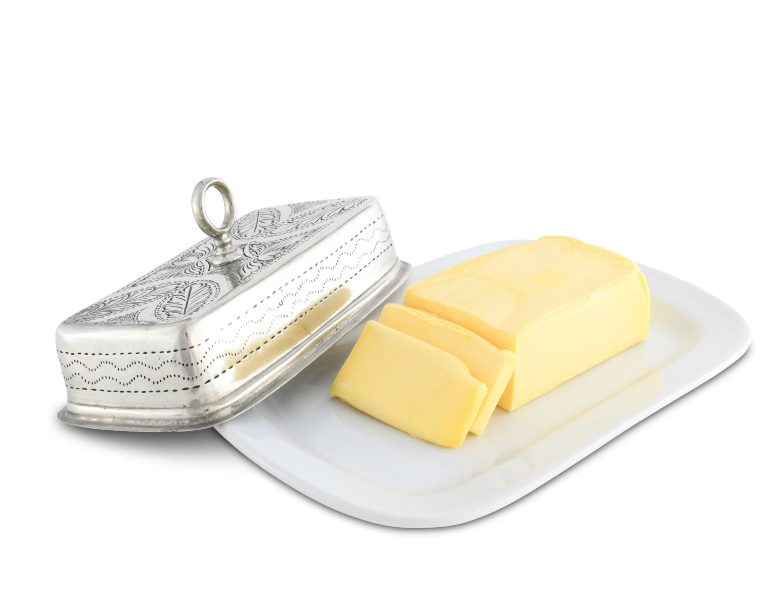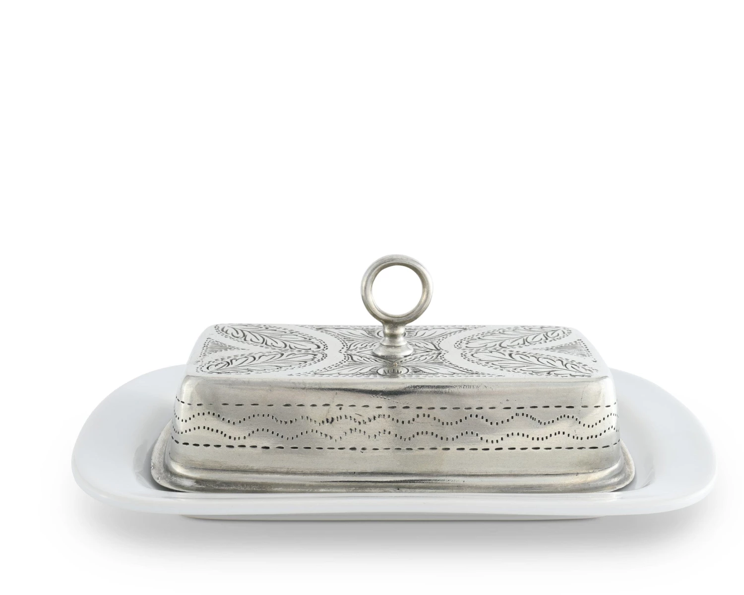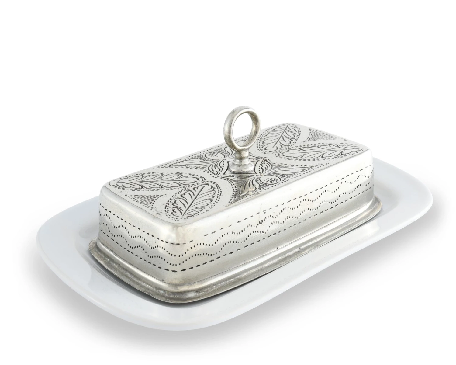 Add the romance of the South of France to your table with Vagabond House’s Provençal Style Butter Dish. The lid is patterned with an engraved, interpretation of stylized nature patterns found on traditional fine Provençal linens and features a classic ring handle. Created by our artistic designer, Helen Richard, the intricate but not overwhelming pattern is both classic and fresh. Light antiquing highlights the intricate details of the Provençal design. Decorative pewter lid tops a fine stoneware butter plate.