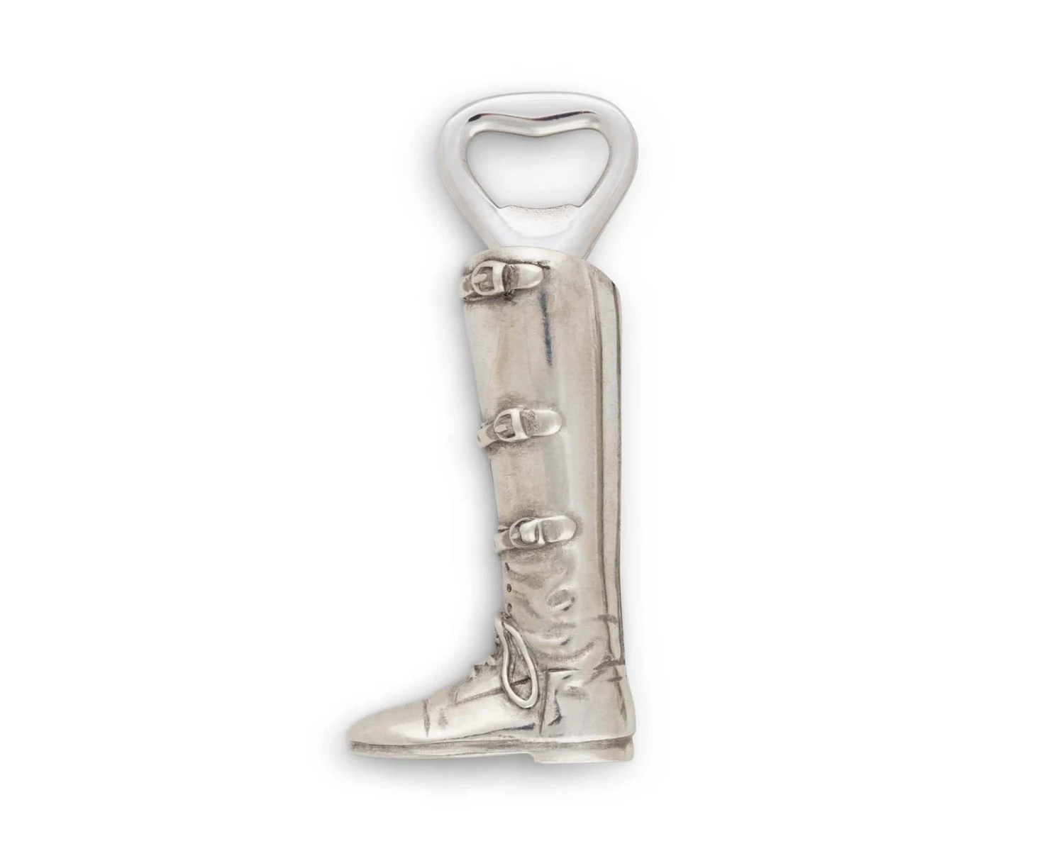 Vagabond House artisans captured the worn supple leather of a tall riding boot, laced, buckled and ready to ride again in the detailed pewter figural handle of the Riding Boot Bottle Opener. A sturdy stainless steel opener head is ready to work opening most any bottle that needs an opener. A great gift for any horse lover, a must-have for a well-appointed Equestrian theme bar, this detailed opener is beautiful and comfortable to use.