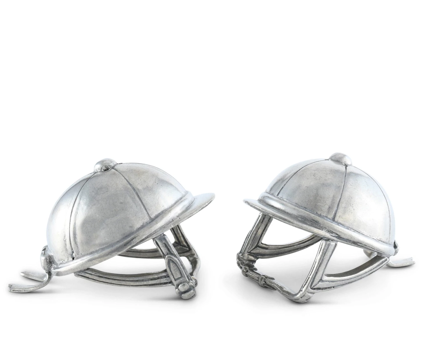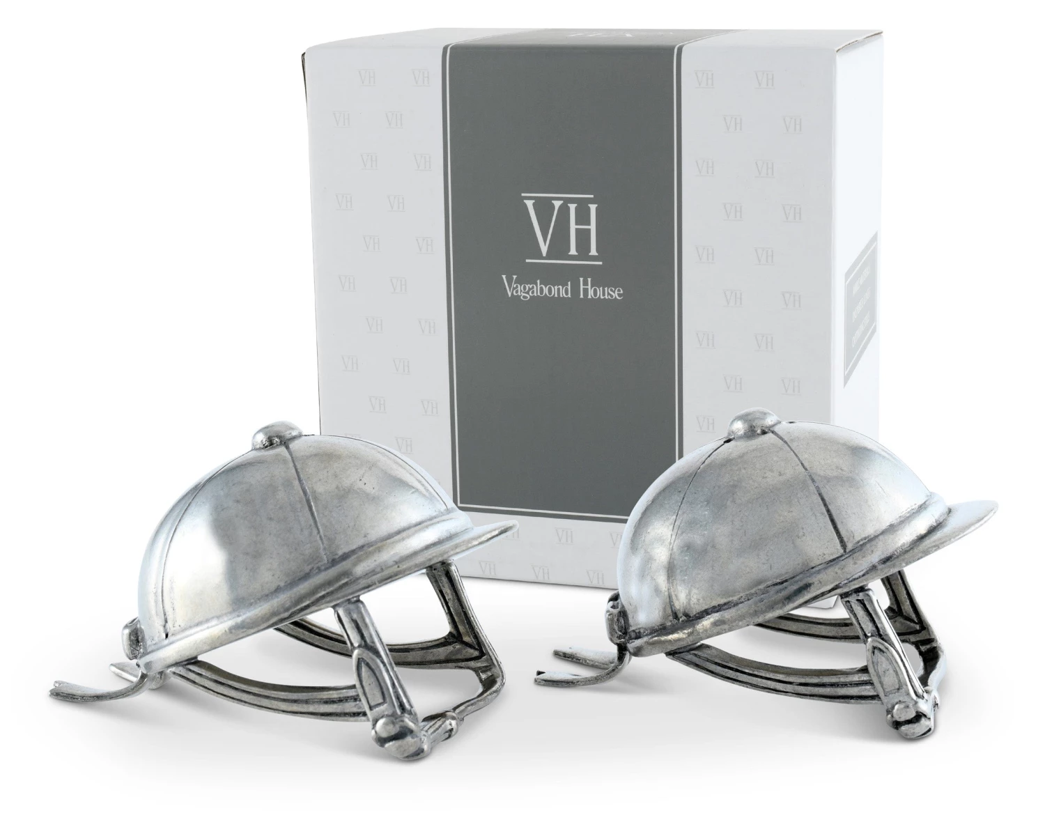 Exhibit your equestrian passion by adding Vagabond House’s Riding Hat Salt and Pepper Set to the table. Crafted in luxury-grade pewter, these helmets feature realistic chin straps, short brims and decorative bows on the back. The shaker holes surround a button at the top of both designs, while deep lines represent each hat’s reinforced shell.