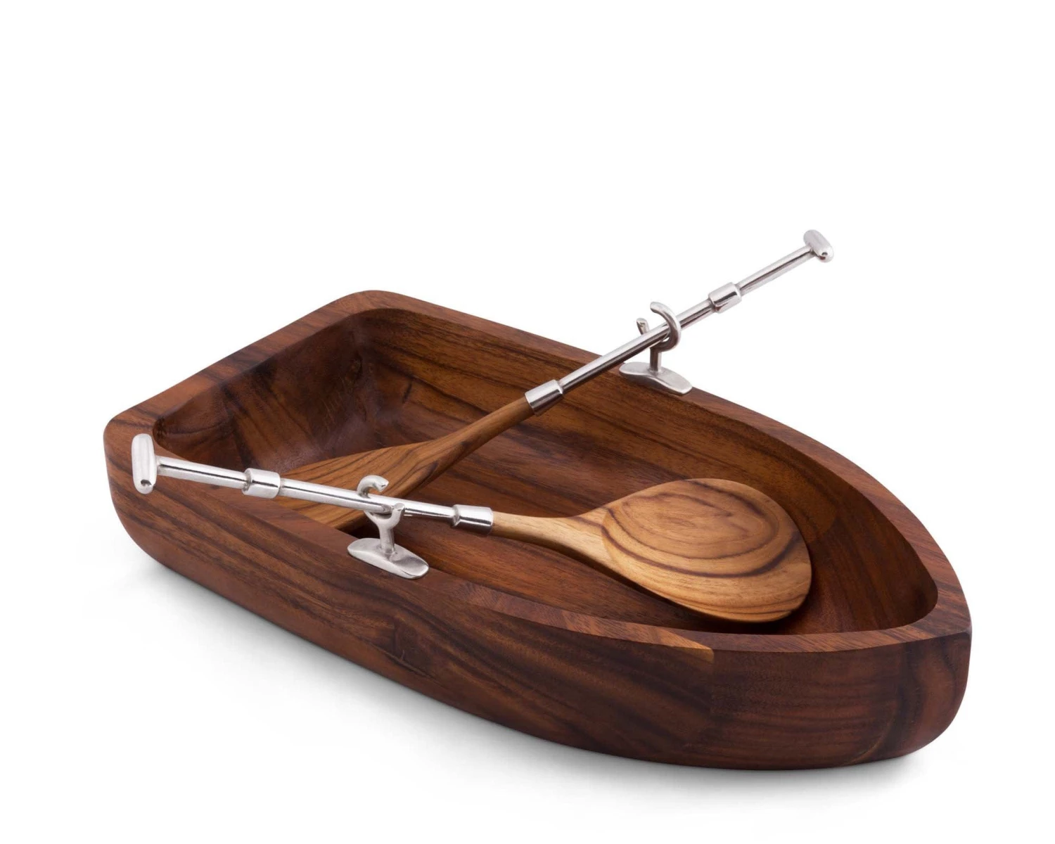 Row, row, your boat down a river of romaine when you serve salad in Vagabond House’s unique Rowboat Salad Serving Set. The salad boat is hand-crafted Acacia hardwood. The set includes a pair of matching salad servers imagined as the oars for the rowboat, with pewter handles and fittings.