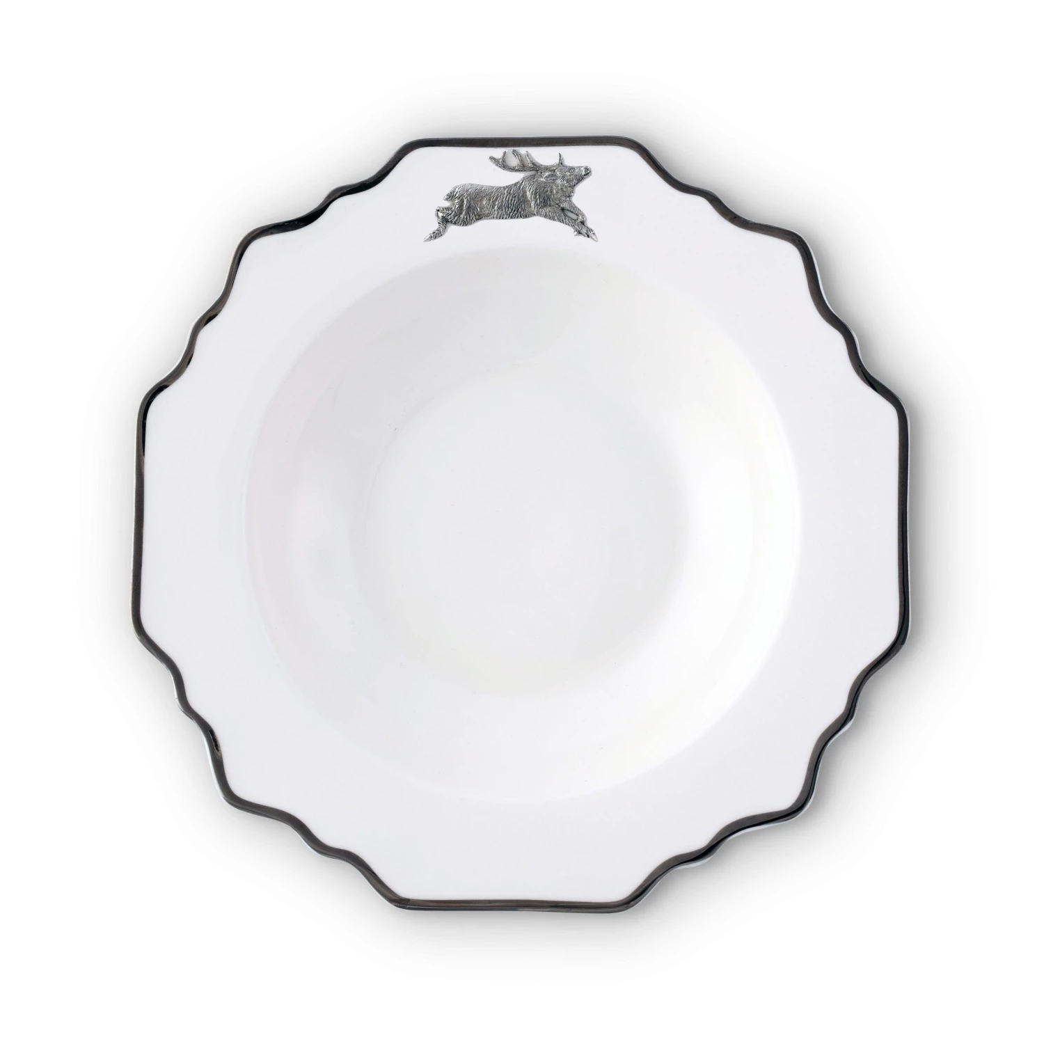 Serve elegant creamy soups in this finely detailed bone china soup plate. An engraved silver elk decorates the scalloped edge of the soup plate, showing off his majestic rack and powerful form to the delight of guests.