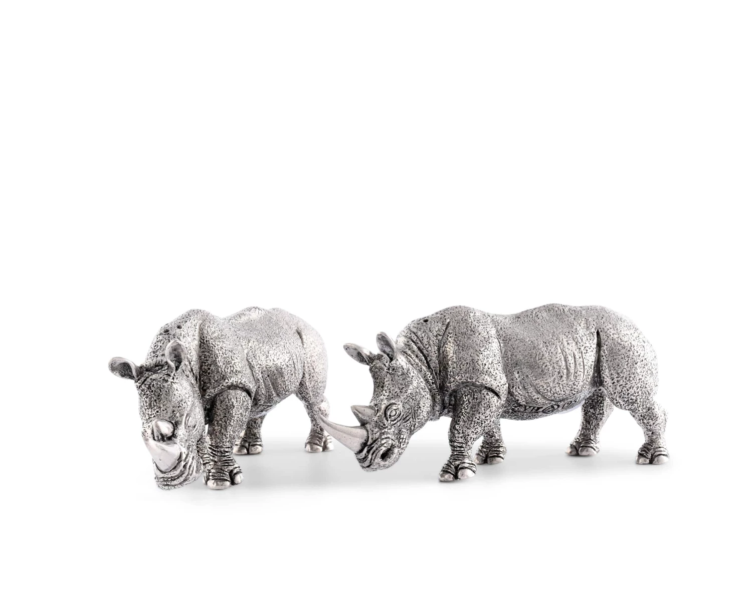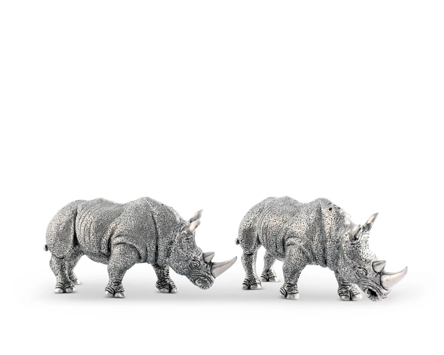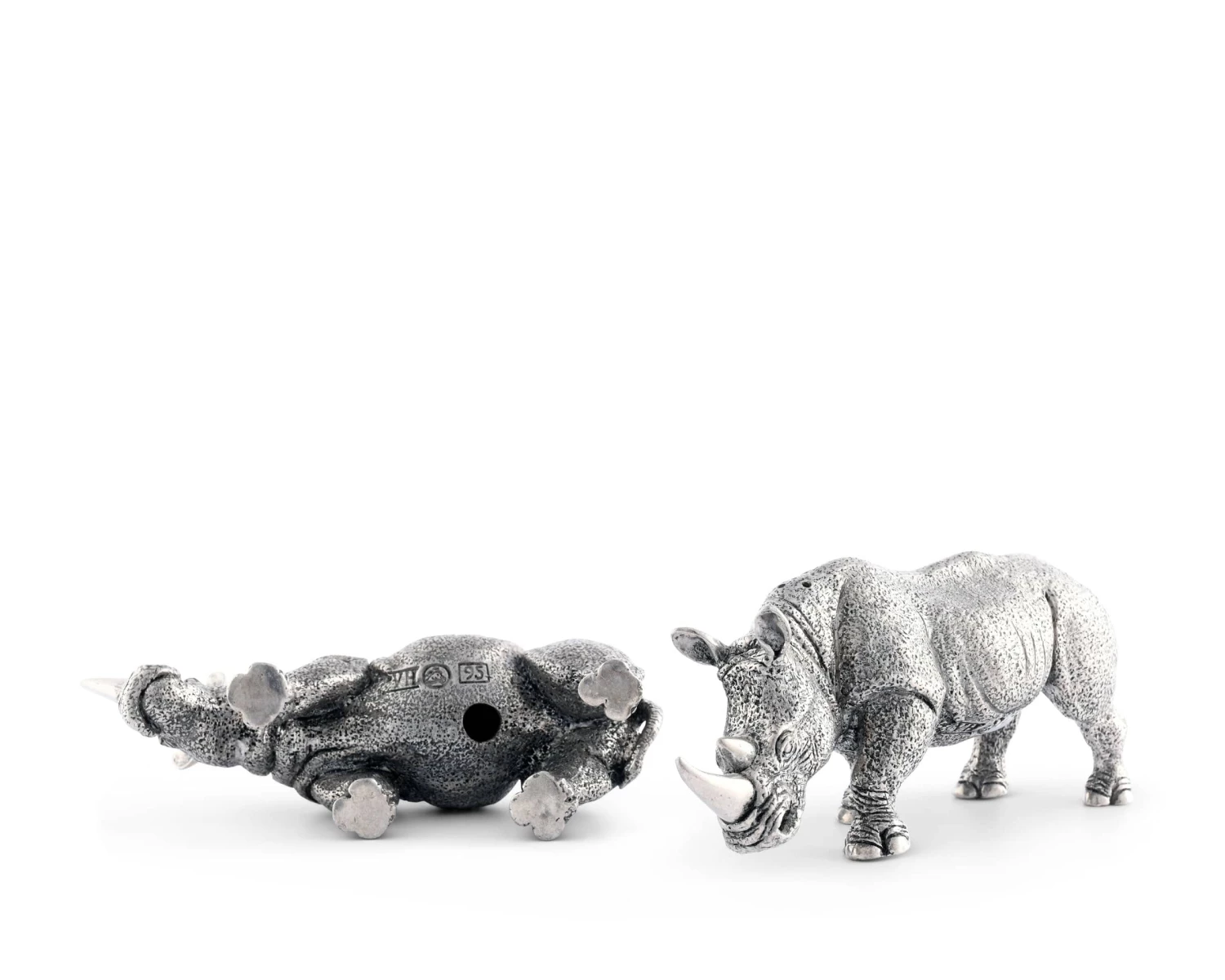 Featuring amazingly realistic, intricate detail on the statuette shakers, Vagabond House’s pure pewter Black Rhino Salt & Pepper Set presents a pair of proud black rhinoceros. A critically endangered species, the black rhino has wandered Africa since pre-historic times. For some fun trivia to spark conversation when you serve with this set of wild things, a group of Rhinos is properly called a “crash” of Rhinoceros. We are sure that if these Rhinos crash your party, everyone will talk about them.